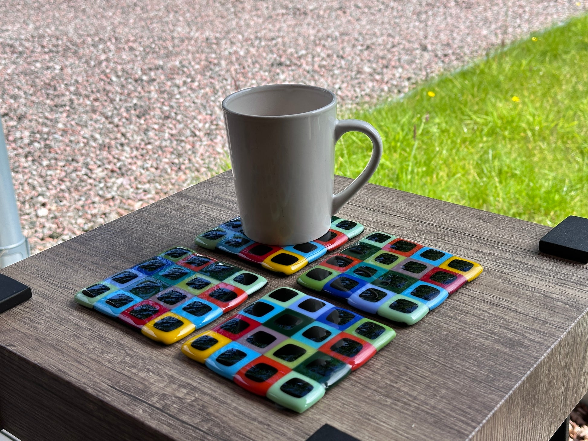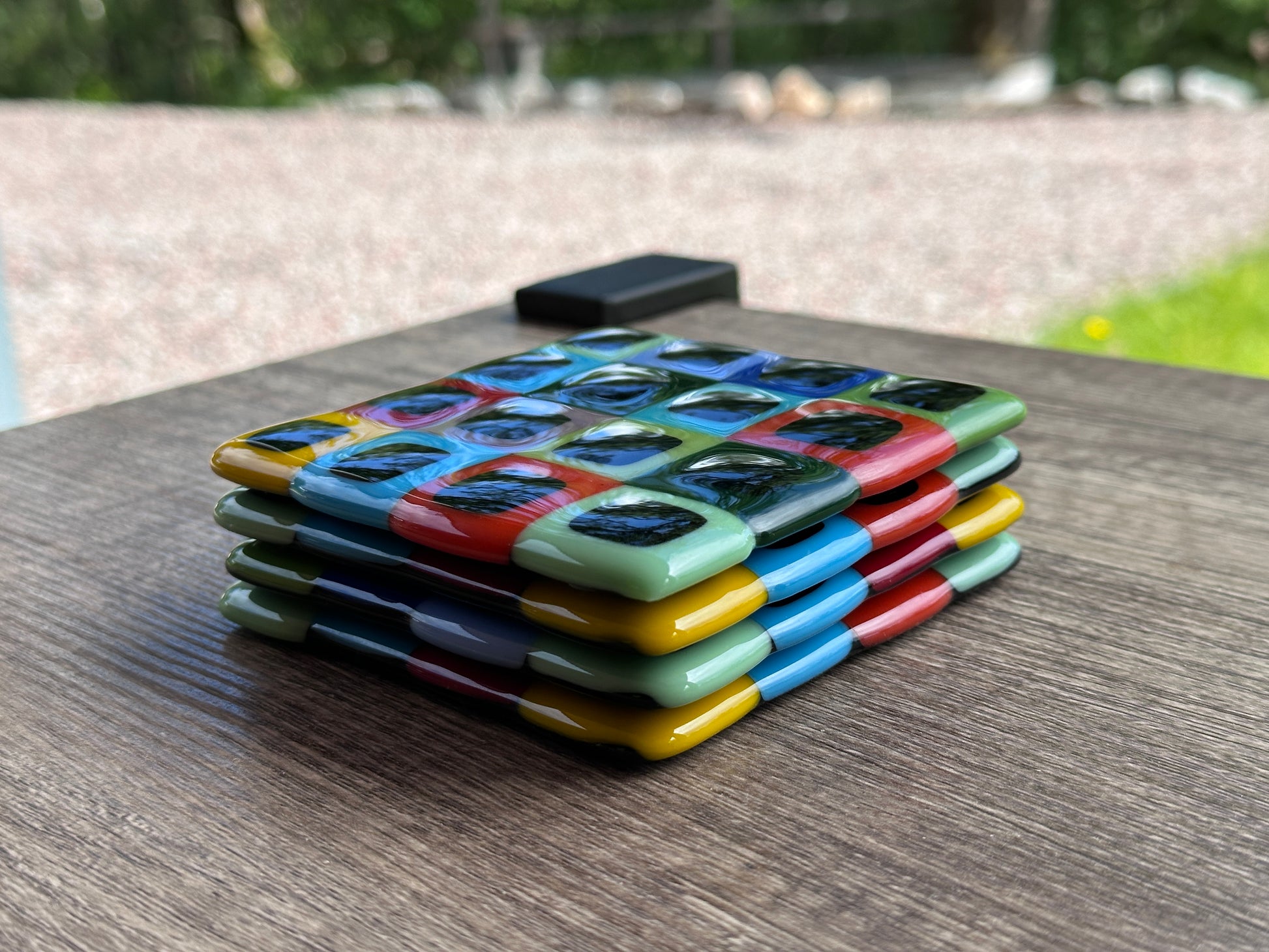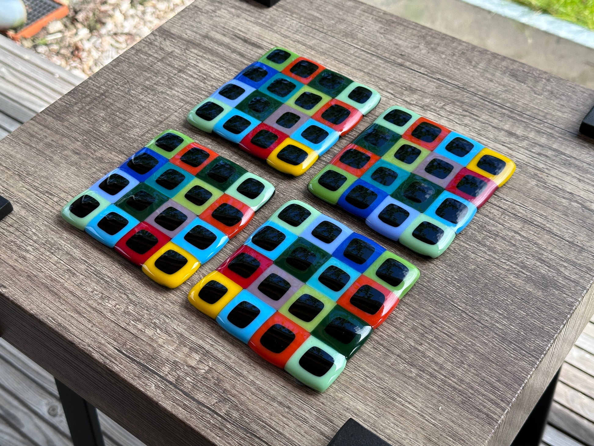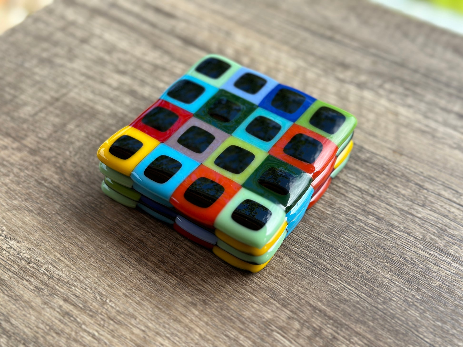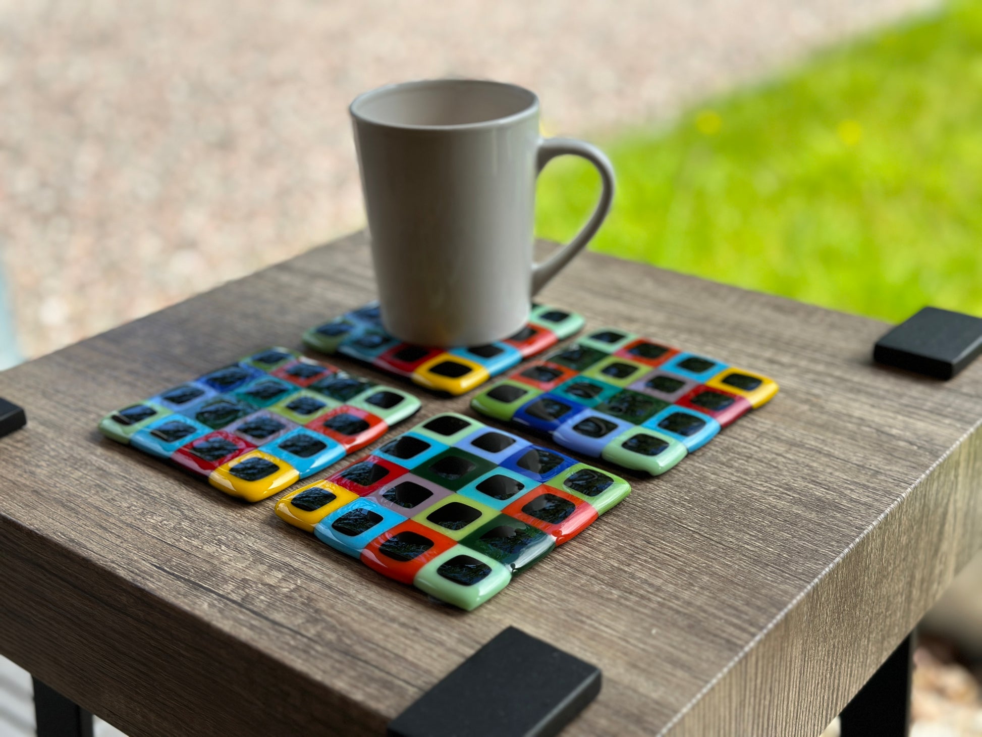 Each coaster is made from individually hand-cut pieces of glass that are layered on a single base piece of glass. The base color is often the same color as the top accent-color layer. The random placement and use of colors ensures each set of coasters is unique. The pictures show representations of the designs. The assembled glass pieces are then kiln-fused up to a temperature of 1450F to create a single piece of glass.