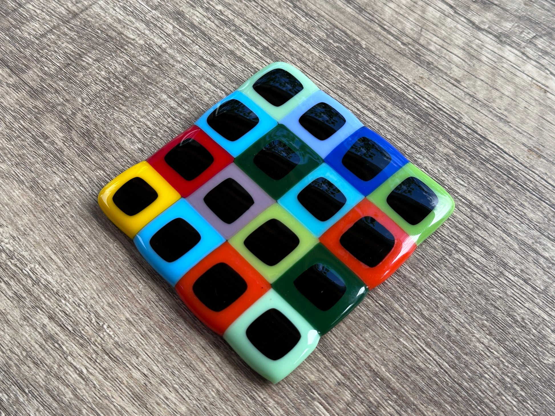These Araby coasters are created with layers of square pieces of glass. Up to sixteen different colors are sometimes used in one piece that reflect the changing tones of the surrounding hills and mountains and the flora and fauna found in the area.