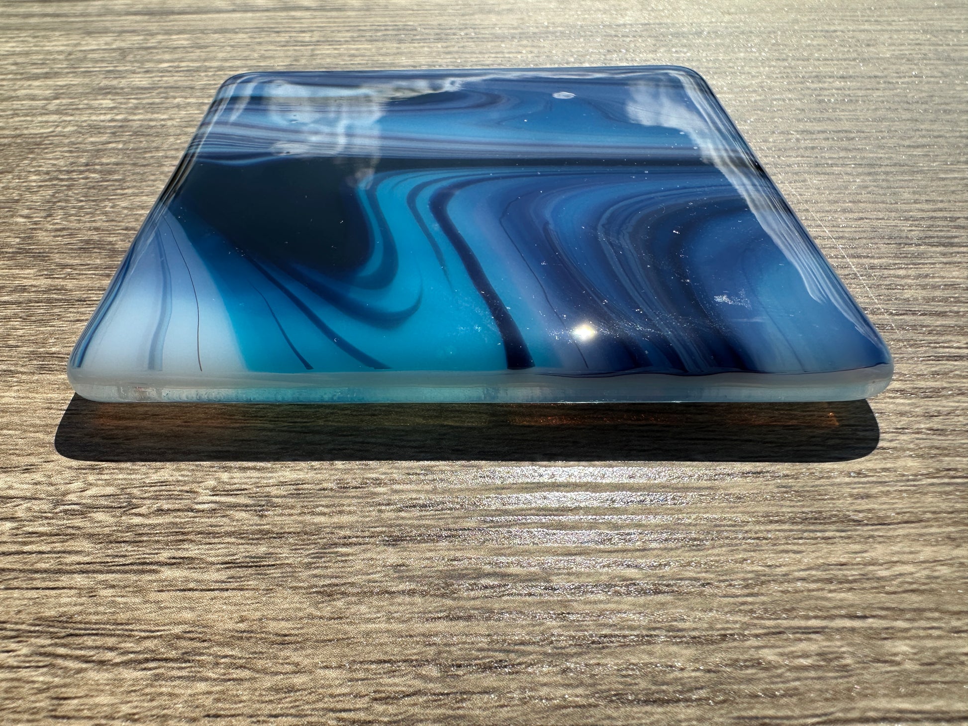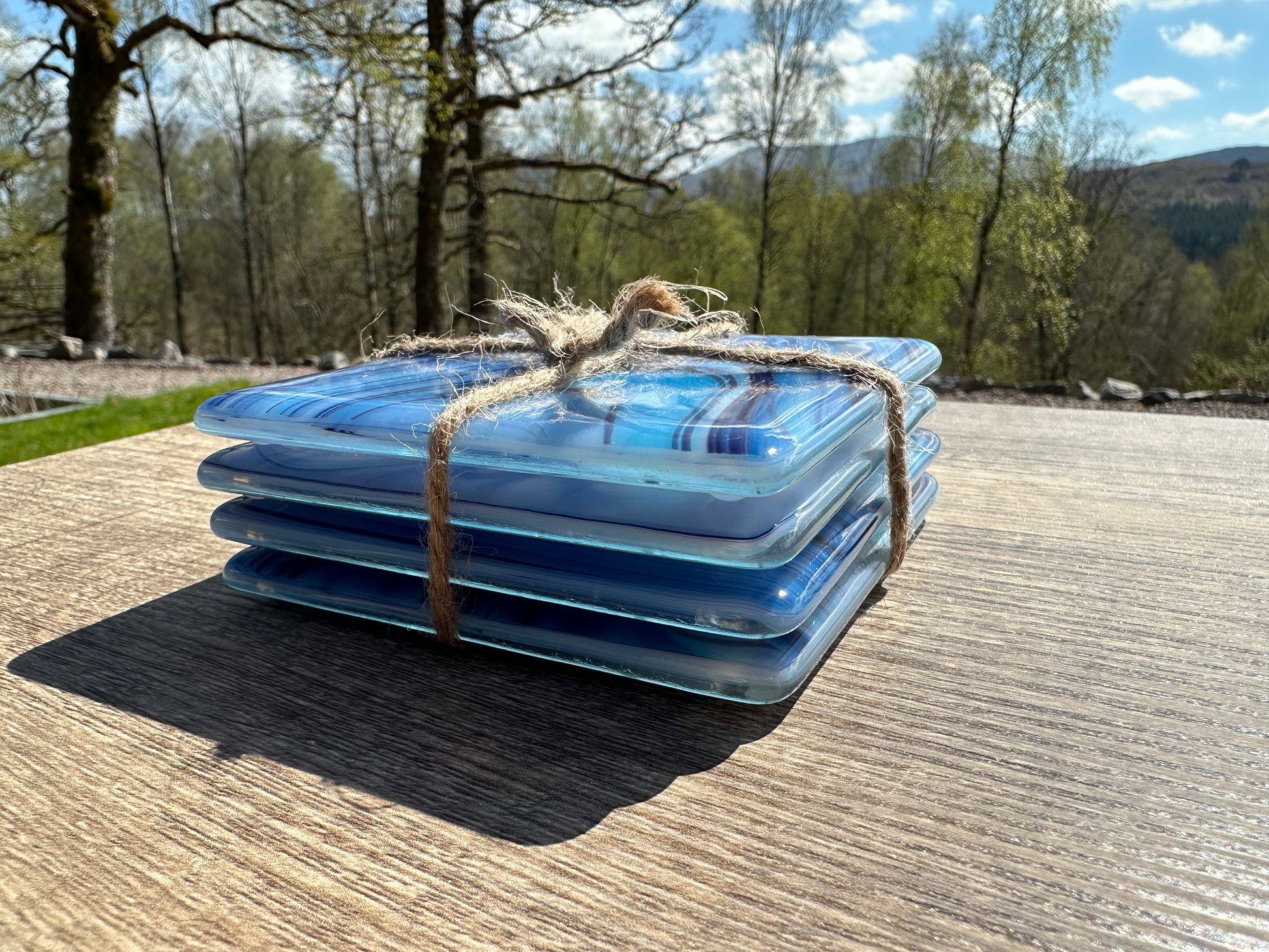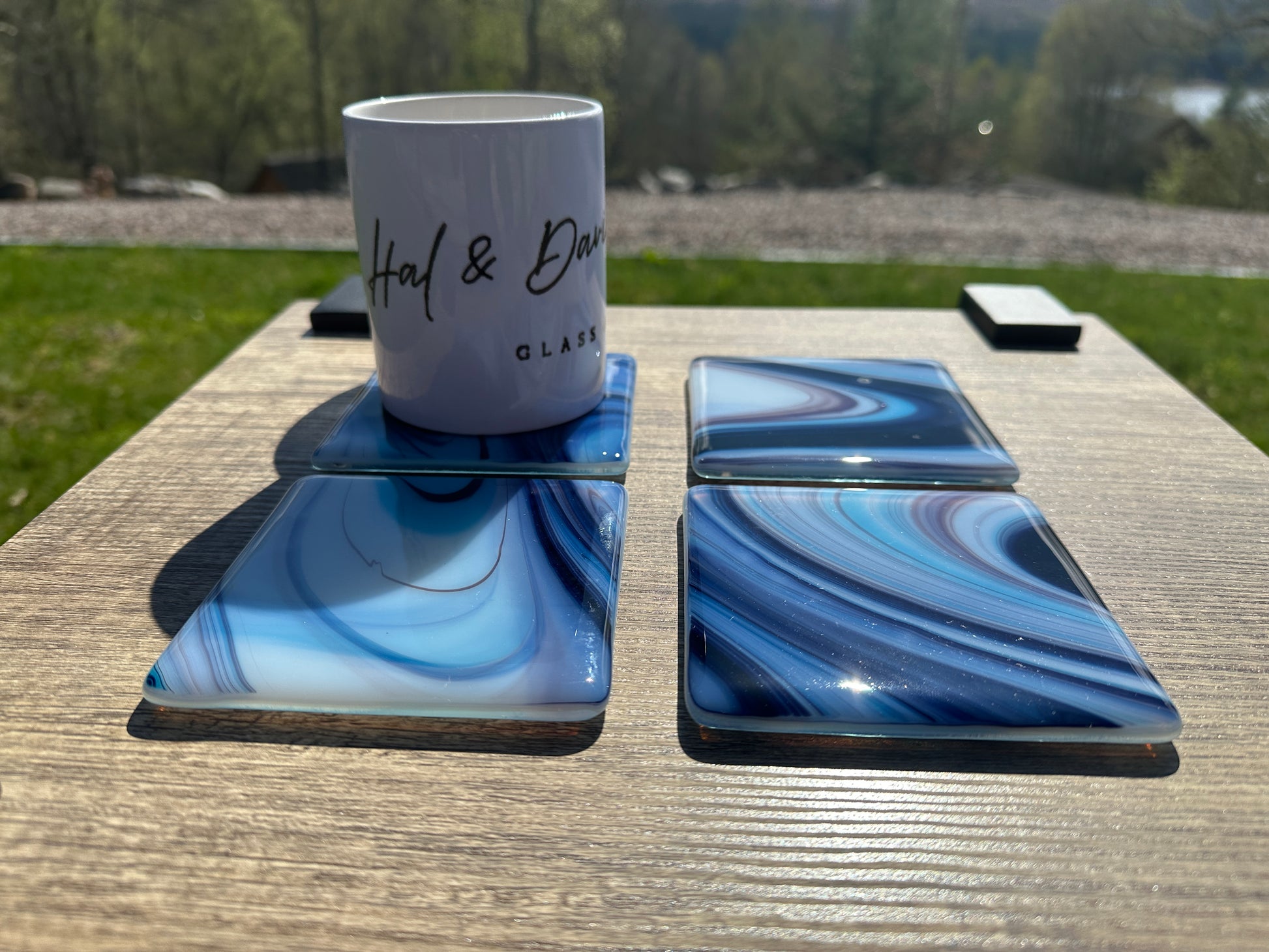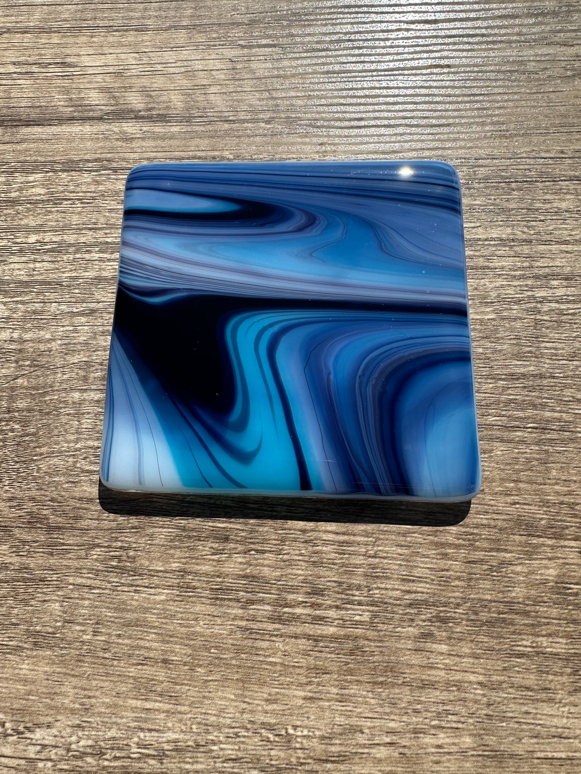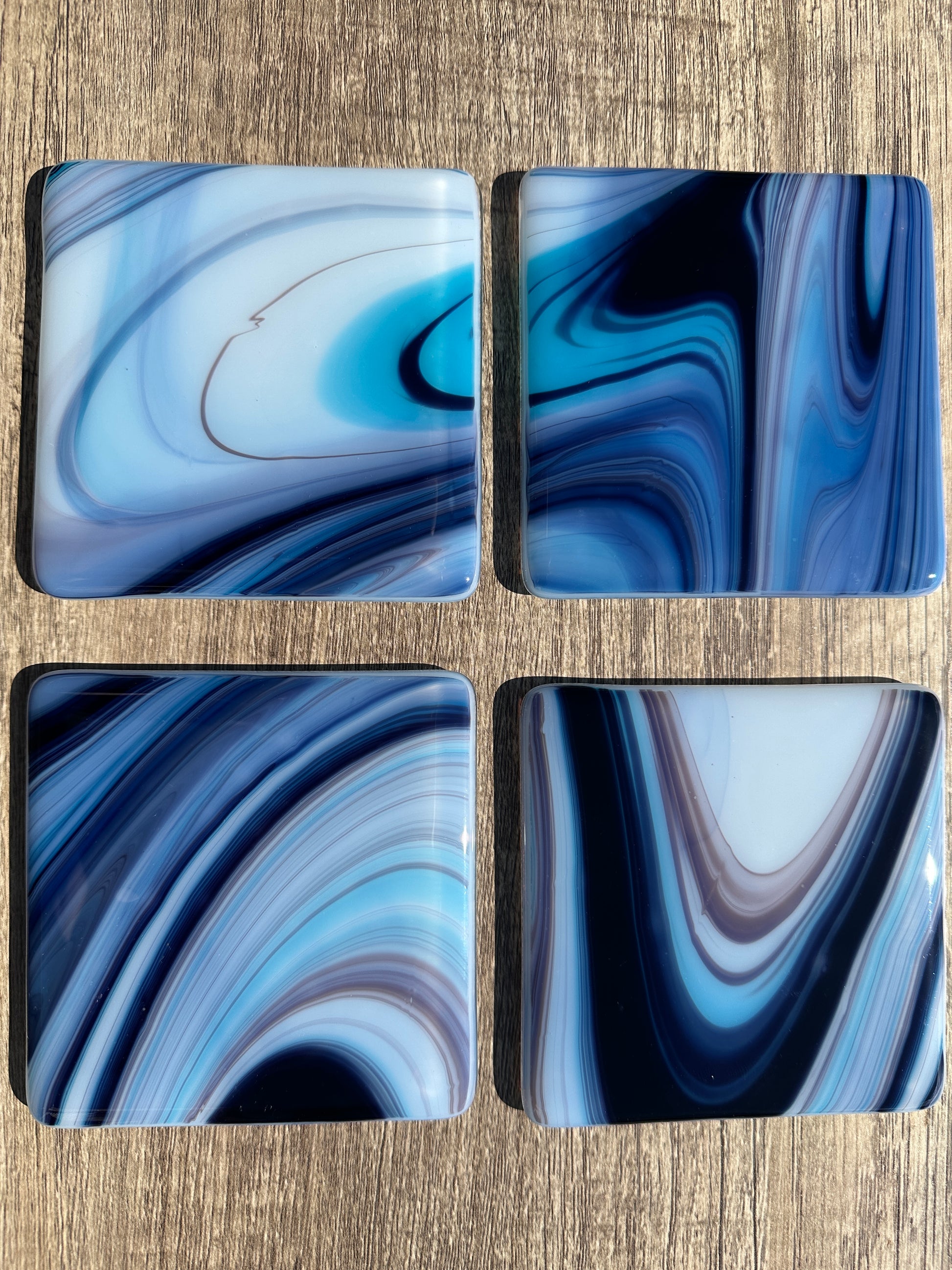 These brightly coloured coasters are created with beautiful sheet glass in a vivid pattern of blue and white swirls - the pattern in each coaster is unique. These coasters are certainly eye-popping and will add a splash of colour and energy in any setting.