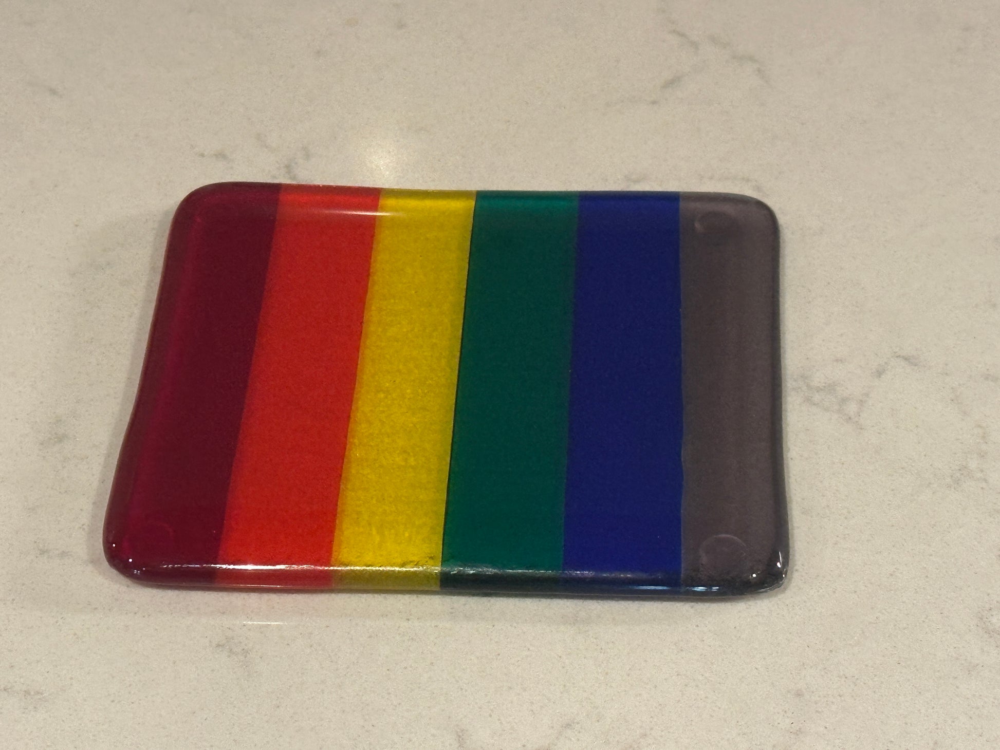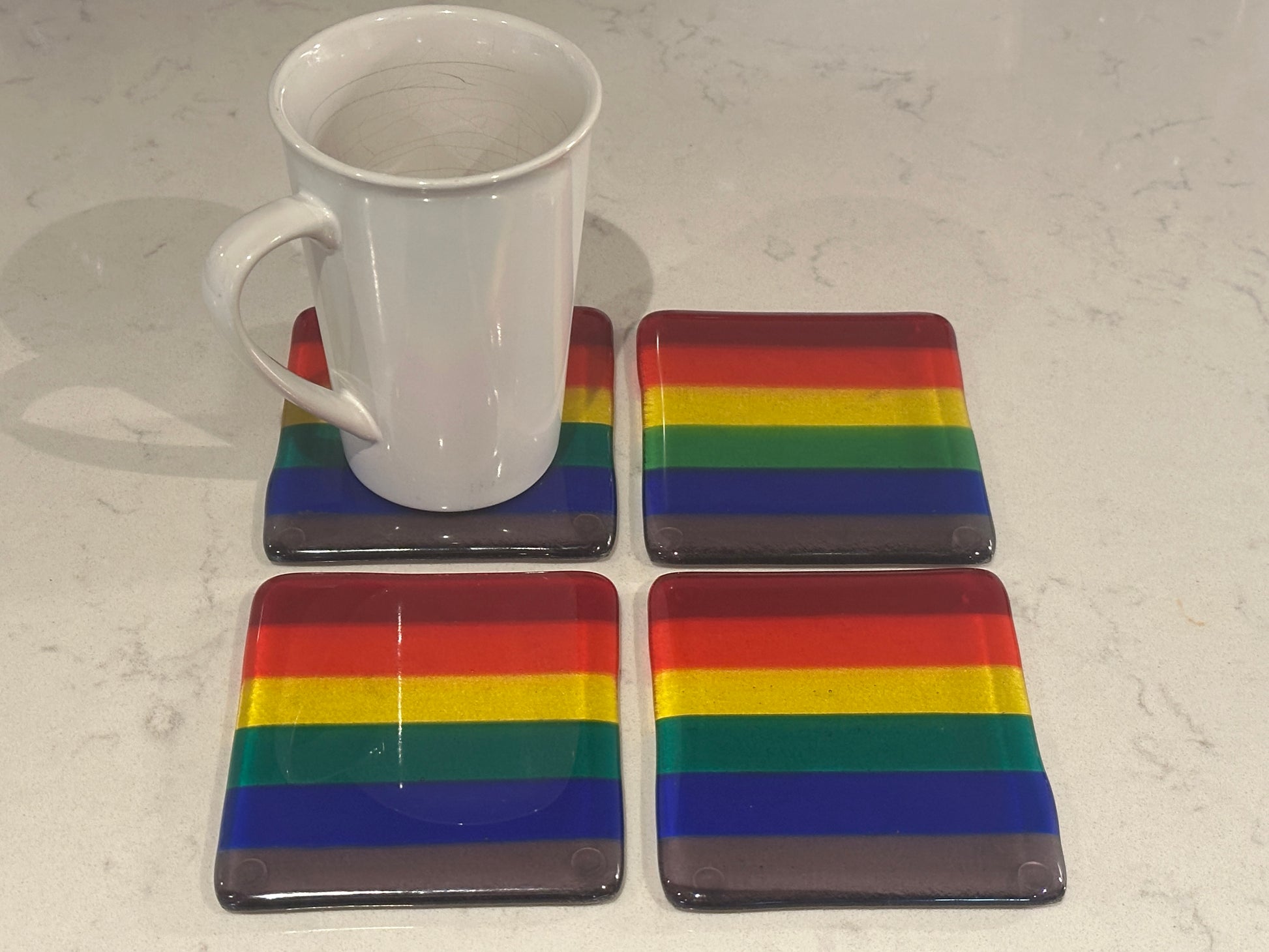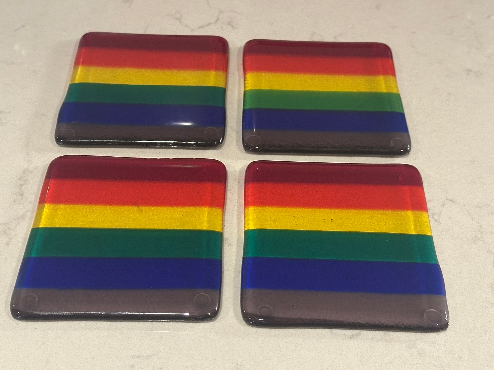 Bring the beauty of rainbows into your room with these distinctive coasters. Each coaster is hand-made with individually hand-cut strips of coloured glass laid on a sheet of clear glass and fused together in the kiln into one single piece.