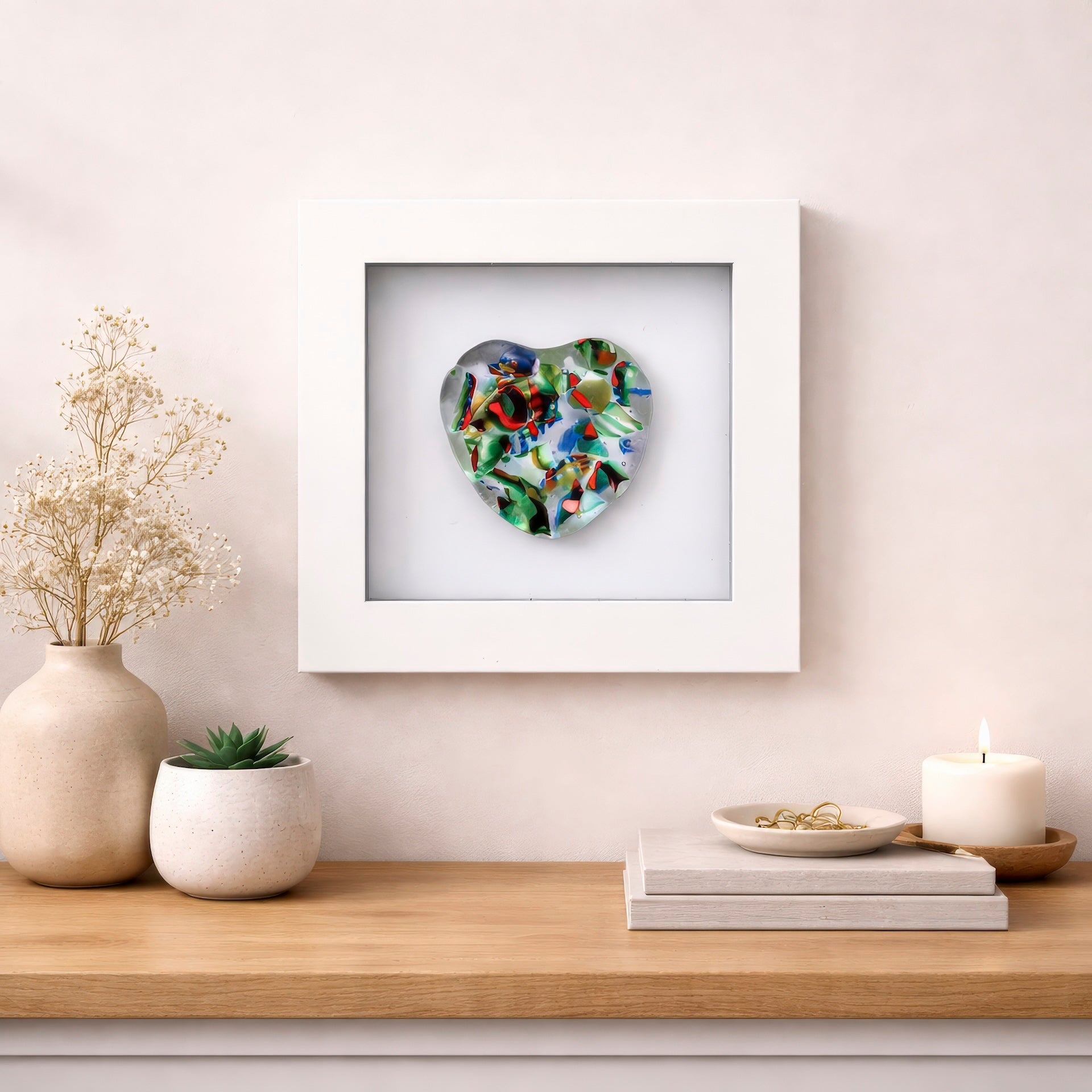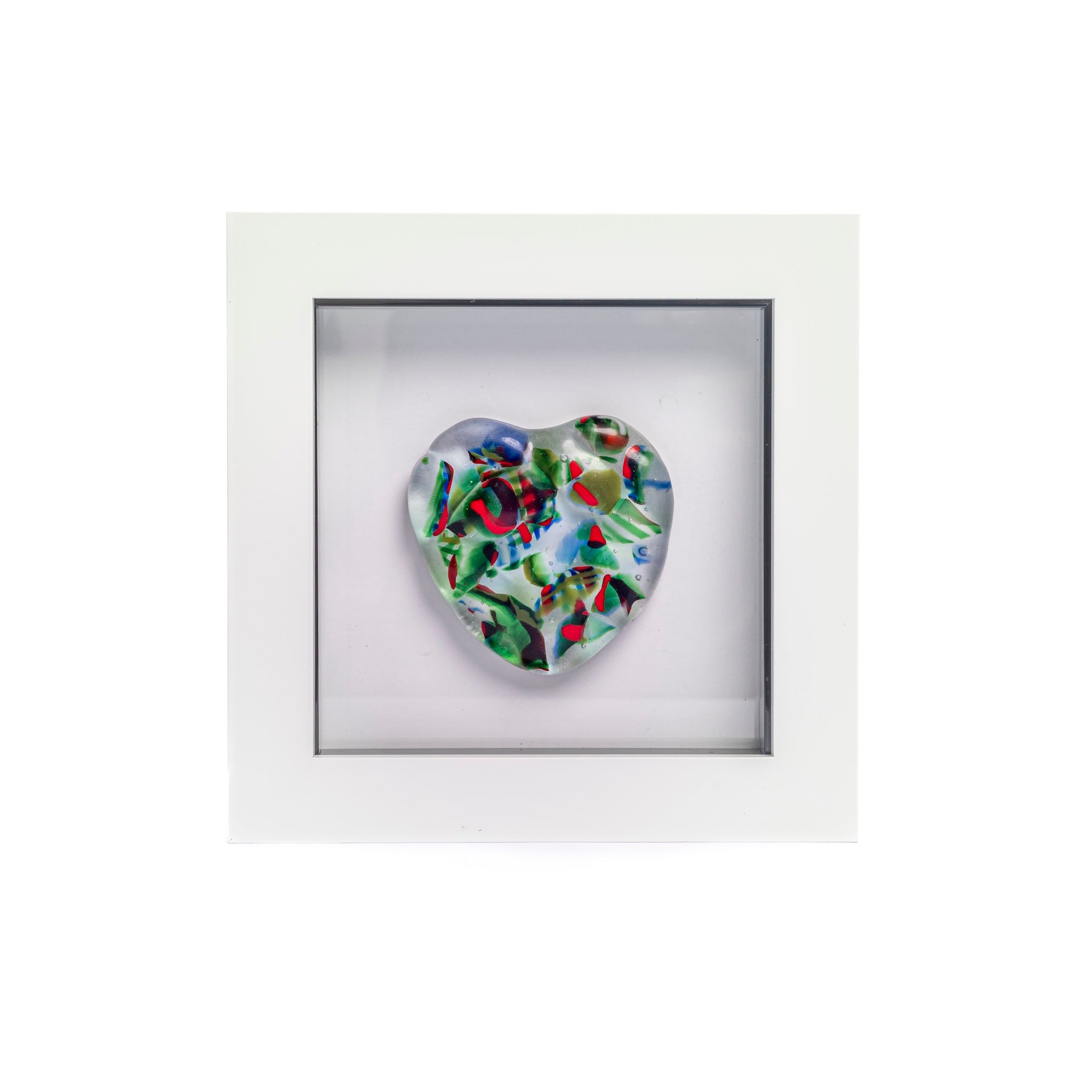 These fused glass hearts are "lightly baked" in our kilns to give a textured feel. They come in three different sizes, small, medium and large, and are framed.