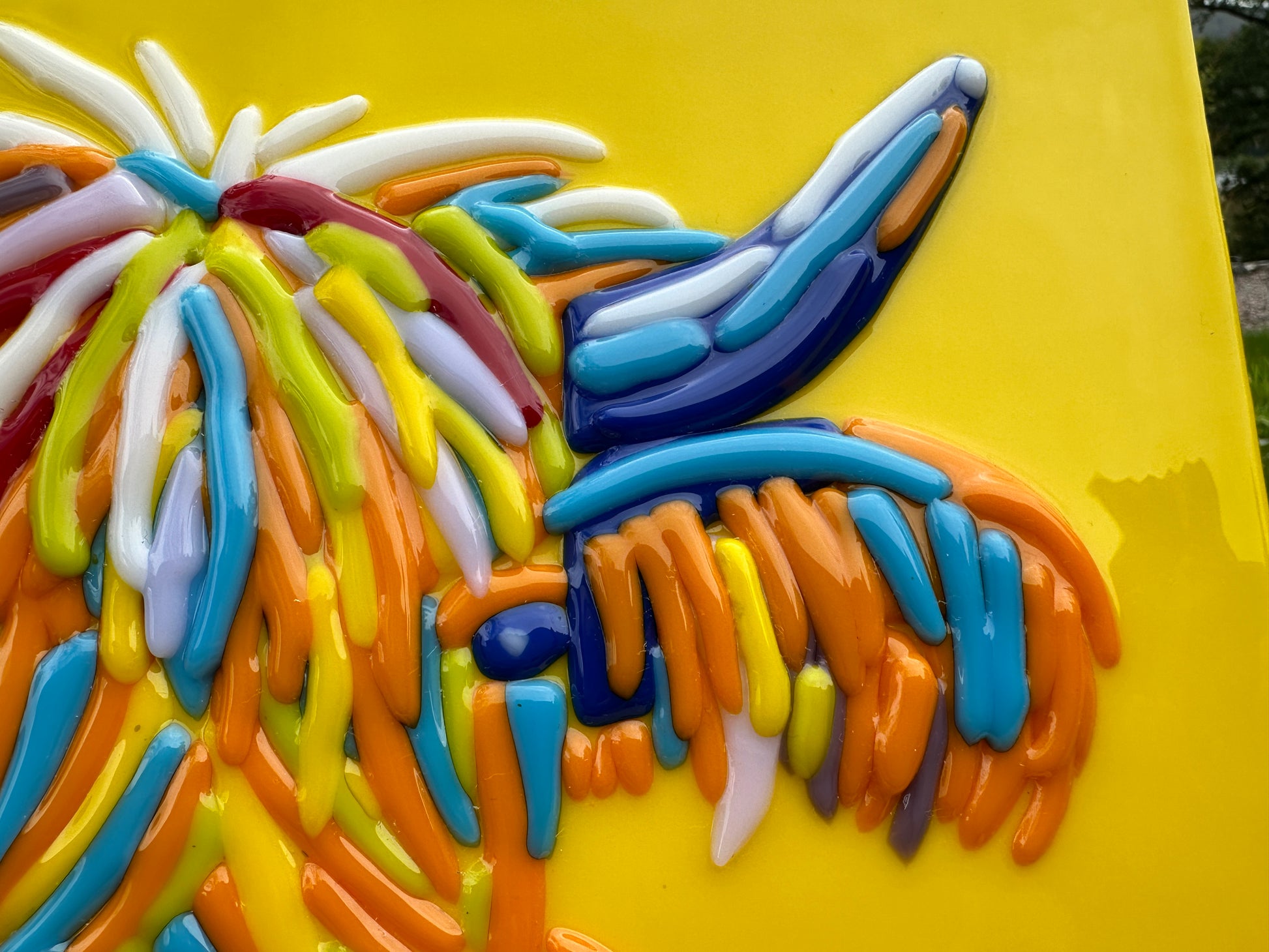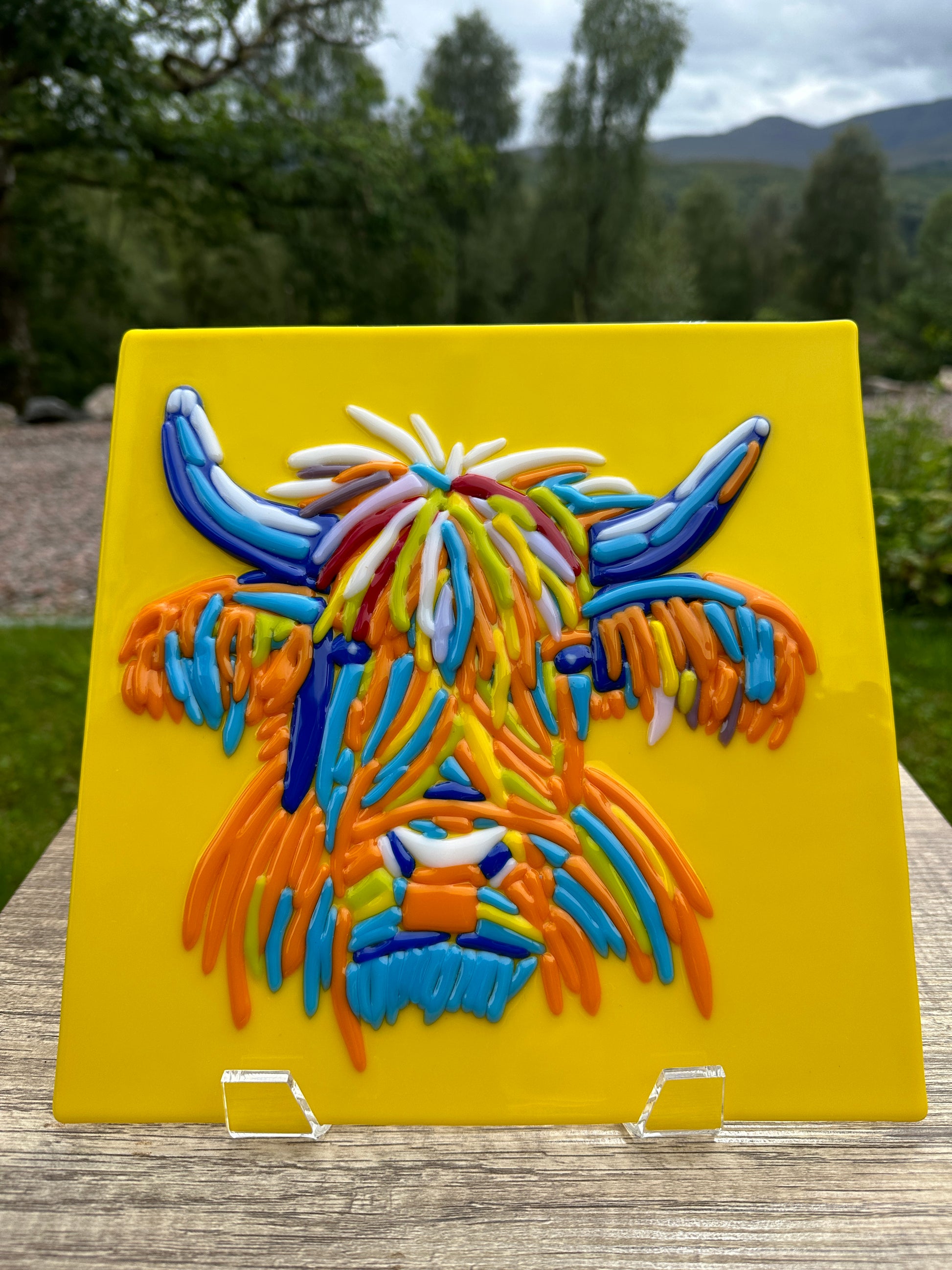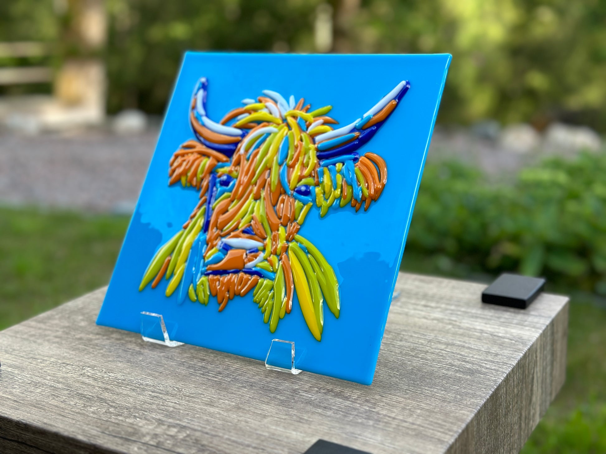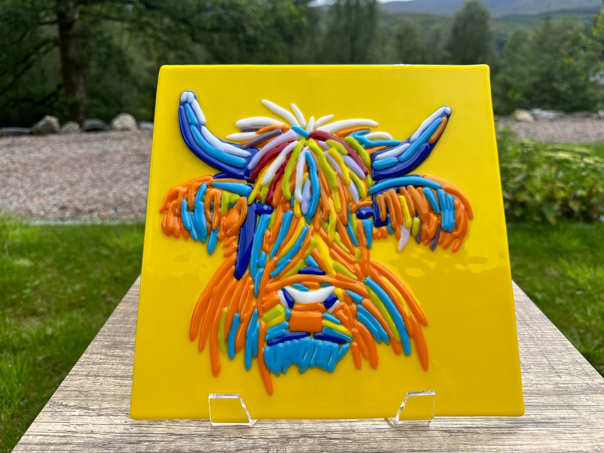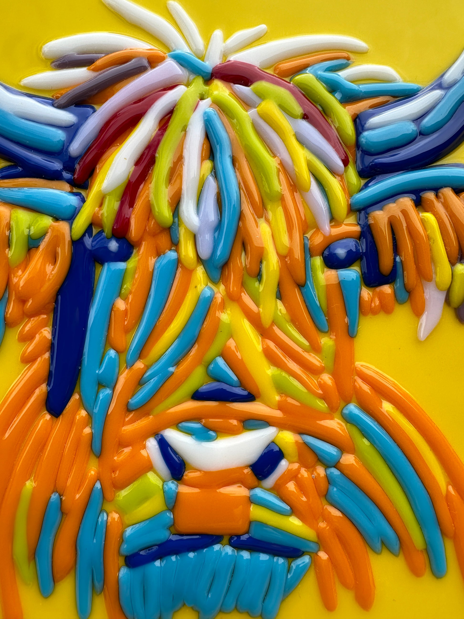 Fused glass portrait of a Highland Cow. This is a bright, colorful and fun piece of a "hairy coo," as they say around here!