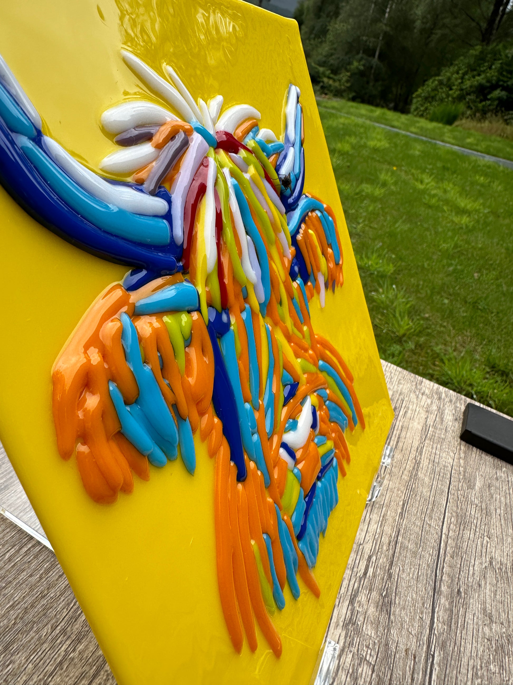 The portrait measures approx. 25cm x 25cm, (10" x 10") and is made from strips of hand-cut pieces of glass laid on a single piece of sheet glass. The pieces are layered that help give a little depth to the picture. The glass is fired at a lower temperature in the kiln that gives the final finish a textured feel and the shaggy look of a hairy cow.