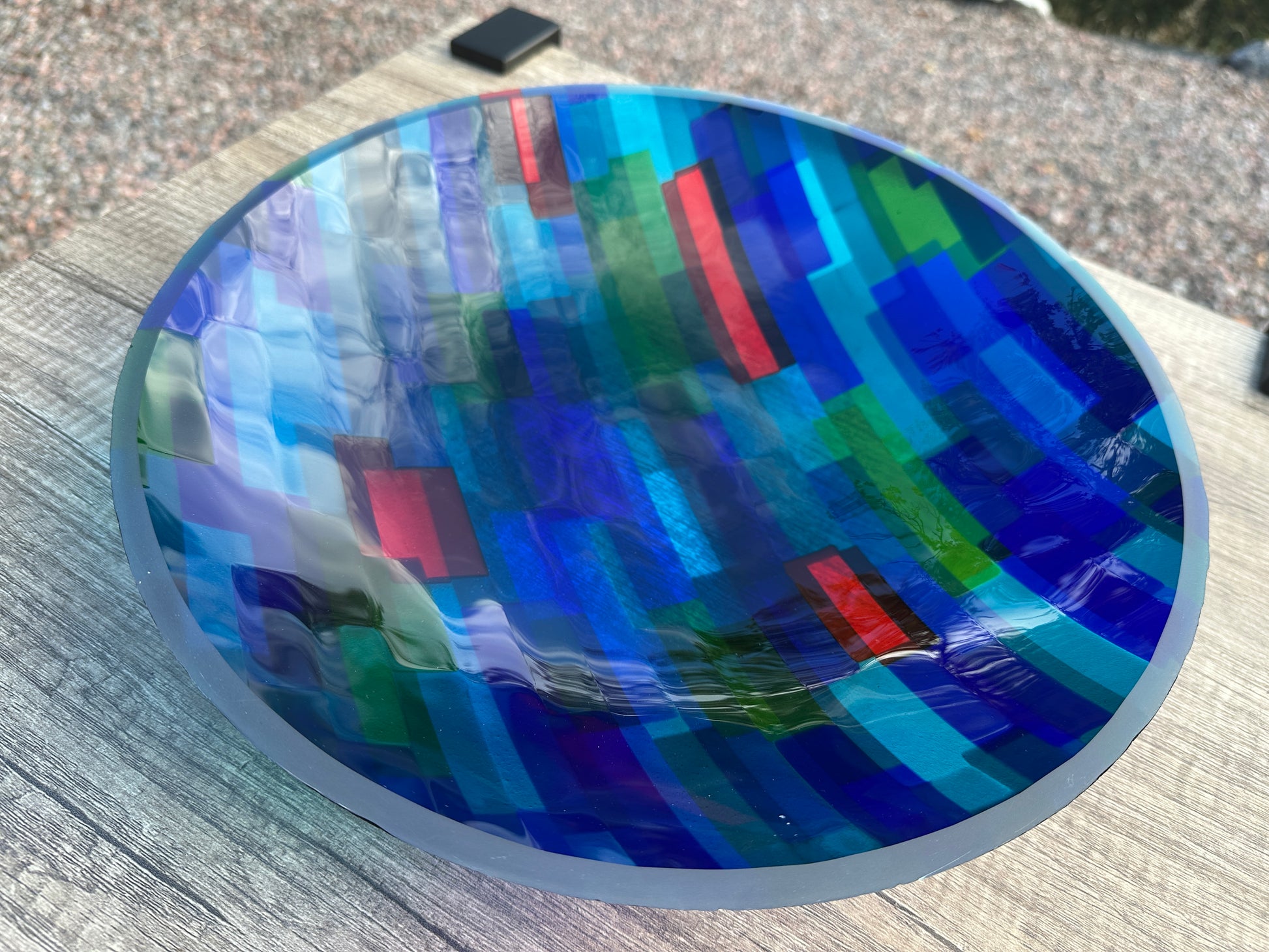 This beautiful large-size bowl has a modern design of mixed blue oblong forms, with green and red accent strips, that make it a beautiful and captivating table centre piece. The two layers of overlapping colours create different hues as the bowl casts its colourful shadow upon its setting. The rim has been hand-ground and polished to a matt finish and the flat surface reveals the depth of the coloured glass pieces.