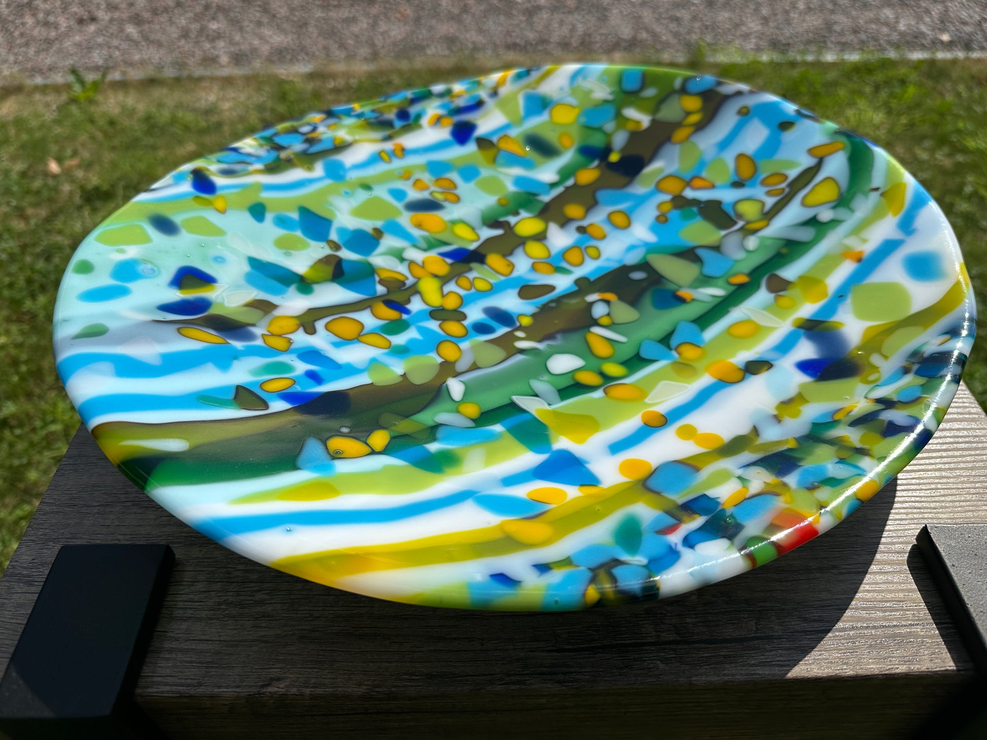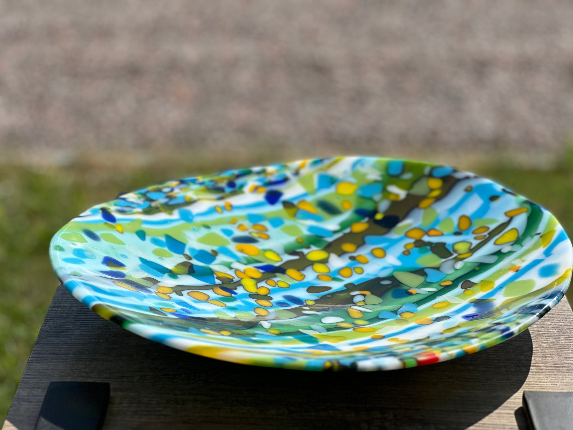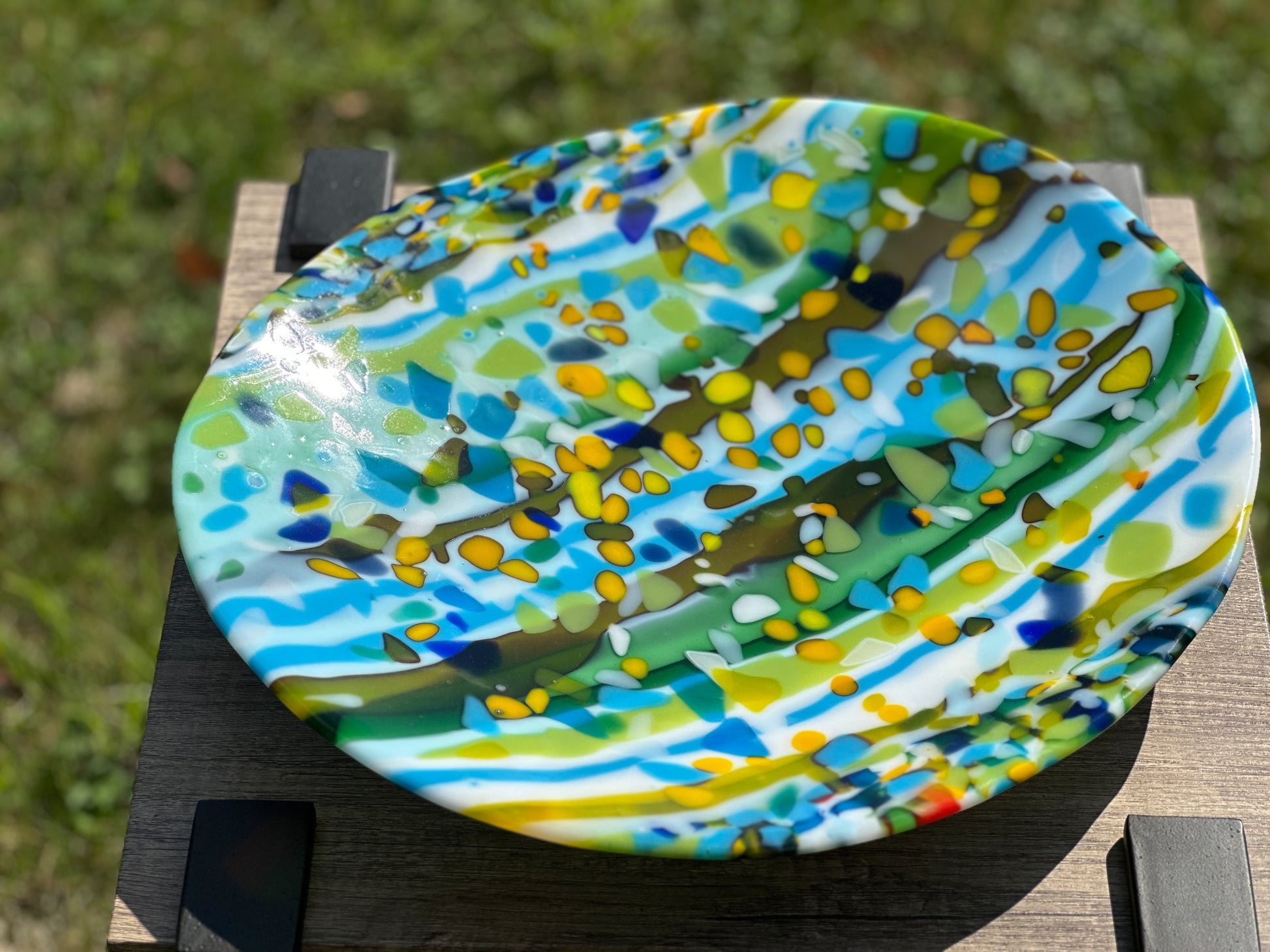 The bowl weighs approx. 102 oz. It is made from many layers of coloured glass which is formed into a small "pie" of solid glass. This "pie" is then re-heated at very high temperatures over many hours so that the glass flows and spreads out to form a larger shape. Further glass is added to give more patternation and fused in the kiln again before a final time in the kiln to form the bowl shape.