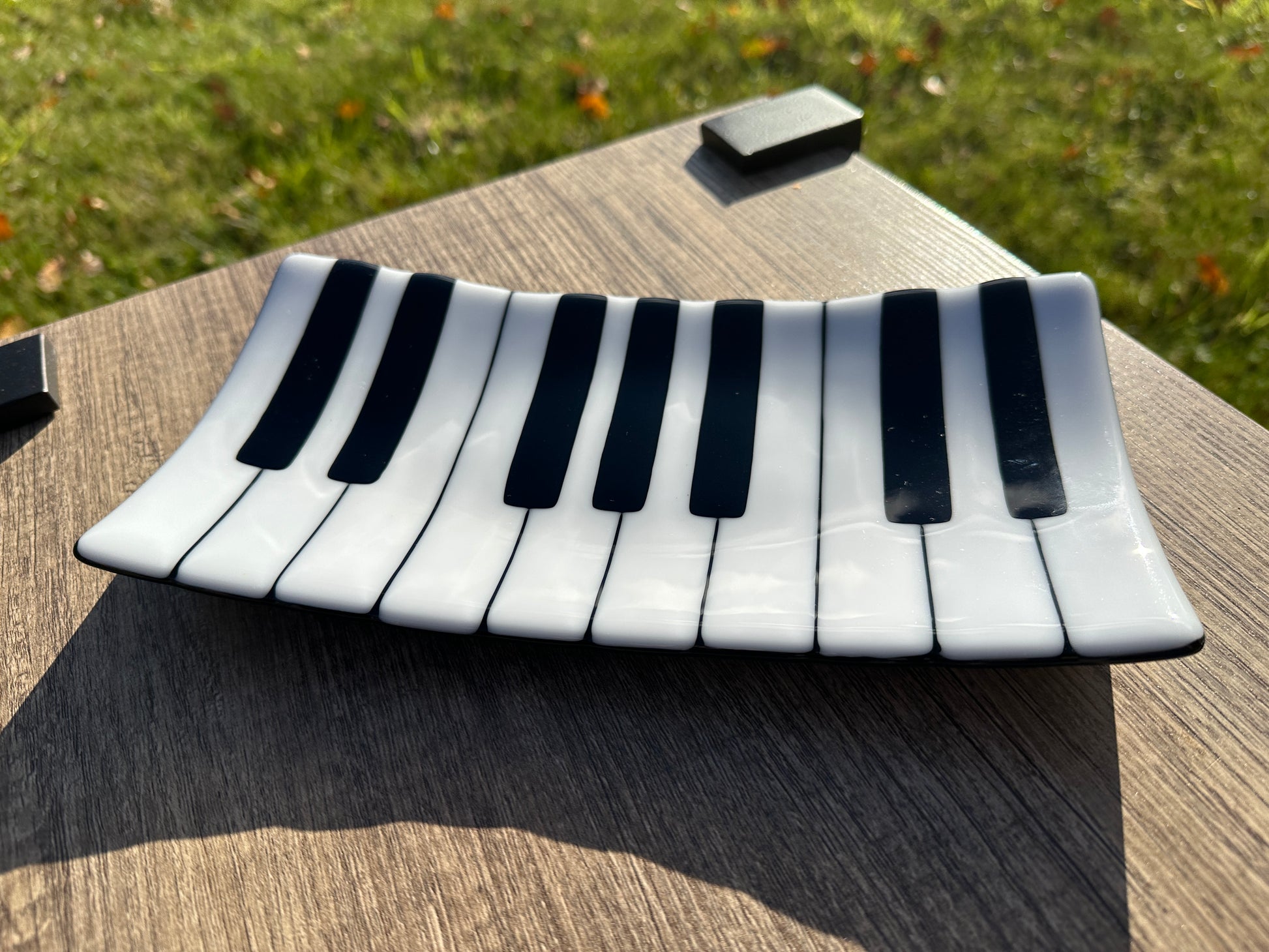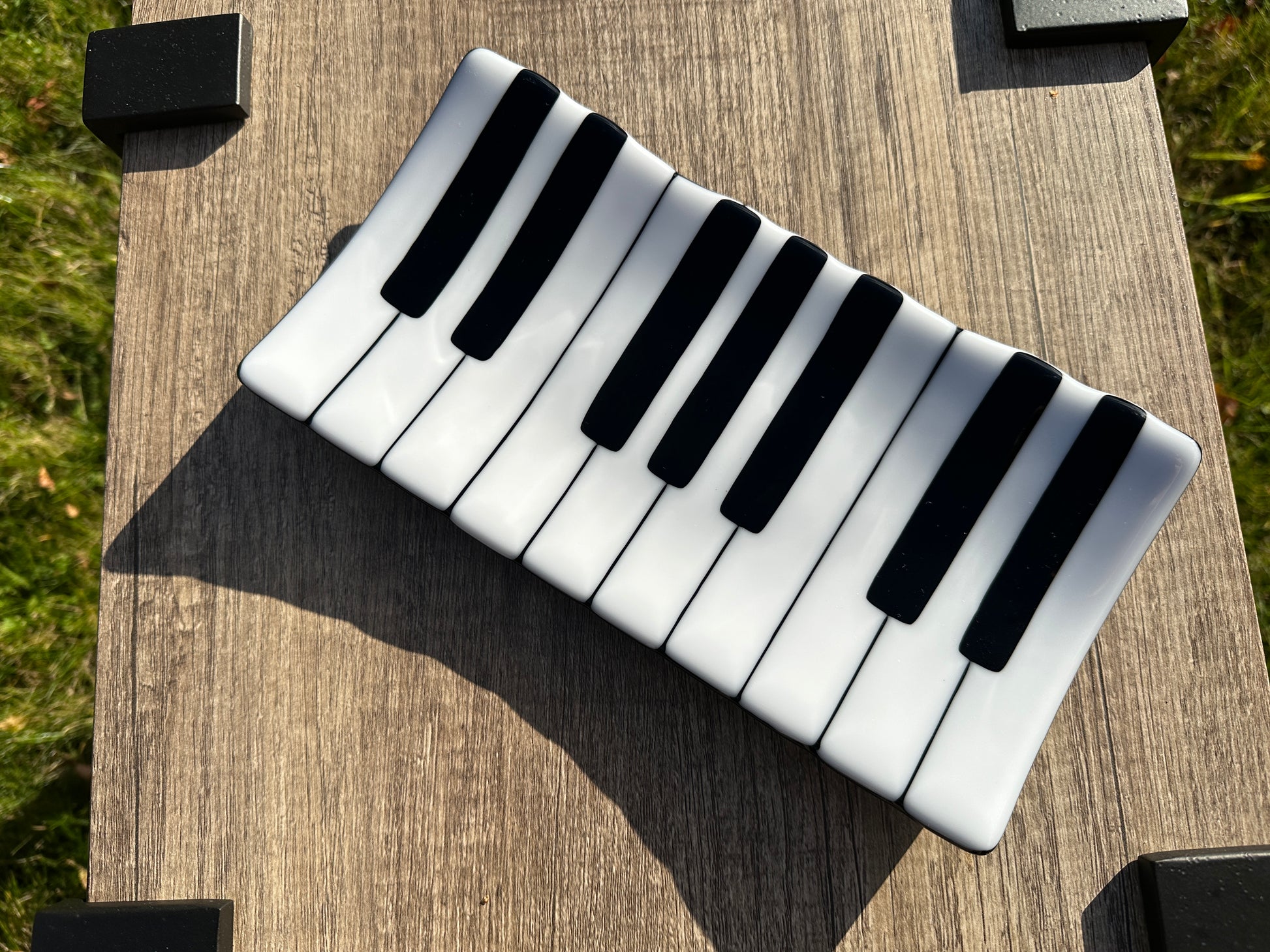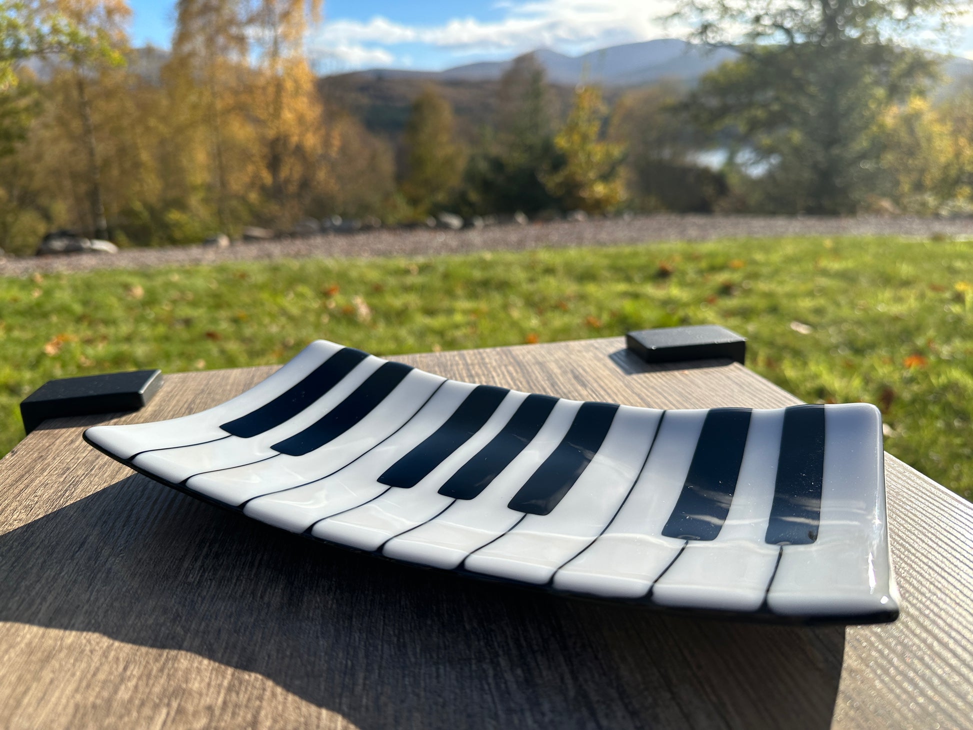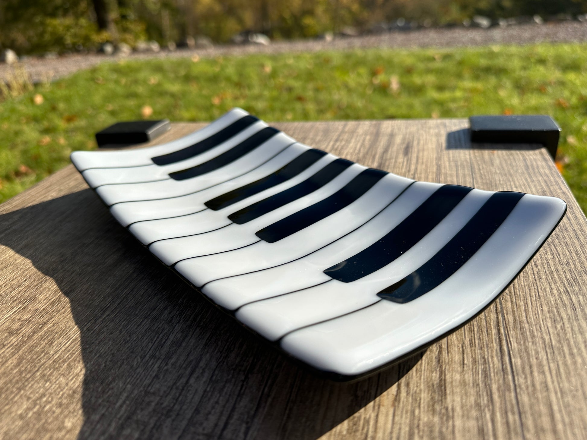 This platter in a piano keyboard design makes a fun conversational piece in any setting. The platter is made with a single piece of black glass to which the white and black "keys" are layered on top to give a keyboard effect. And for those that like a bit more colour there is a rainbow version too!