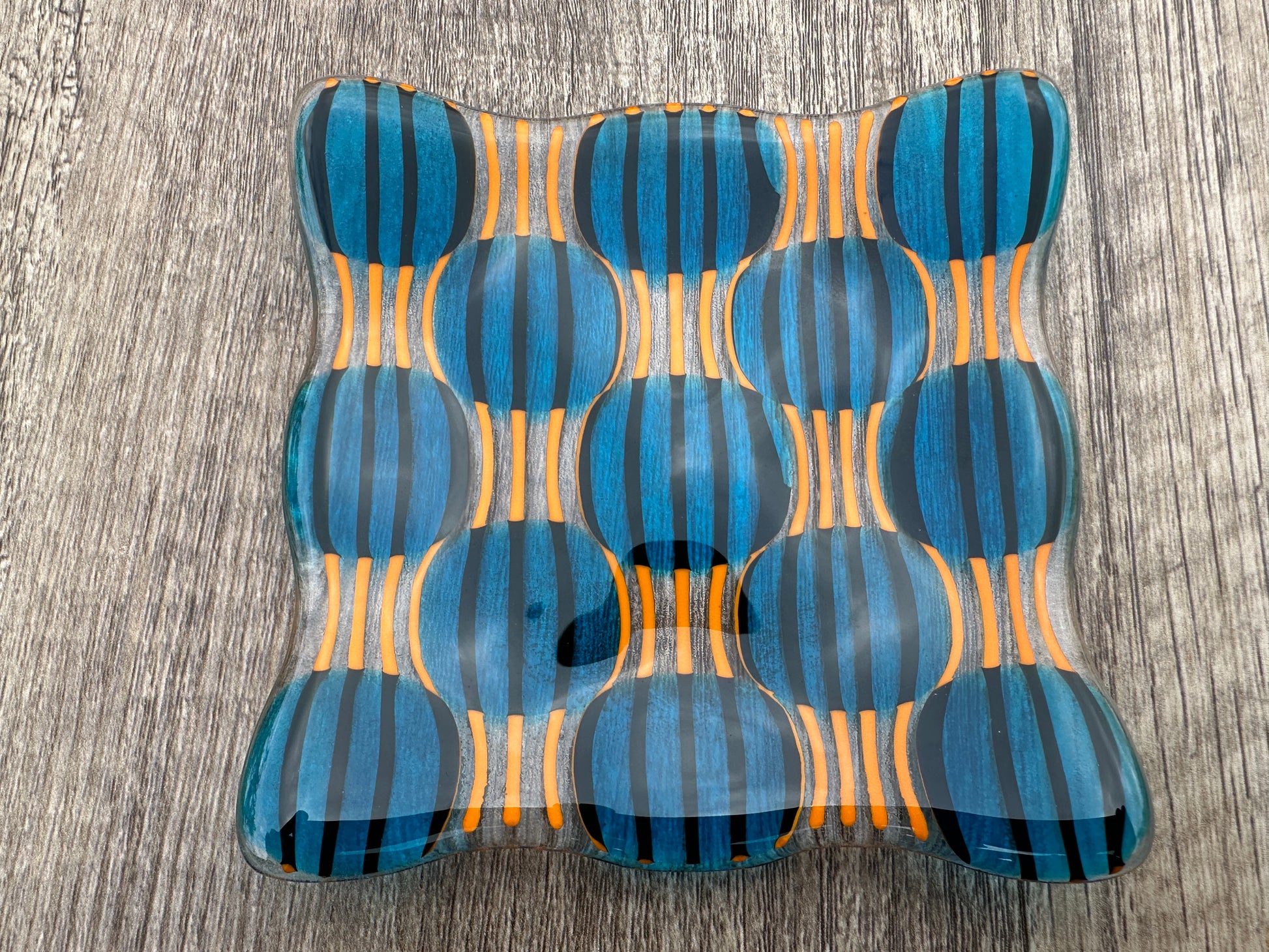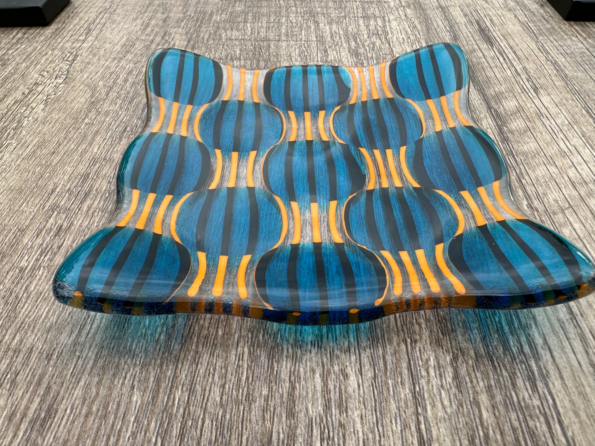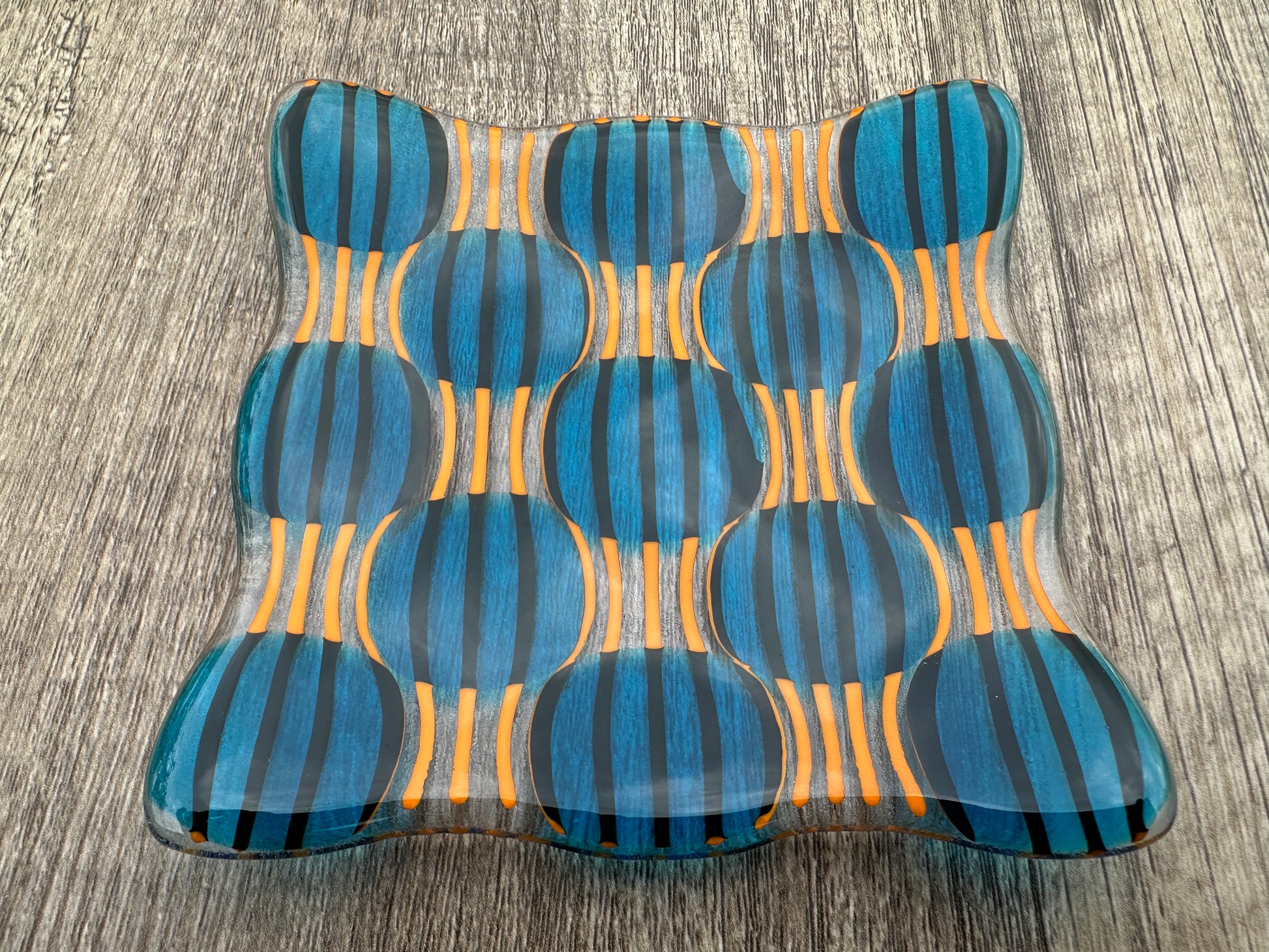 This plate has a flavour of mid-century modern with the lines and bubbles, but also a fun element playing on the optical bends to the lines by the placement of the glass pieces, just like raindrops! The plate is made with a single piece of clear glass to which lines of coloured stringers are added. Then squares of coloured transparent glass are laid on top of the stringers in an alternating pattern that give the light-bending, raindrop effect.