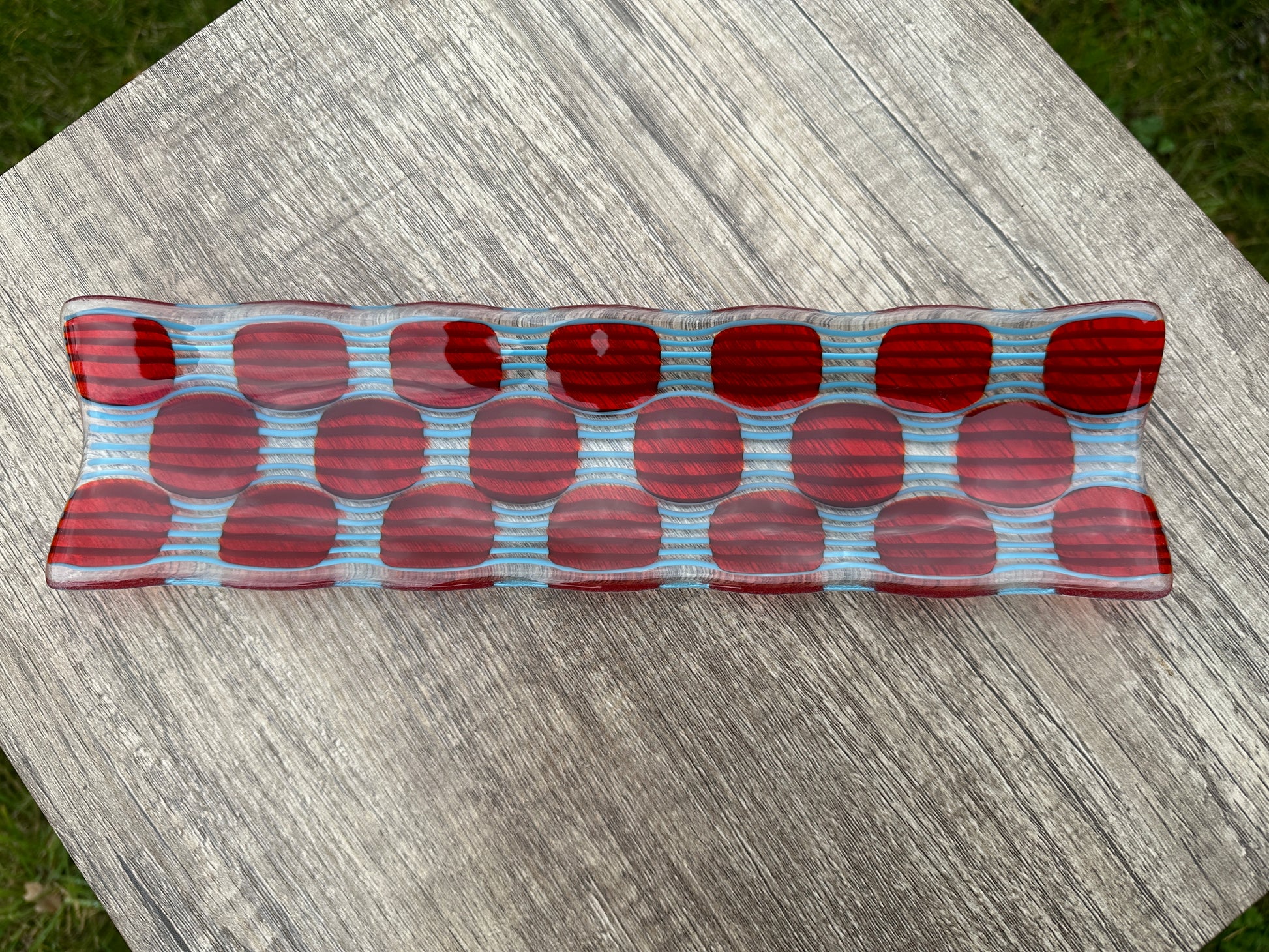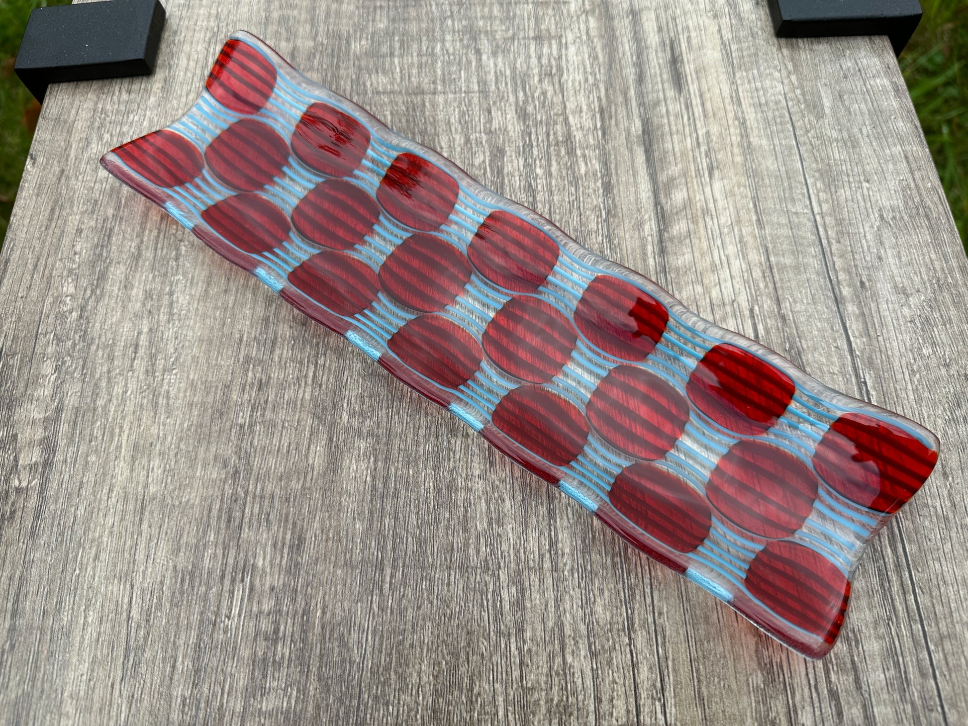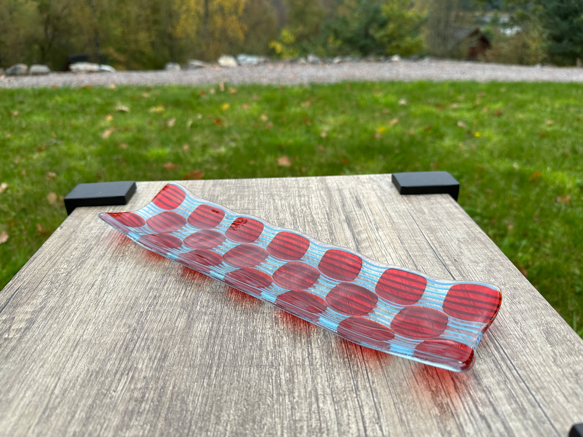 This channel platter has a flavour of mid-century modern with the lines and bubbles, but also a fun element playing on the optical bends to the lines by the placement of the glass pieces, just like raindrops! The platter is made with a single piece of clear glass to which lines of coloured stringers are added. Then squares of coloured transparent glass are laid on top of the stringers in an alternating pattern that give the light-bending, raindrop effect.
