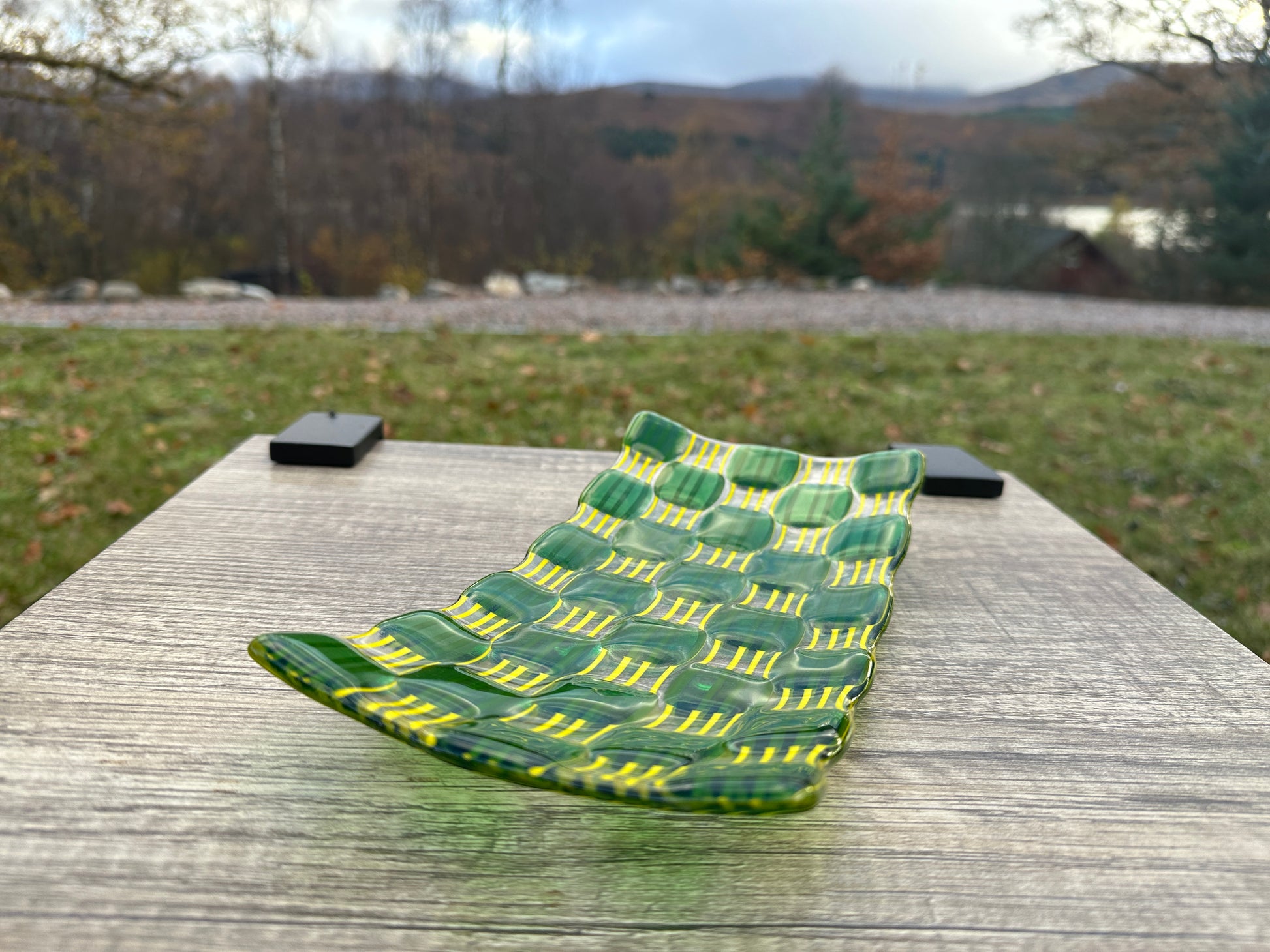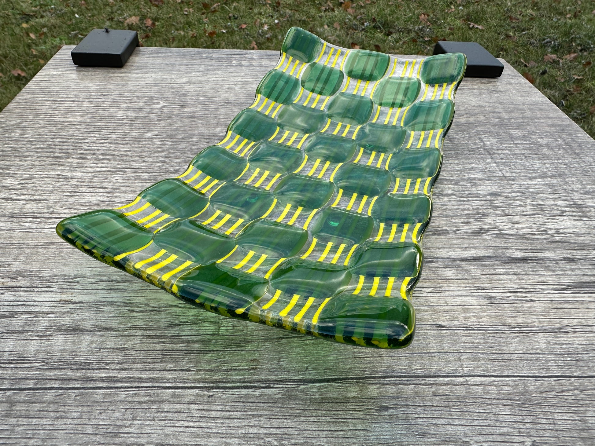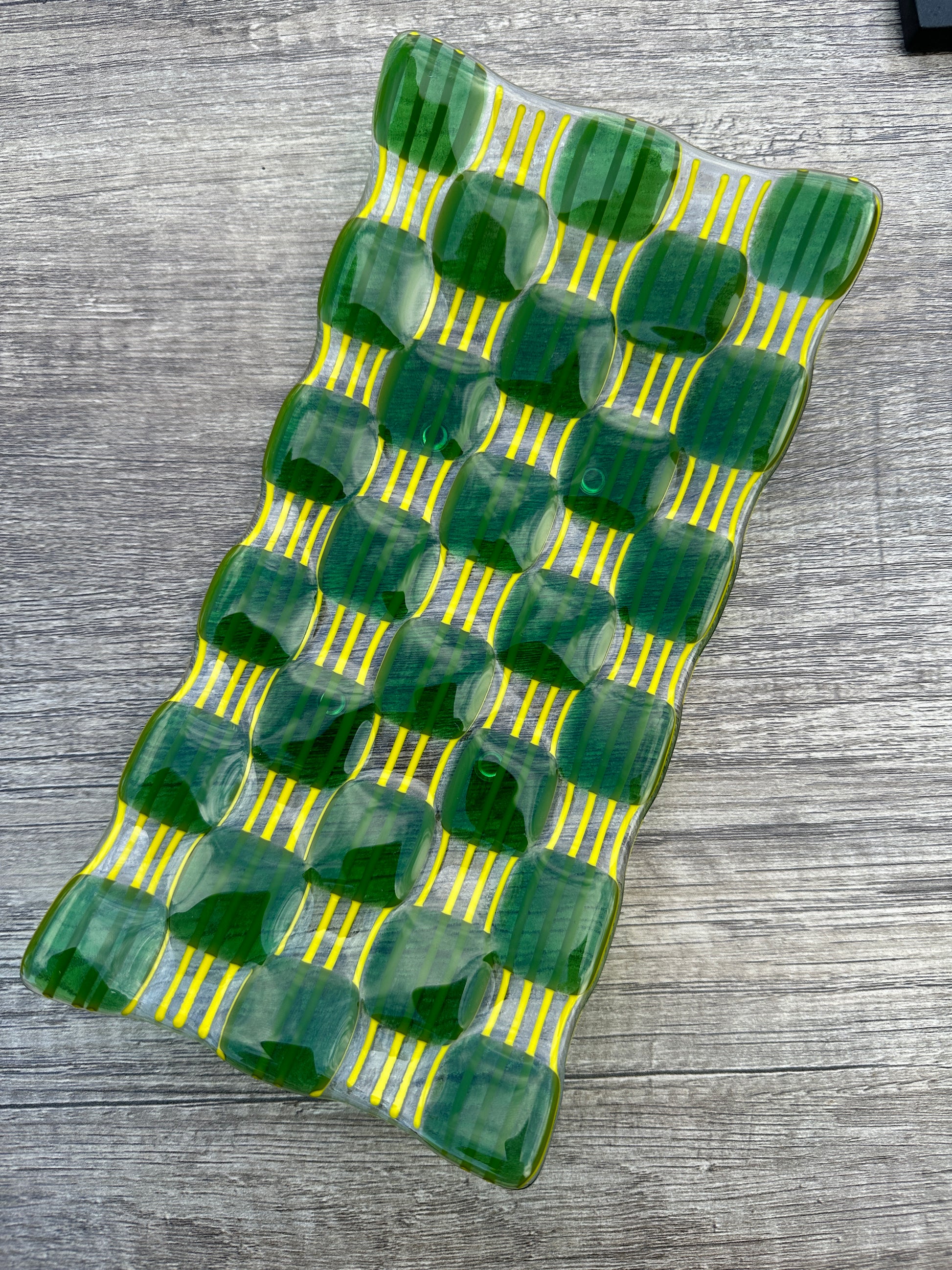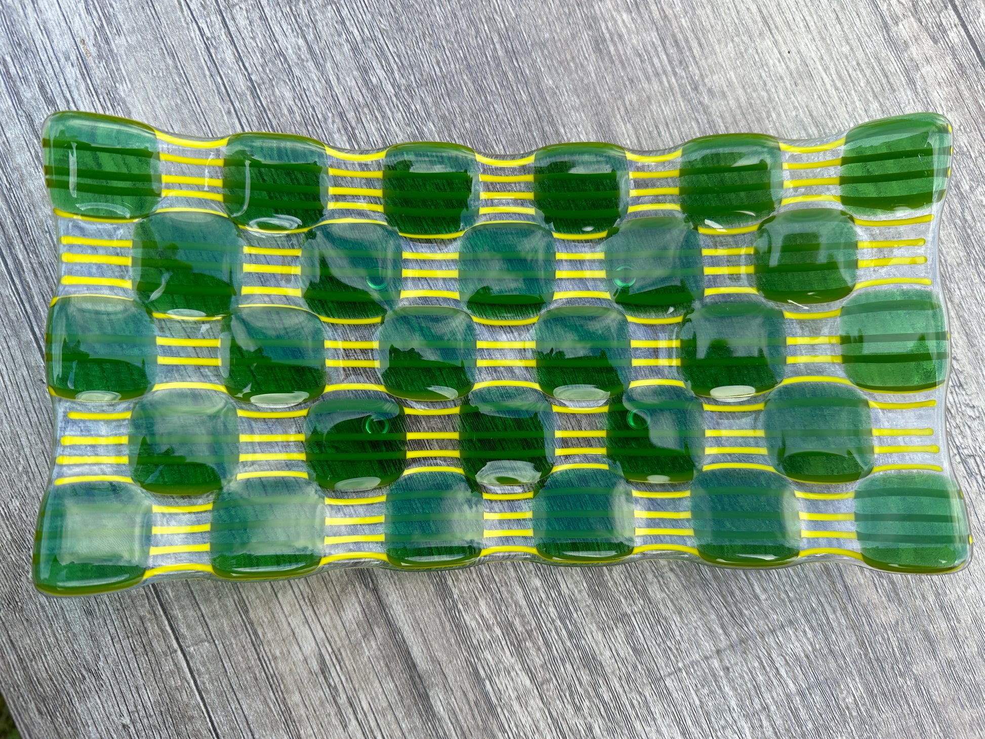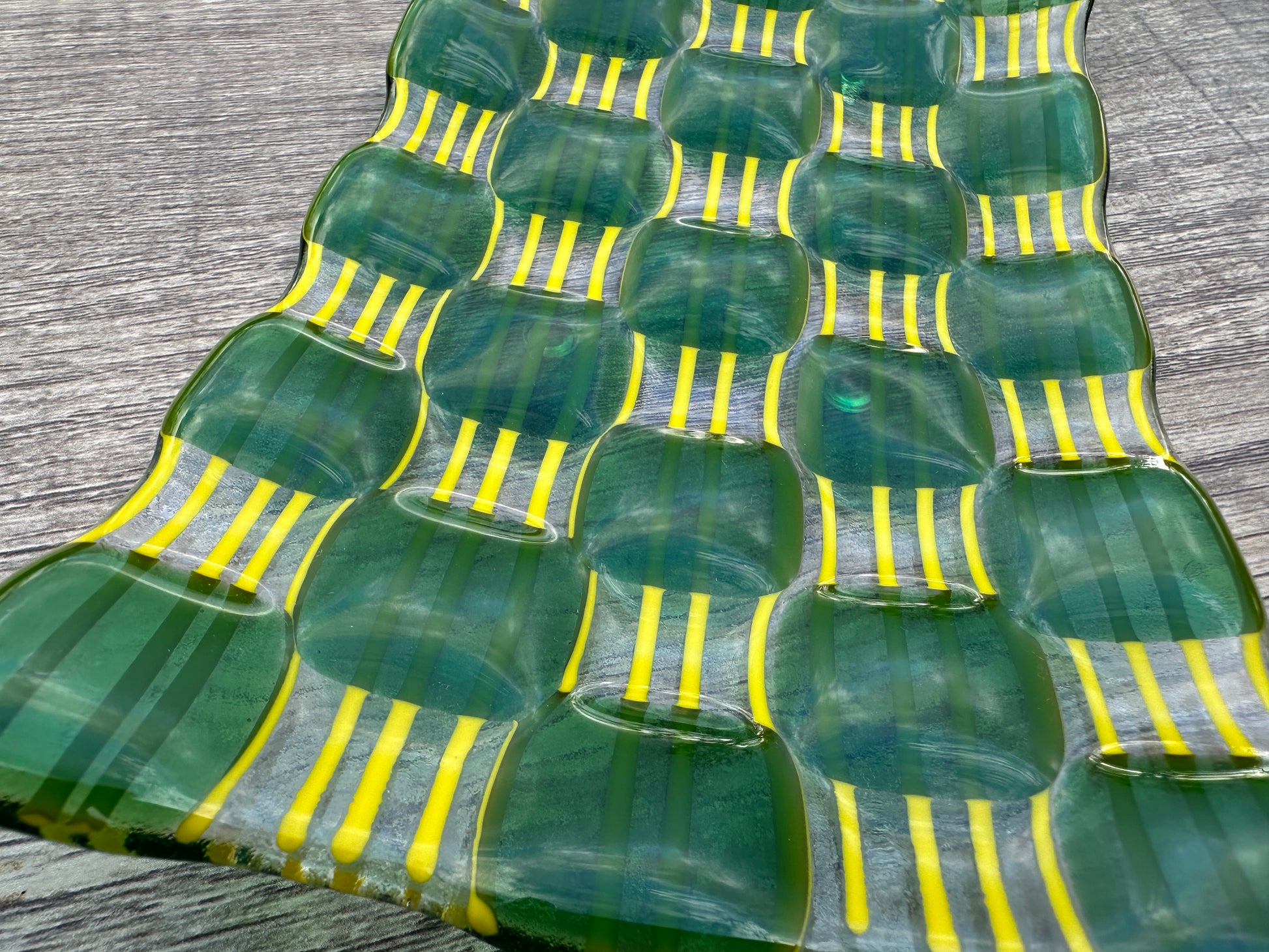 This platter has a flavour of mid-century modern with the lines and bubbles, but also a fun element playing on the optical bends to the lines by the placement of the glass pieces, just like raindrops! The platter is made with a single piece of clear glass to which lines of coloured stringers are added. Then squares of coloured transparent glass are laid on top of the stringers in an alternating pattern that give the light-bending, raindrop effect.