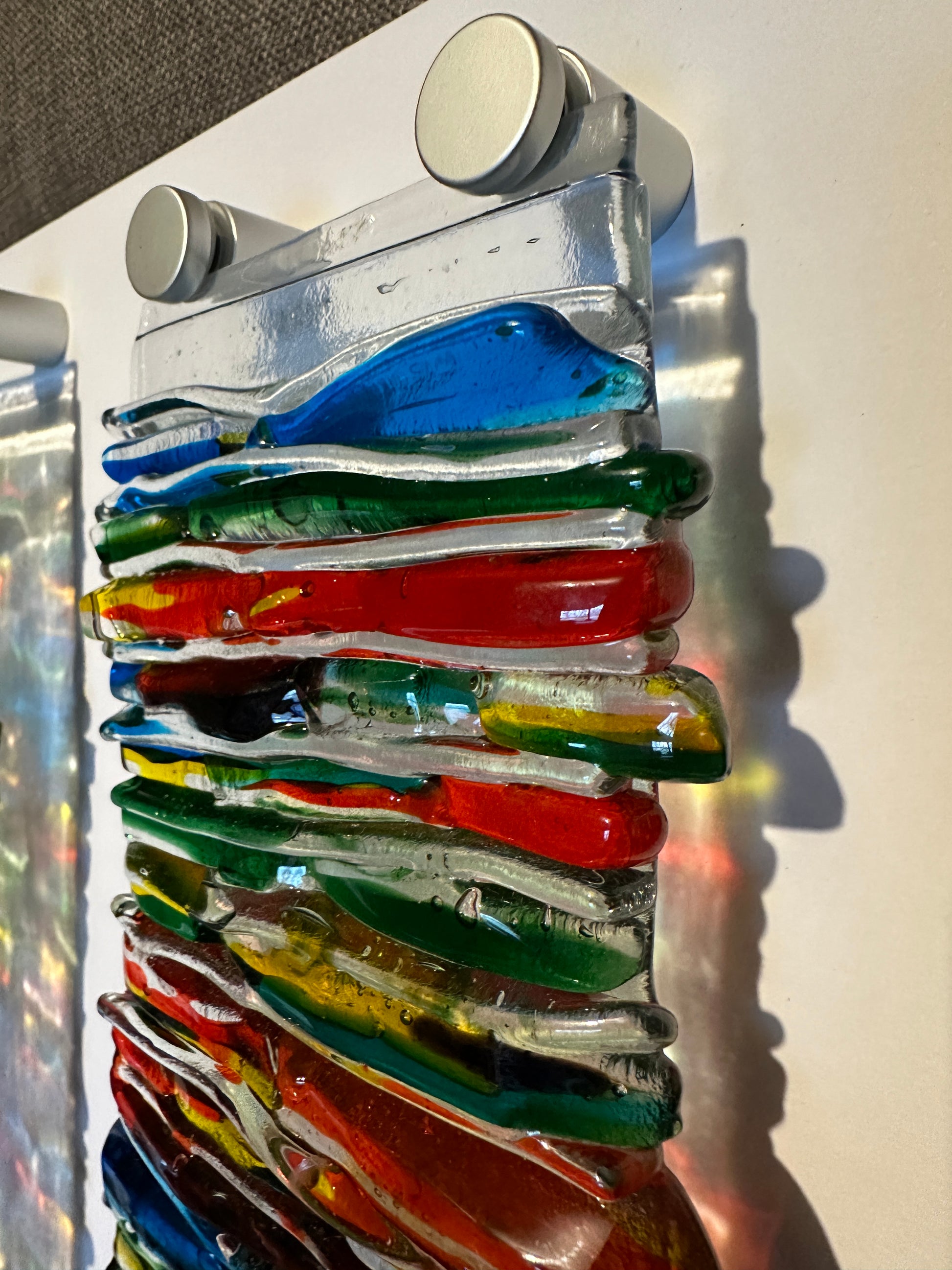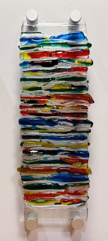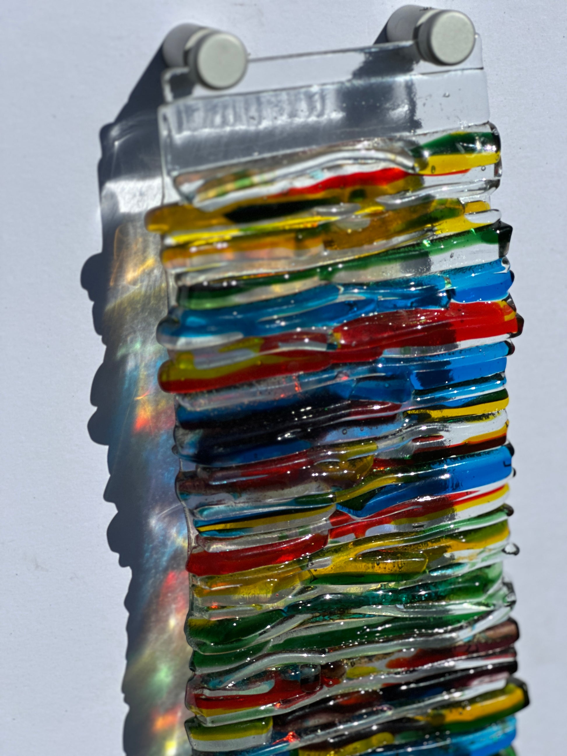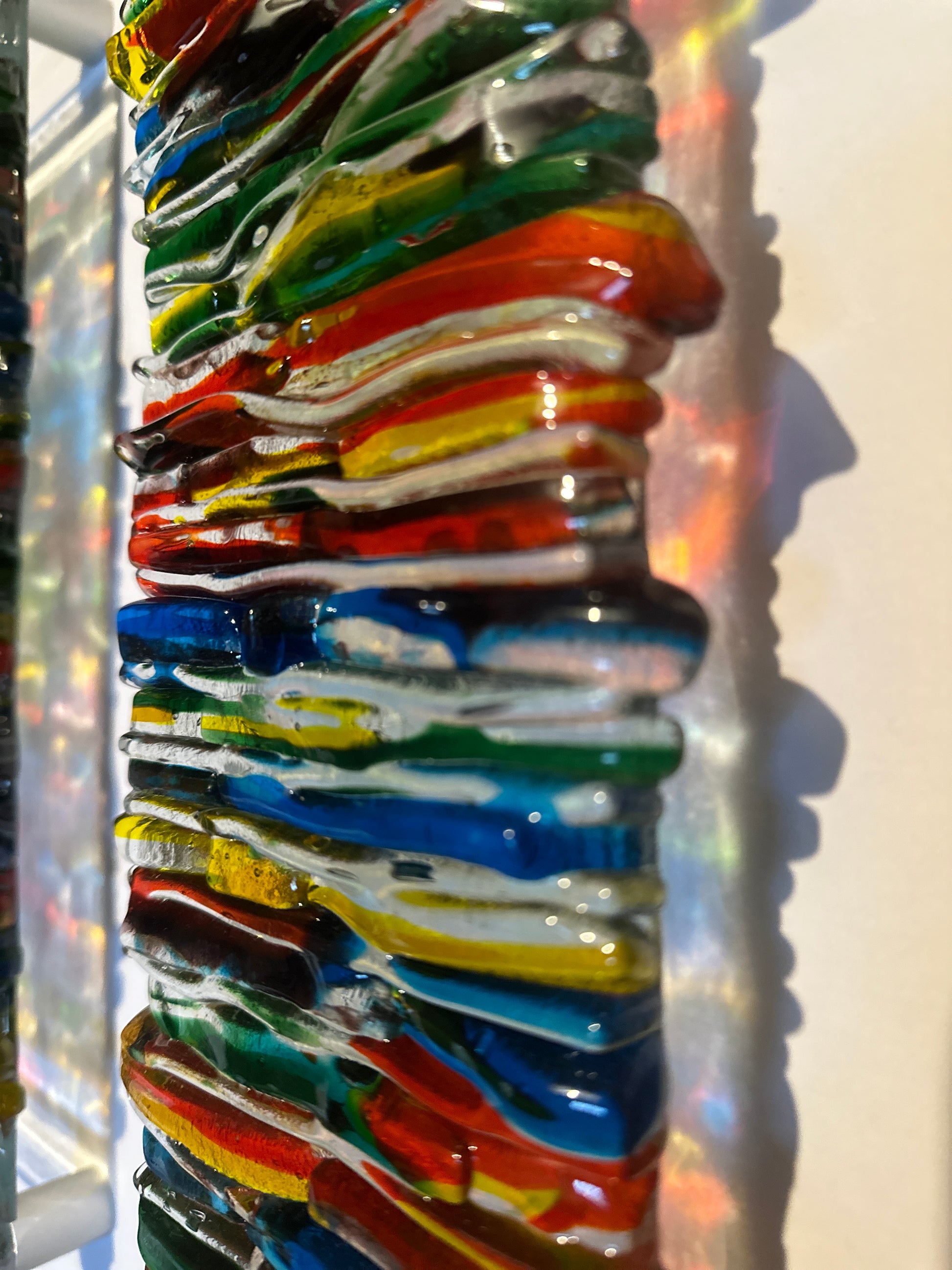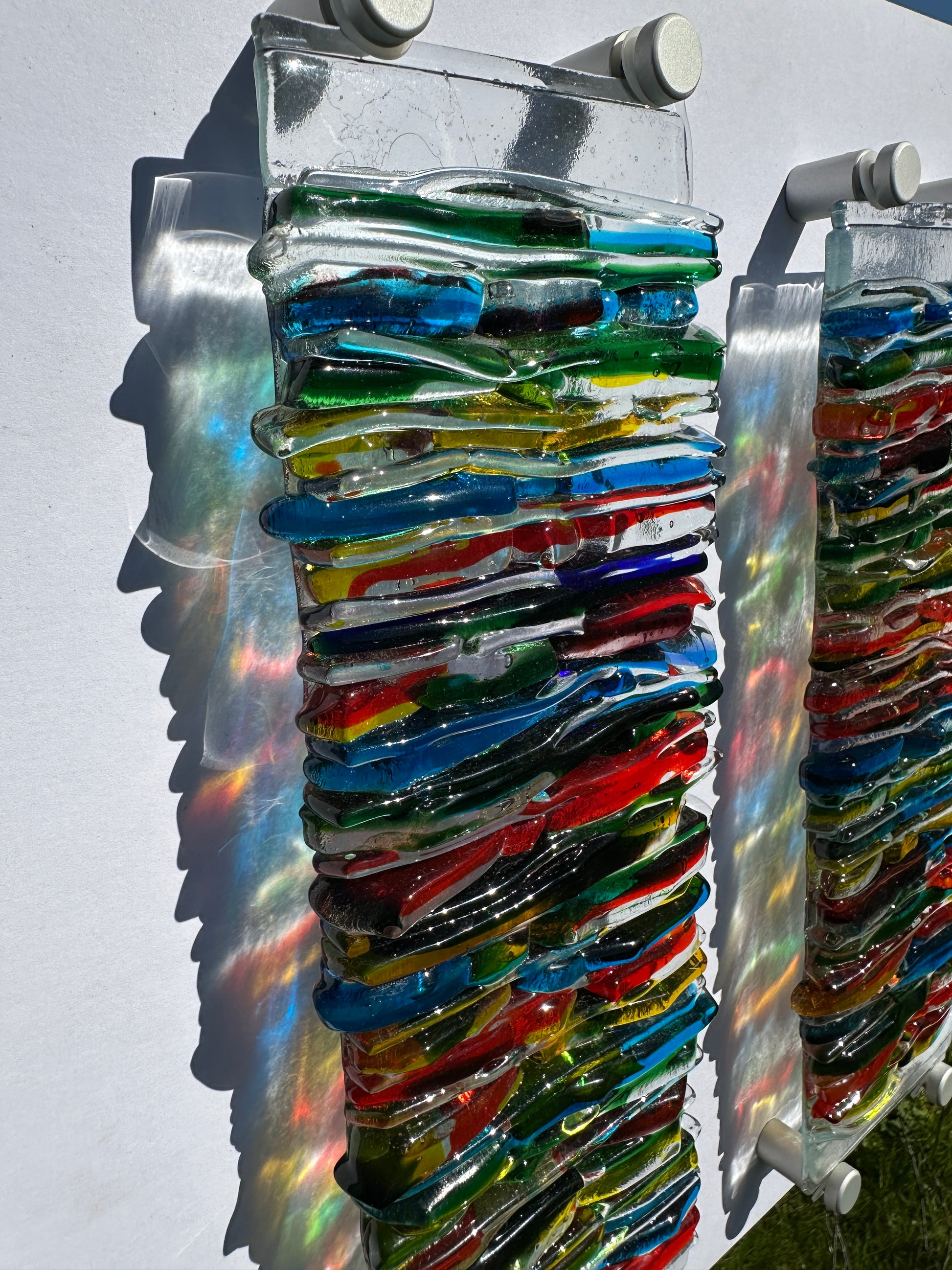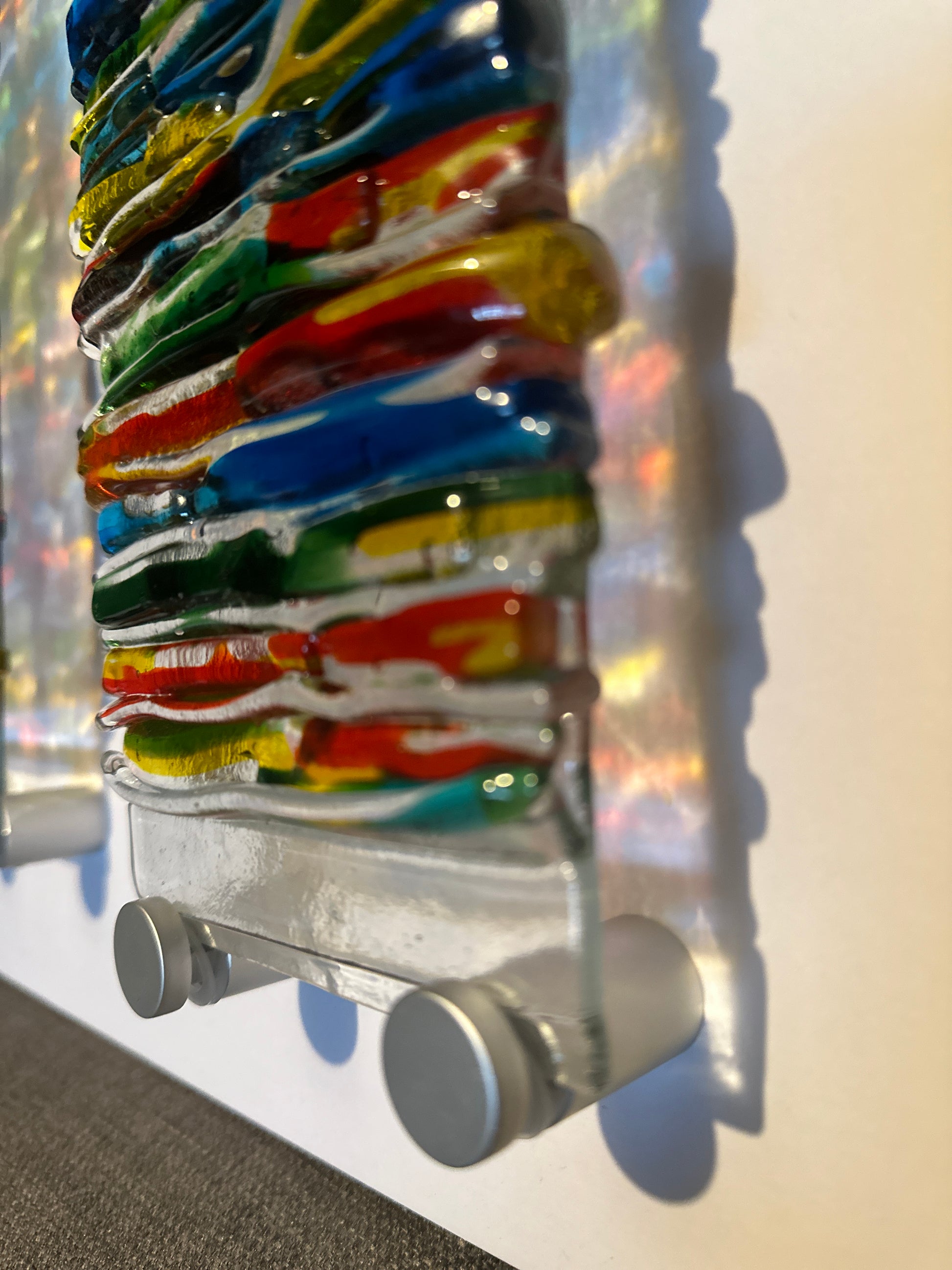 Random layers of thick-cut and shaped coloured glass are arranged to create a flowing, ripple effect that reflects the light in this captivating wall panel. Its texture invites you to touch and interact with the glass, to feel the the melded shapes and softness of the flow. The changing light of the day casts a dazzle of colours that seem to dance in a way that brings both light and movement to the piece. Almost like a ripple in light!