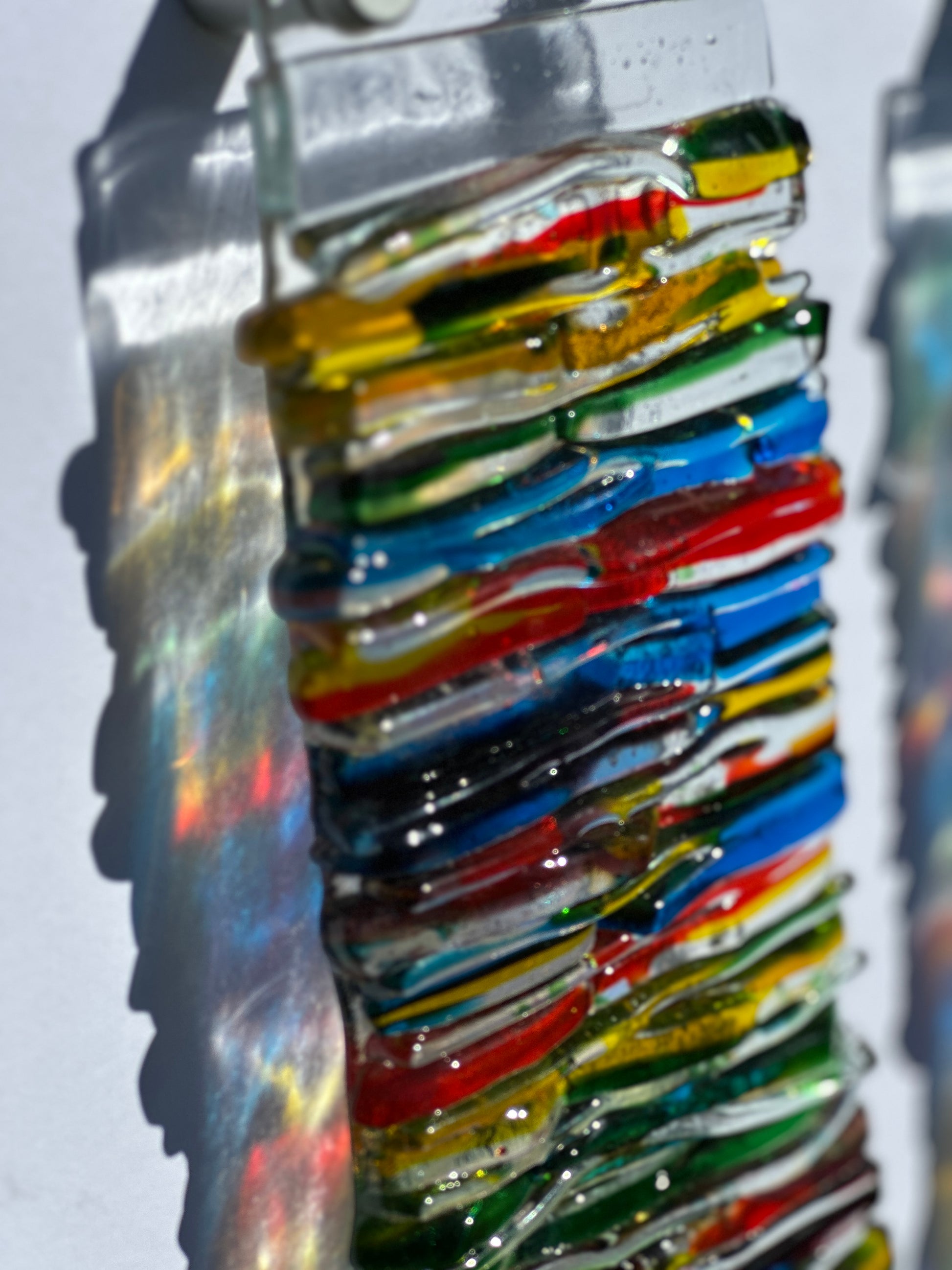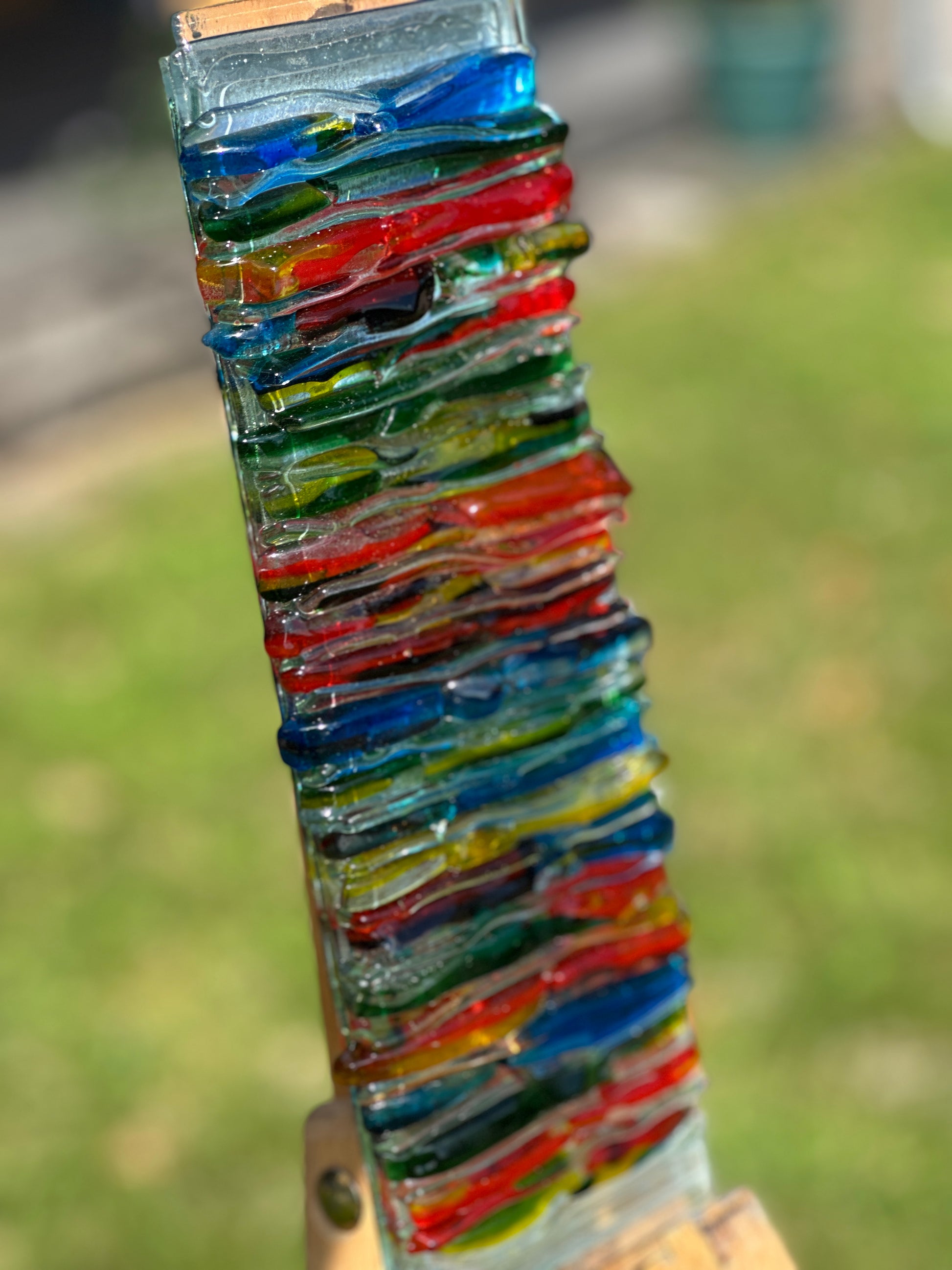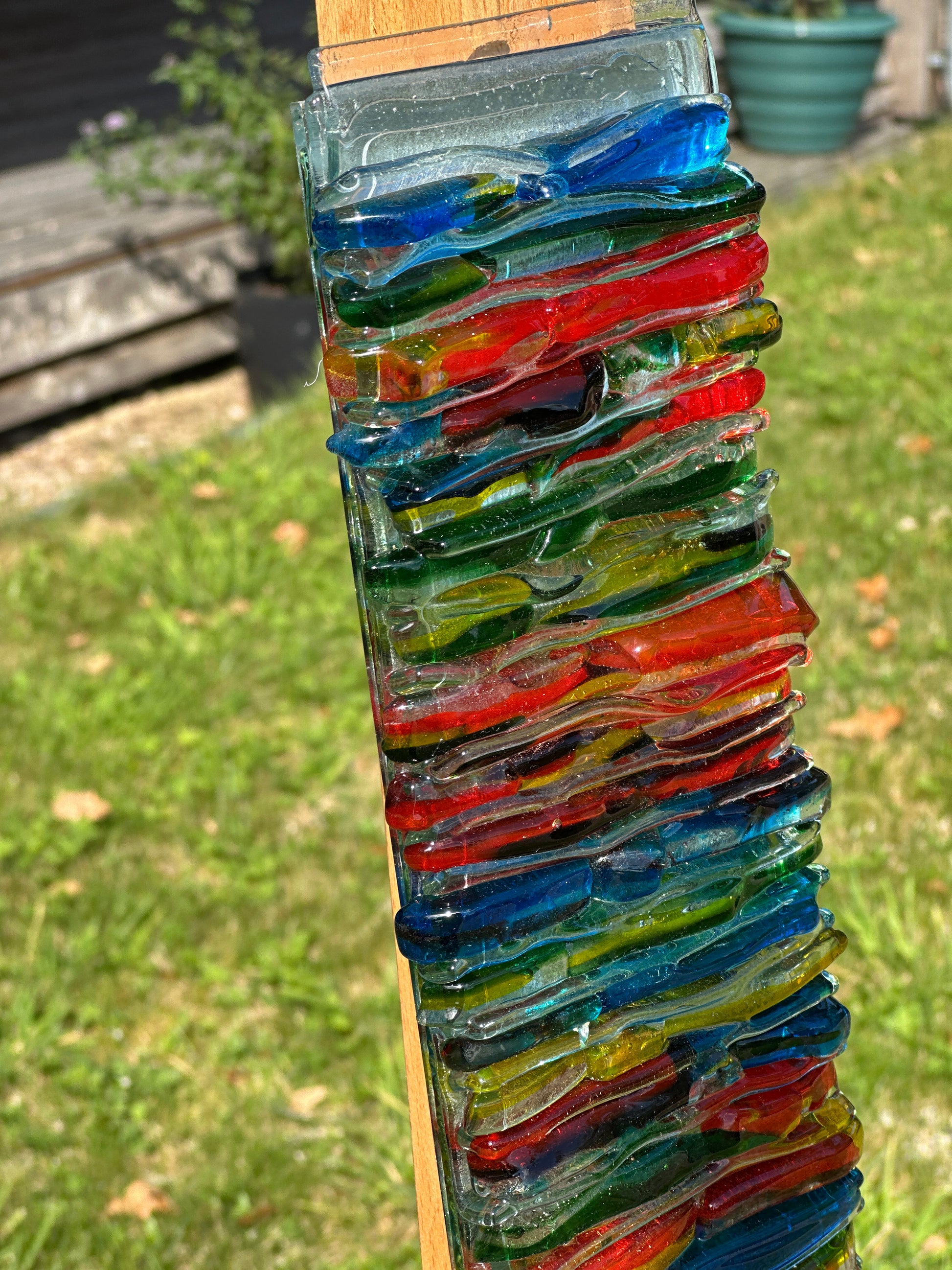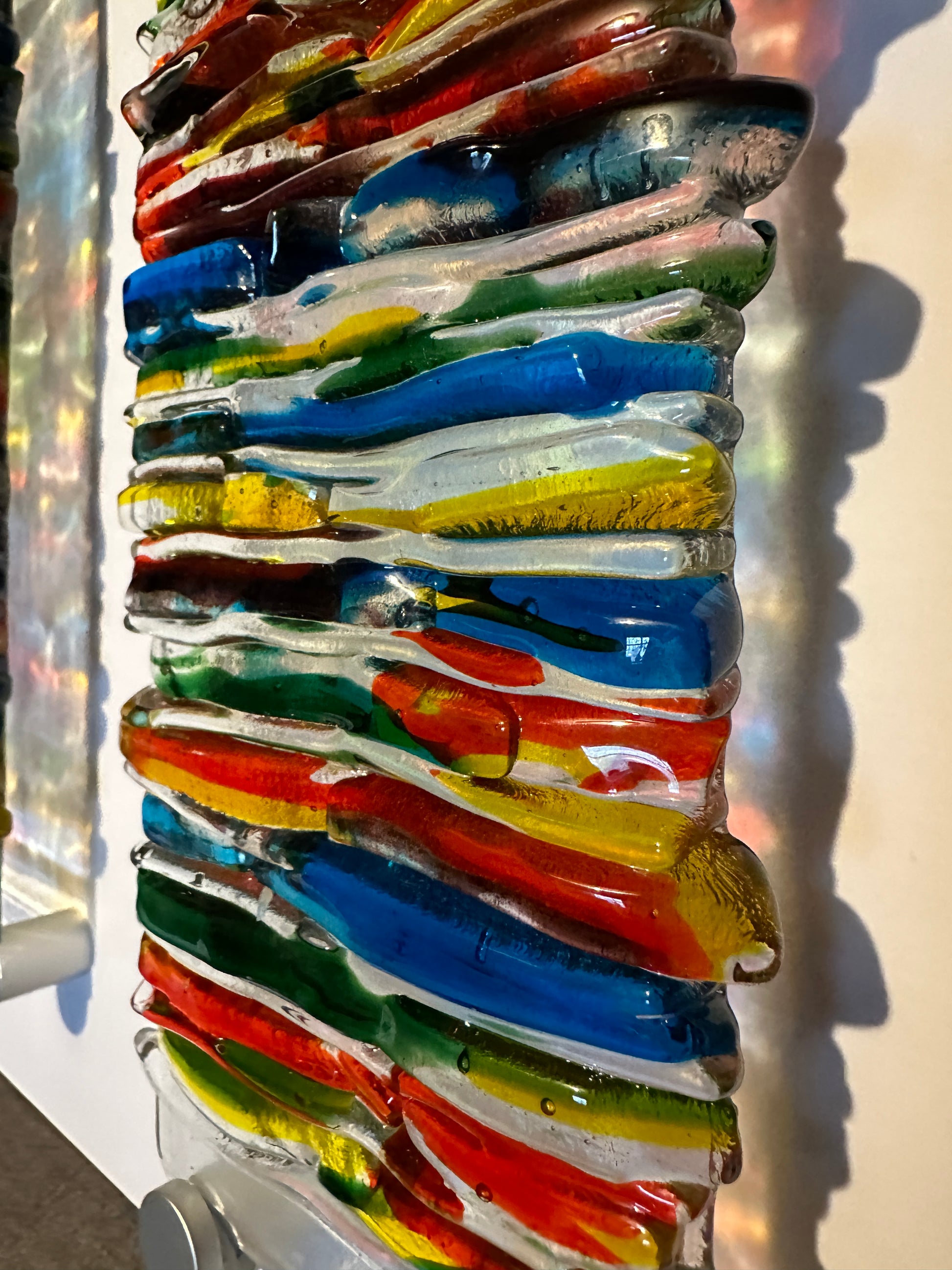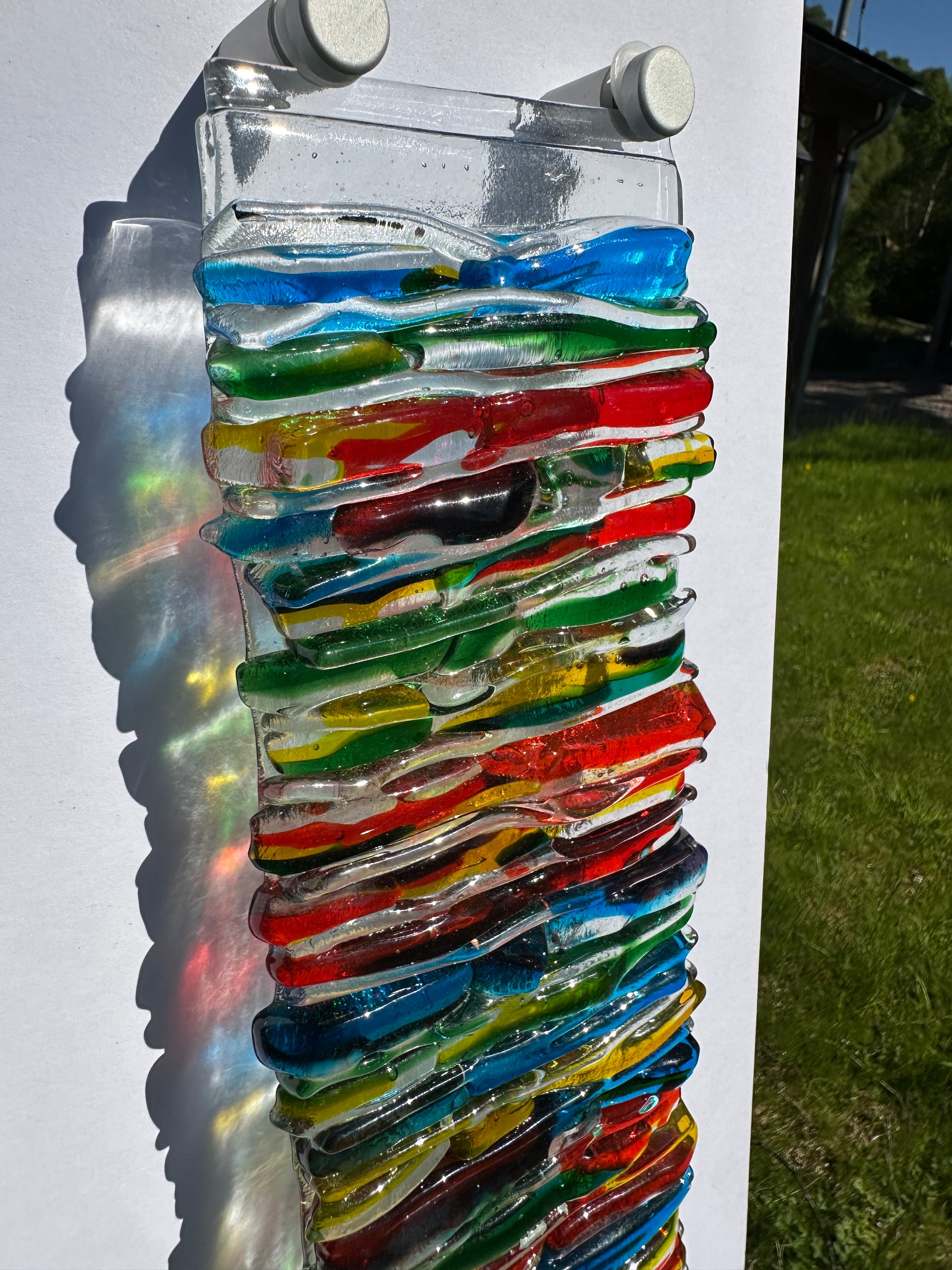 Random layers of thick-cut and shaped coloured glass are arranged to create a flowing, ripple effect that reflects the light in this captivating wall panel. Its texture invites you to touch and interact with the glass, to feel the the melded shapes and softness of the flow. The changing light of the day casts a dazzle of colours that seem to dance in a way that brings both light and movement to the piece. Almost like a ripple in light!