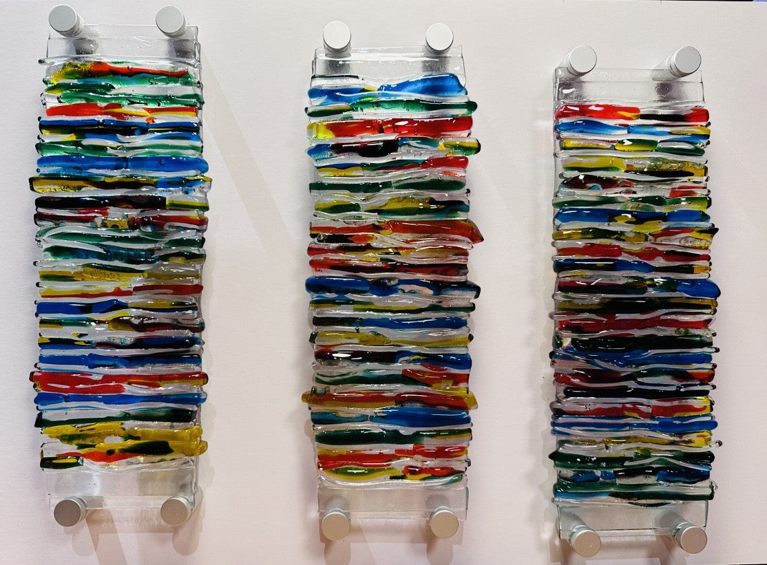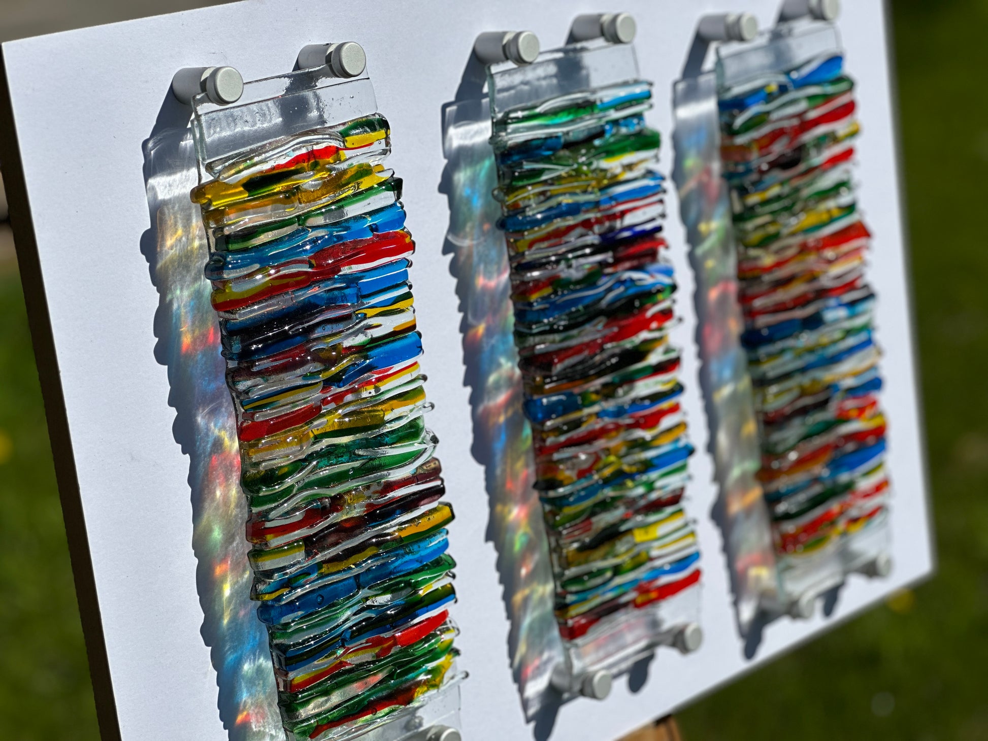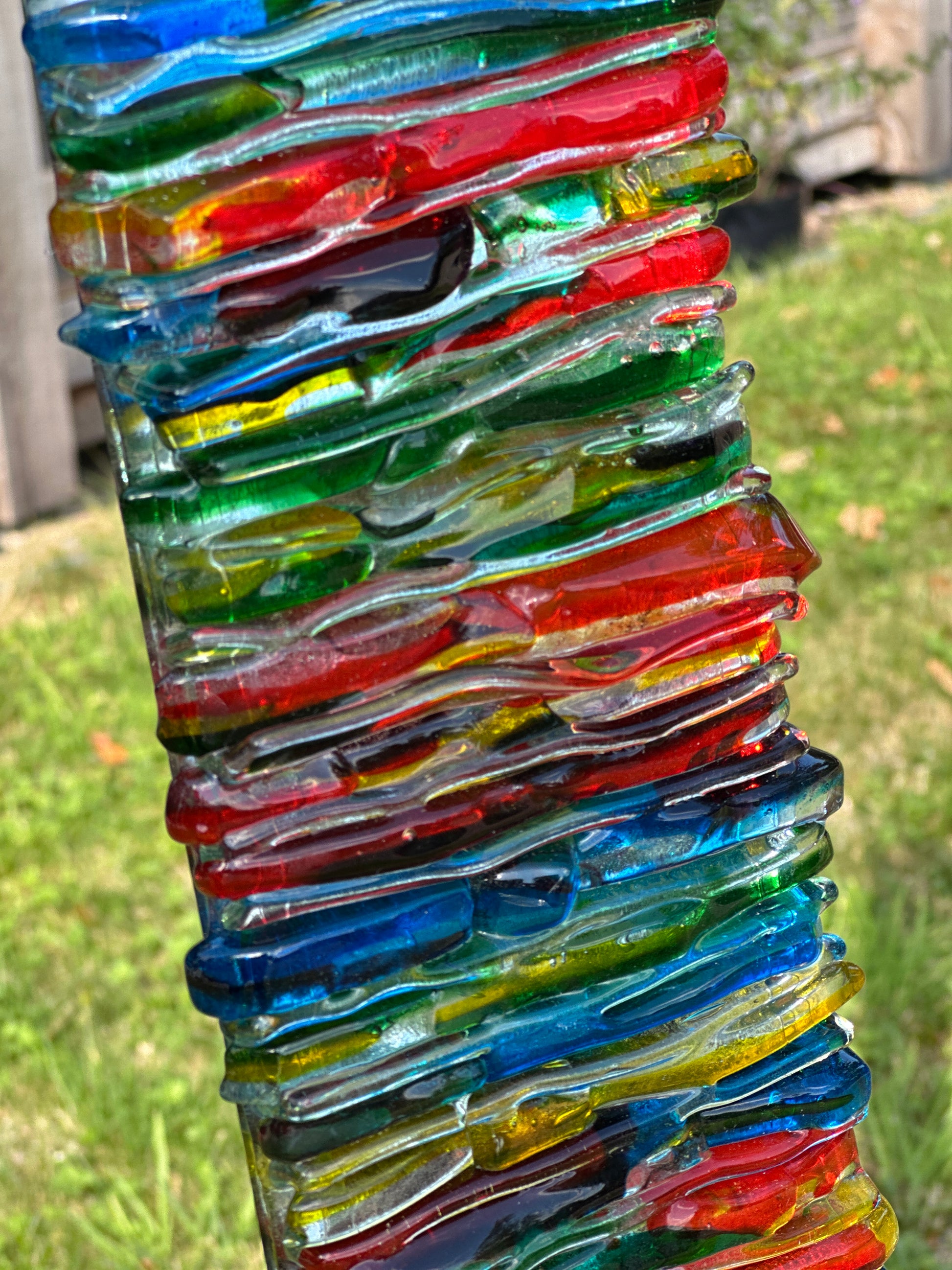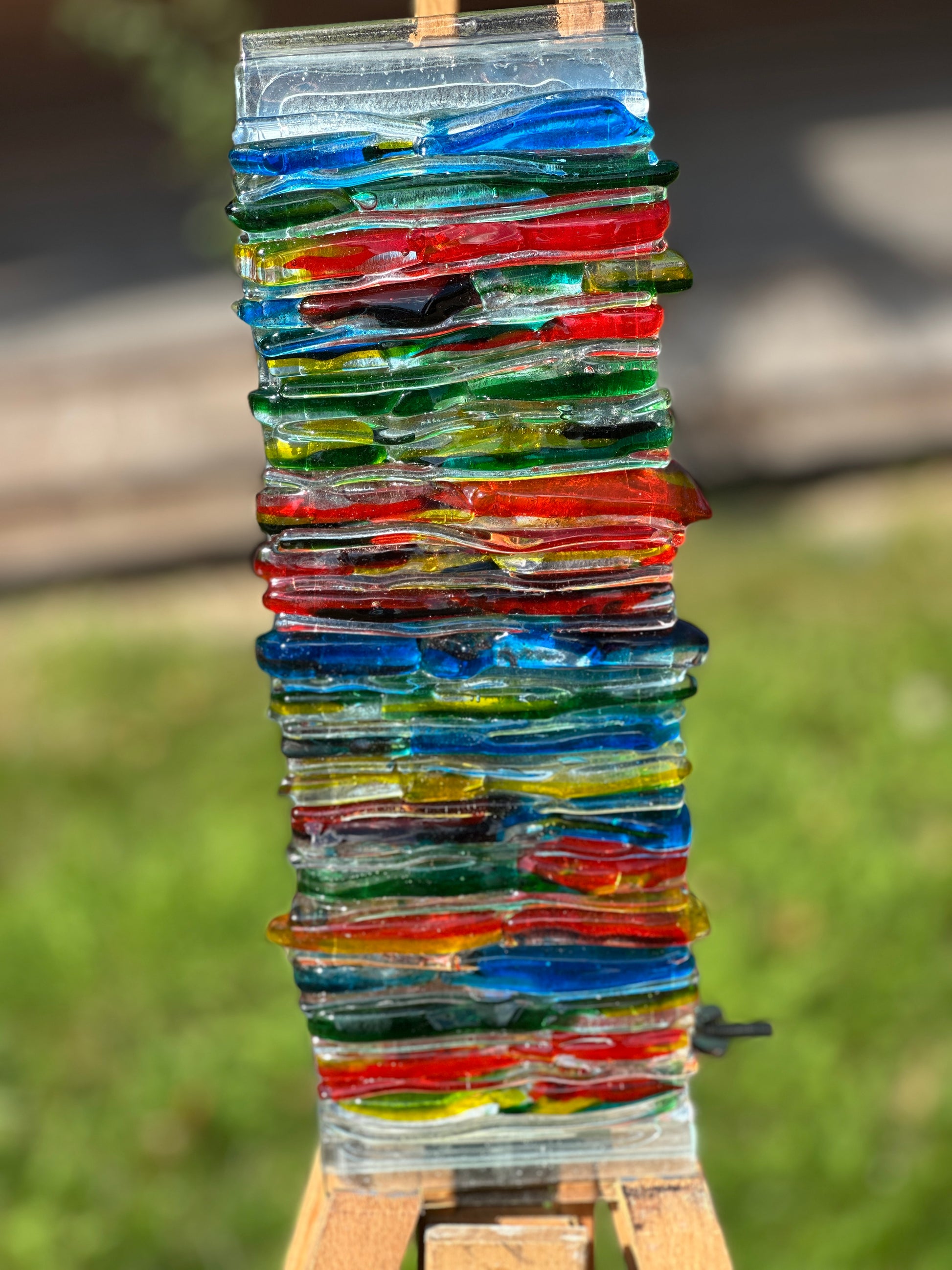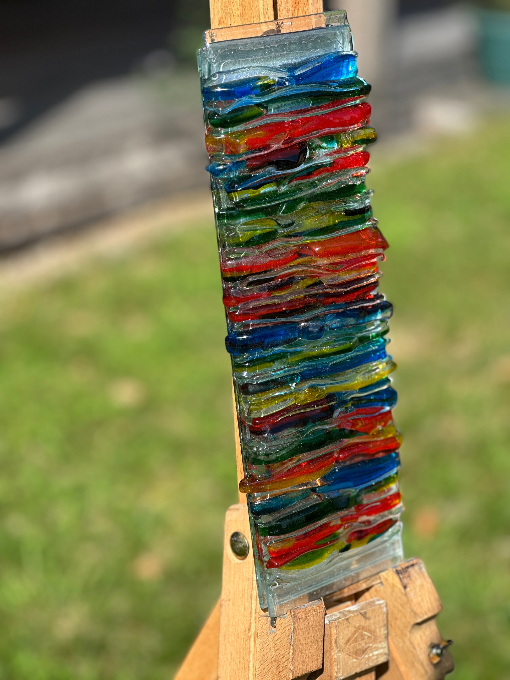 Random layers of thick-cut and shaped coloured glass are arranged to create a flowing, ripple effect that reflects the light in this captivating wall panel. Its texture invites you to touch and interact with the glass, to feel the the melded shapes and softness of the flow. The changing light of the day casts a dazzle of colours that seem to dance in a way that brings both light and movement to the piece. Almost like a ripple in light!