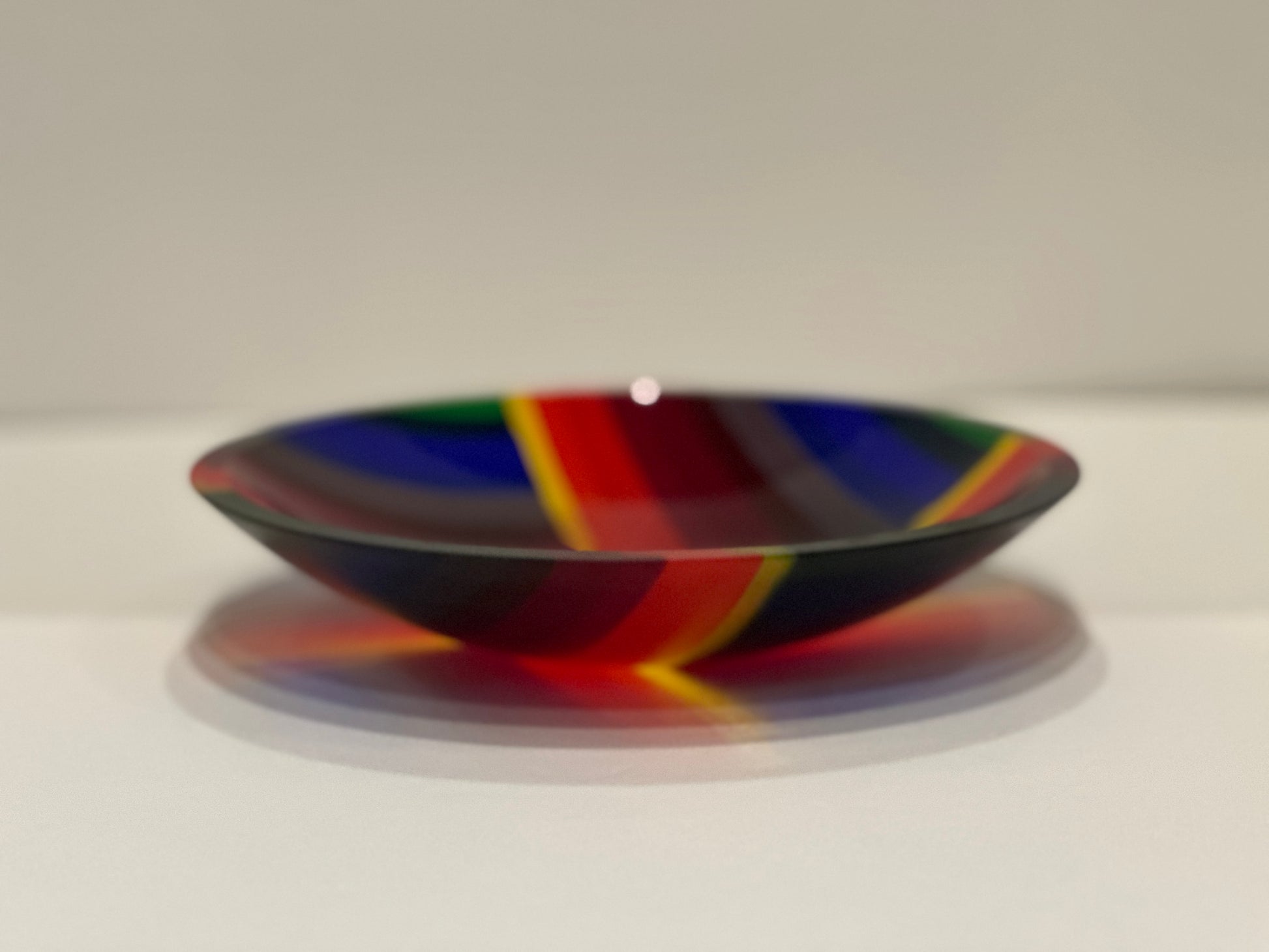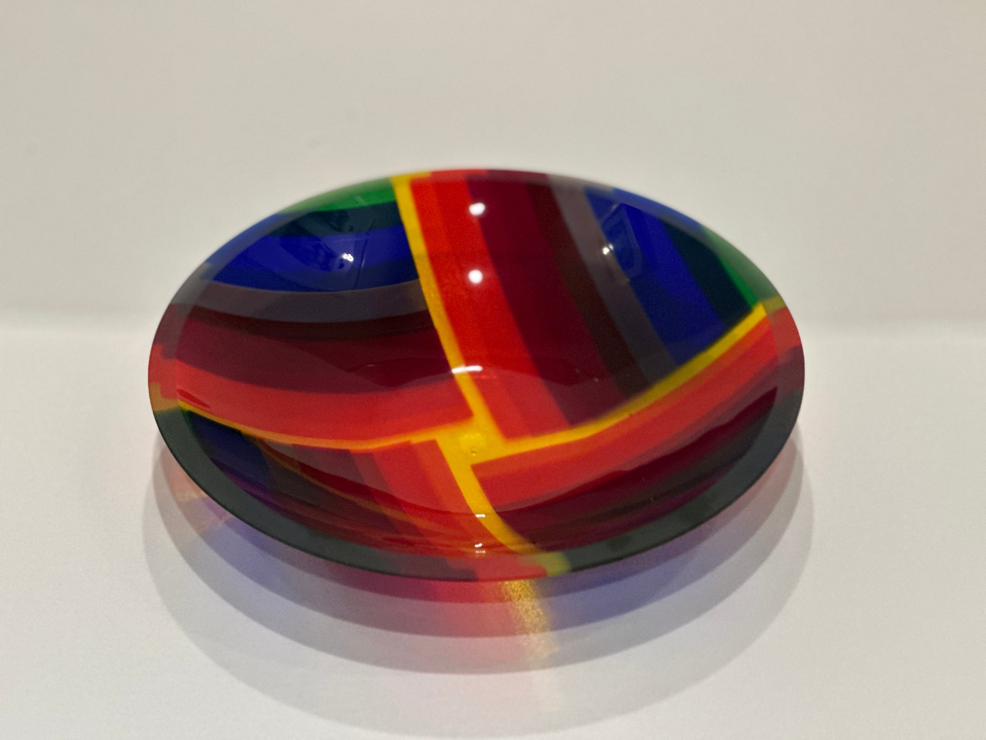 Made from two layers of hand-cut coloured glass, slightly offset to each other, this bowl starts life as a square. After the first firing it is then cut into a circle and then cut into four pieces and rearranged into the final pattern. The piece is then refired into a single piece, before going into the kiln a final time to form into the mould. The piece is then cold-worked to produce the soft matt finish to the rim and soft edges.