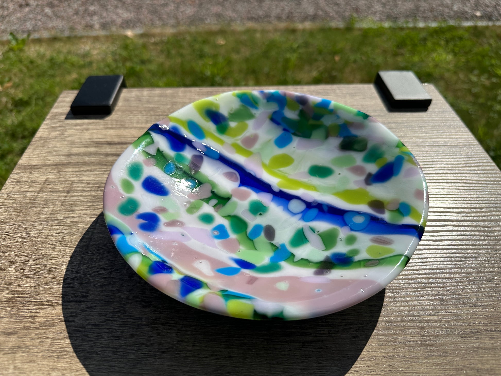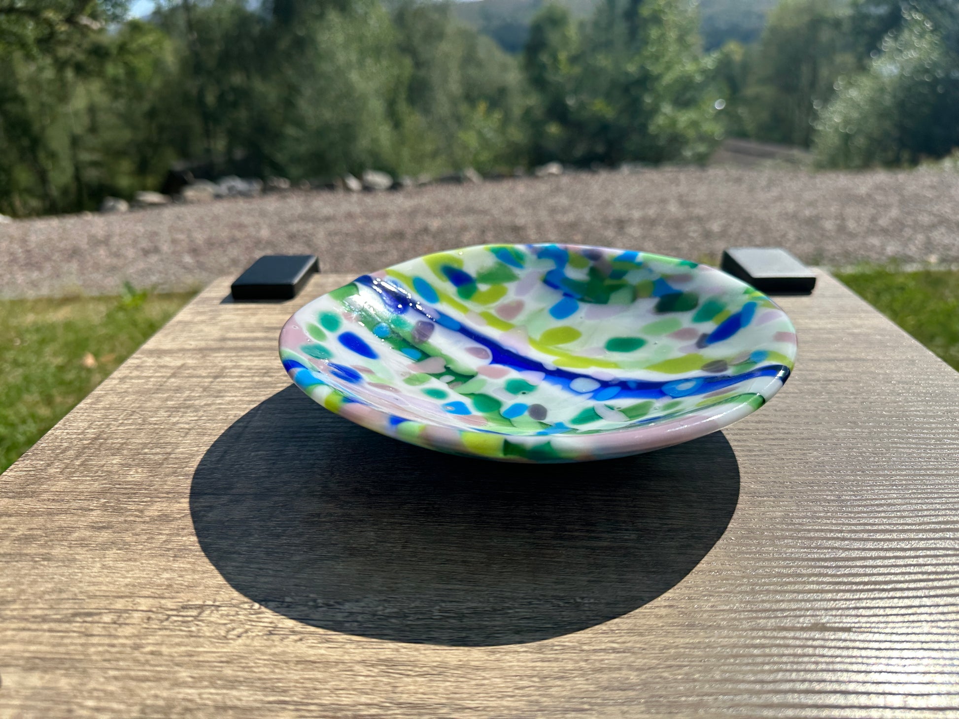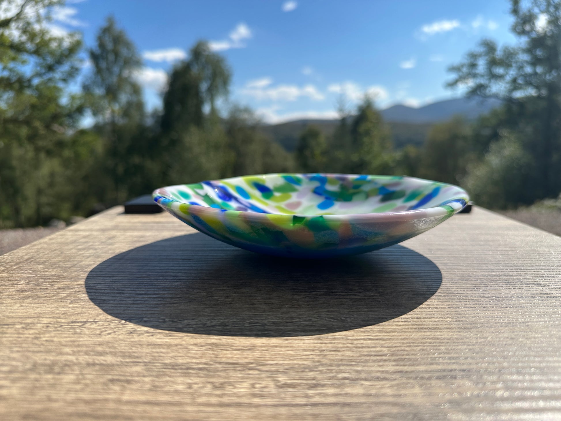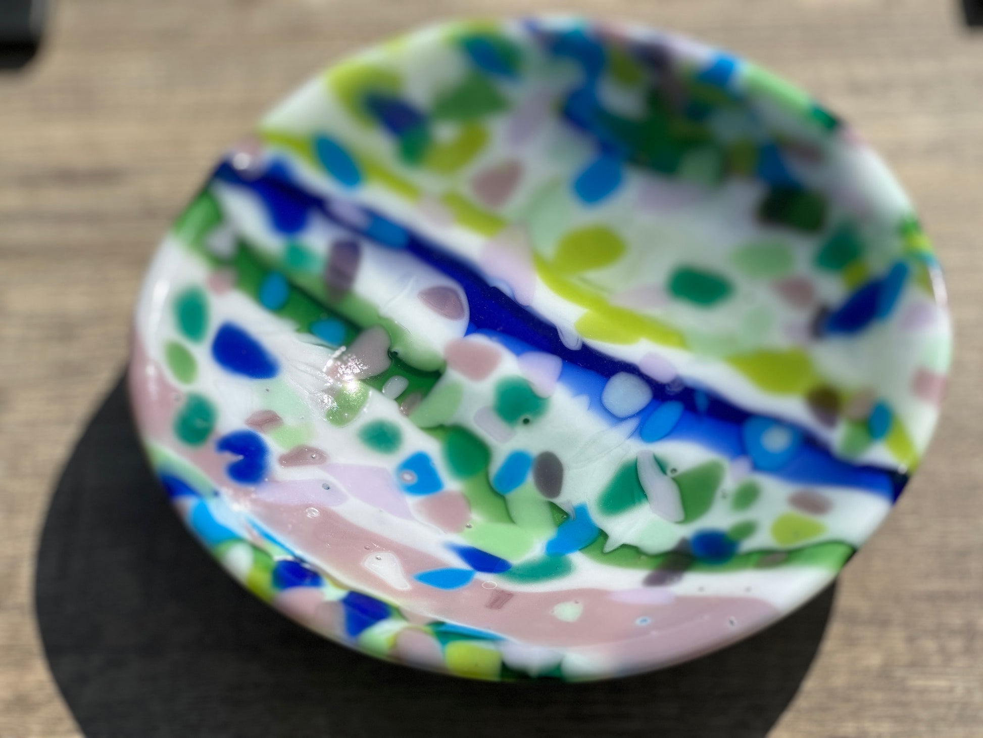 The bowl weighs approx. 23.5 oz. It is made from many layers of coloured glass which is formed into a small "pie" of solid glass. This "pie" is then re-heated at very high temperatures over many hours so that the glass flows and spreads out to form a larger shape. Further glass is added to give more patternation and fused in the kiln again before a final time in the kiln to form the bowl shape.