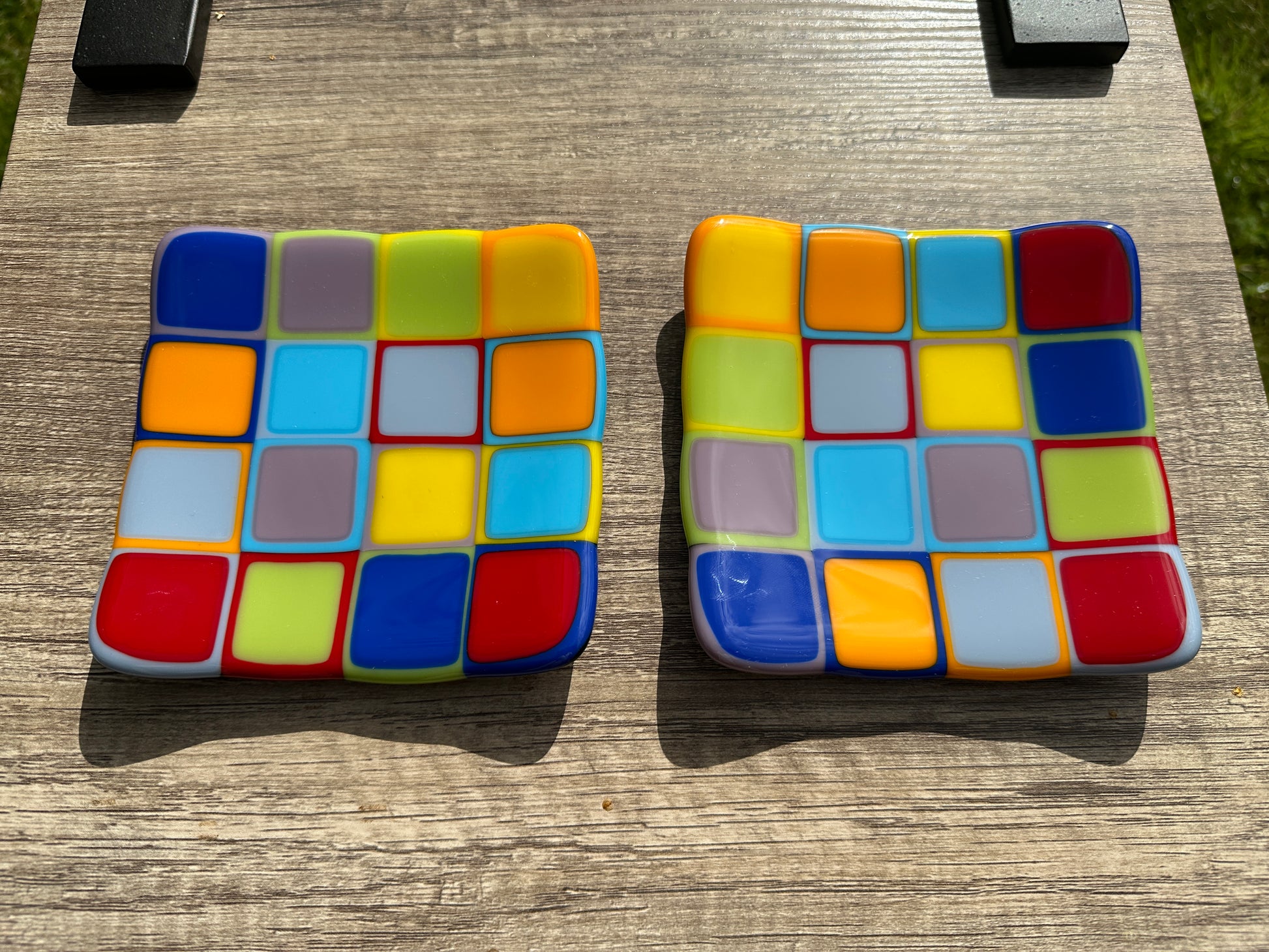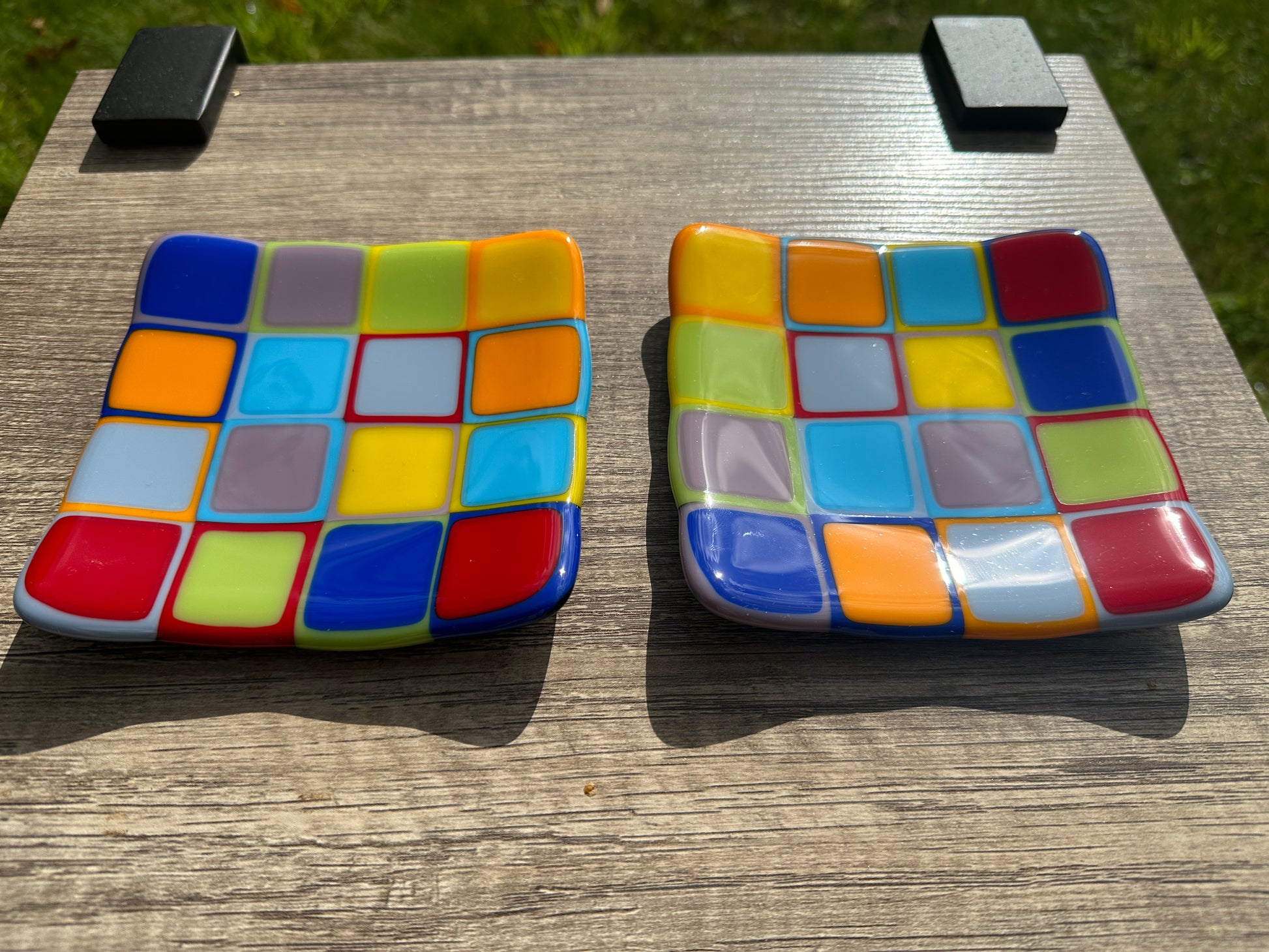 Each plate is made from individually hand-cut pieces of glass that are layered on a single base piece of glass. The assembled glass pieces are then kiln-fused up to a temperature of 1400F to create a single piece of glass with a textured feel. Once cool, the piece is then placed on a mold and in the kiln for a second time up to a temperature of 1225F that softens the glass to the shape of the mold. The entire process can take up to 72 hours.