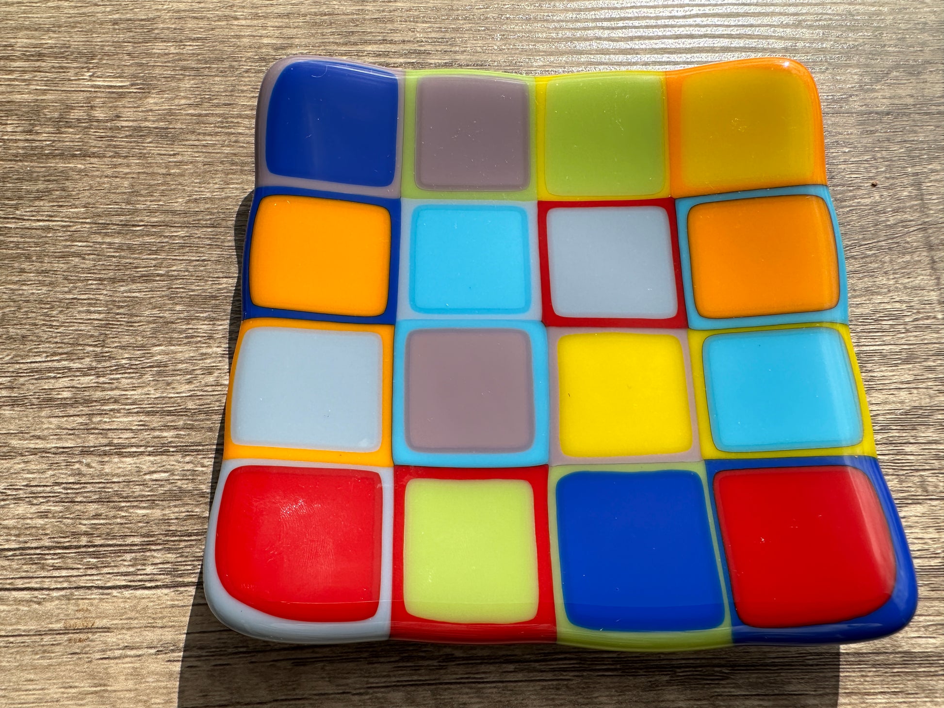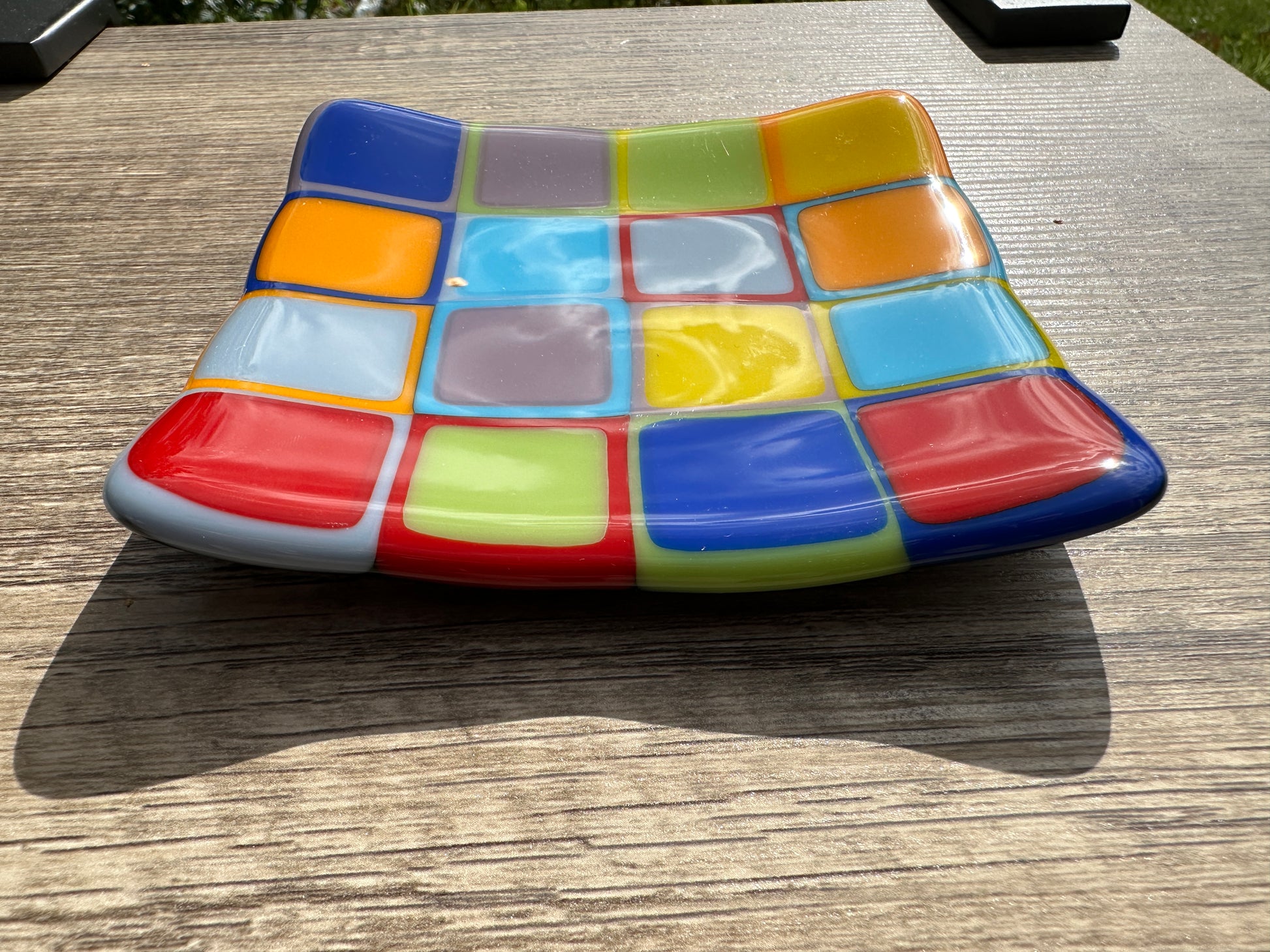 The large squares Araby plate is created with layers of square pieces of glass. Up to nine different colors are sometimes used in one piece that reflect the changing tones of the surrounding hills and mountains and the flora and fauna found in the area.