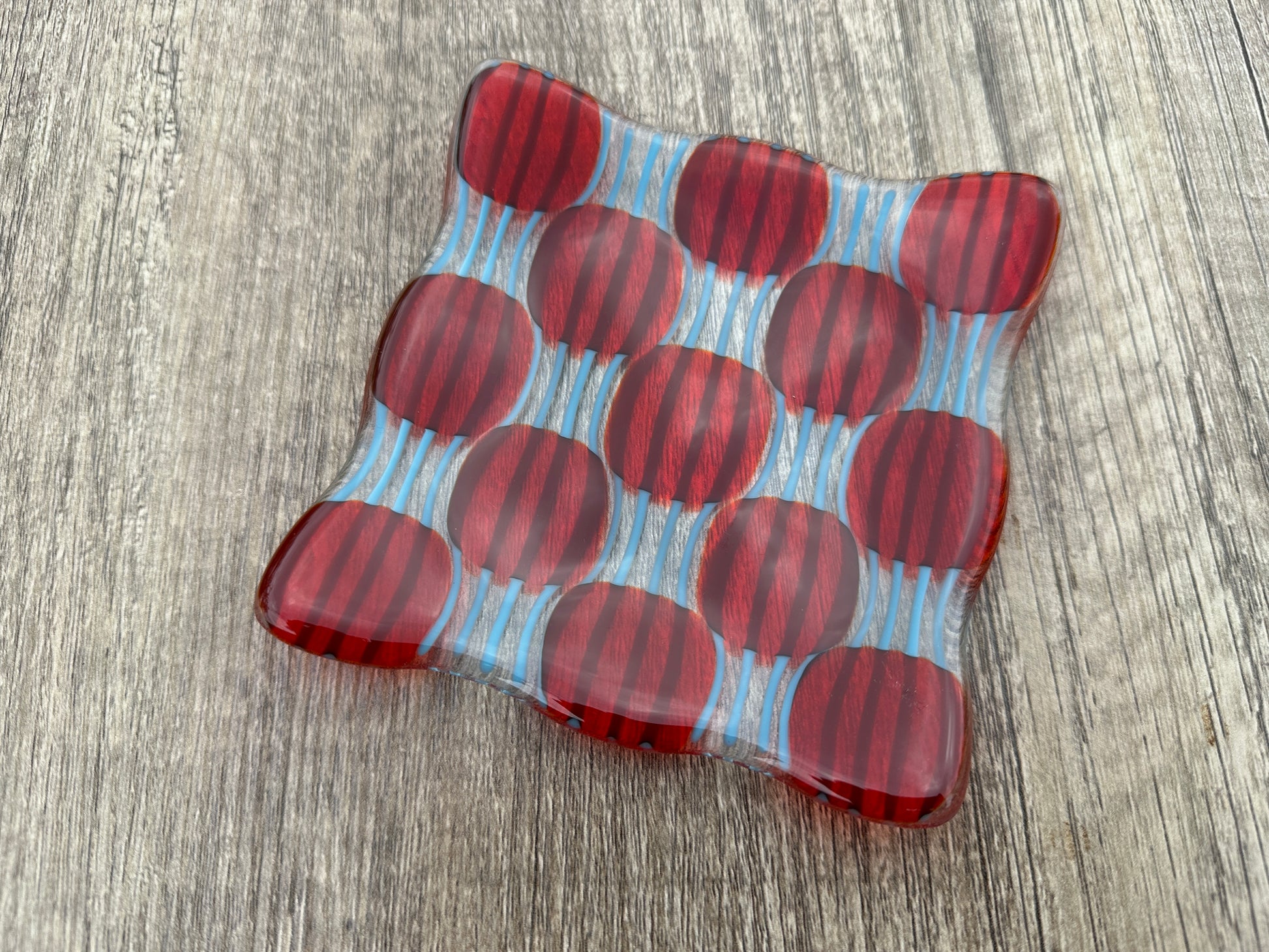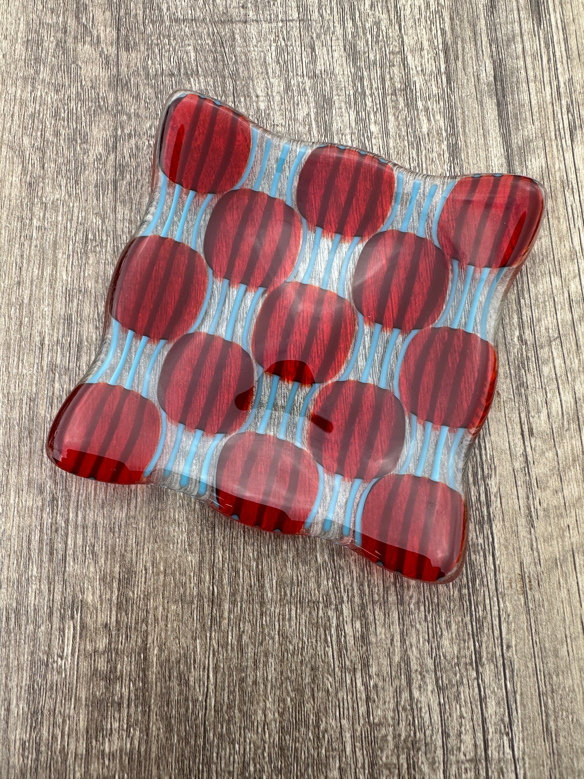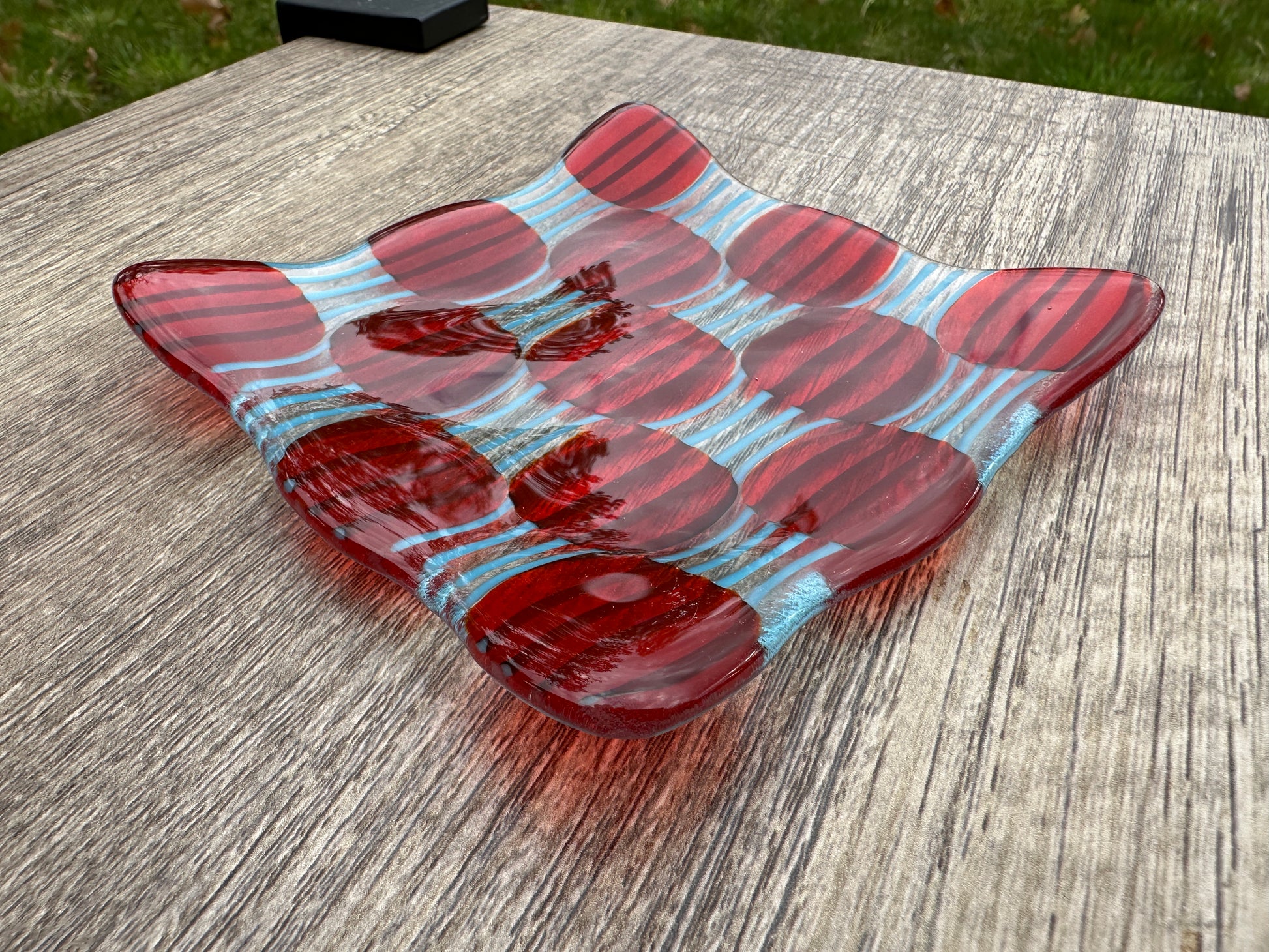 This plate has a flavour of mid-century modern with the lines and bubbles, but also a fun element playing on the optical bends to the lines by the placement of the glass pieces, just like raindrops! The plate is made with a single piece of clear glass to which lines of coloured stringers are added. Then squares of coloured transparent glass are laid on top of the stringers in an alternating pattern that give the light-bending, raindrop effect.