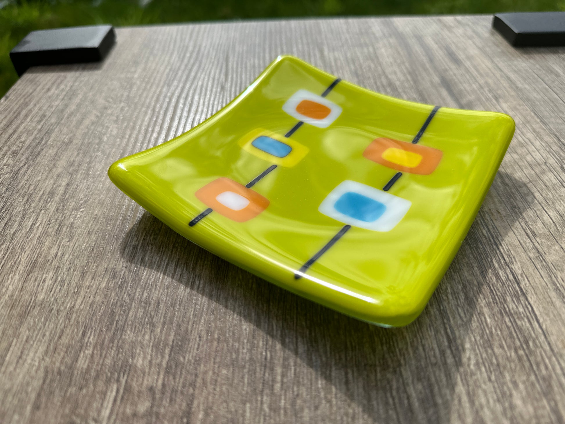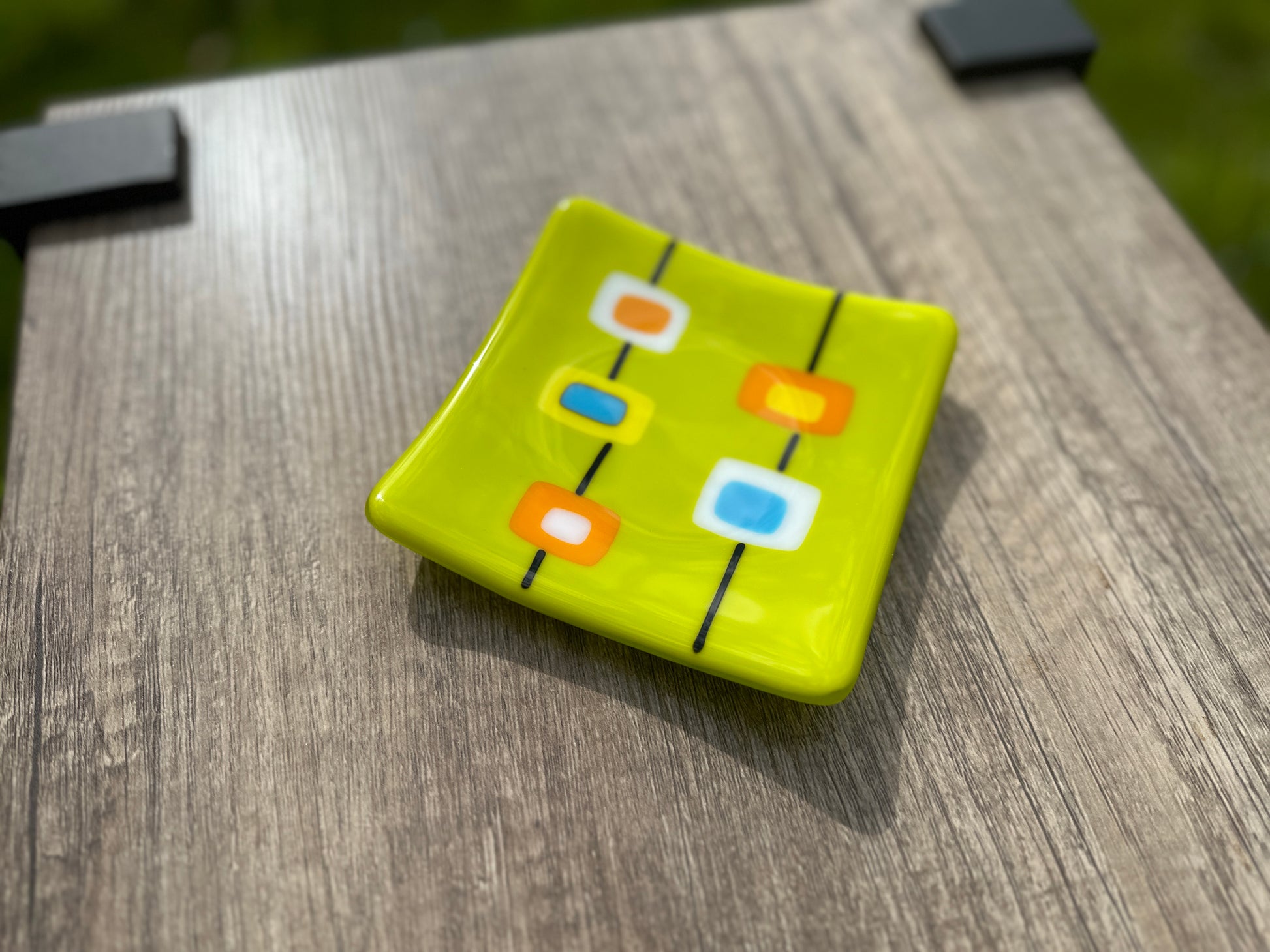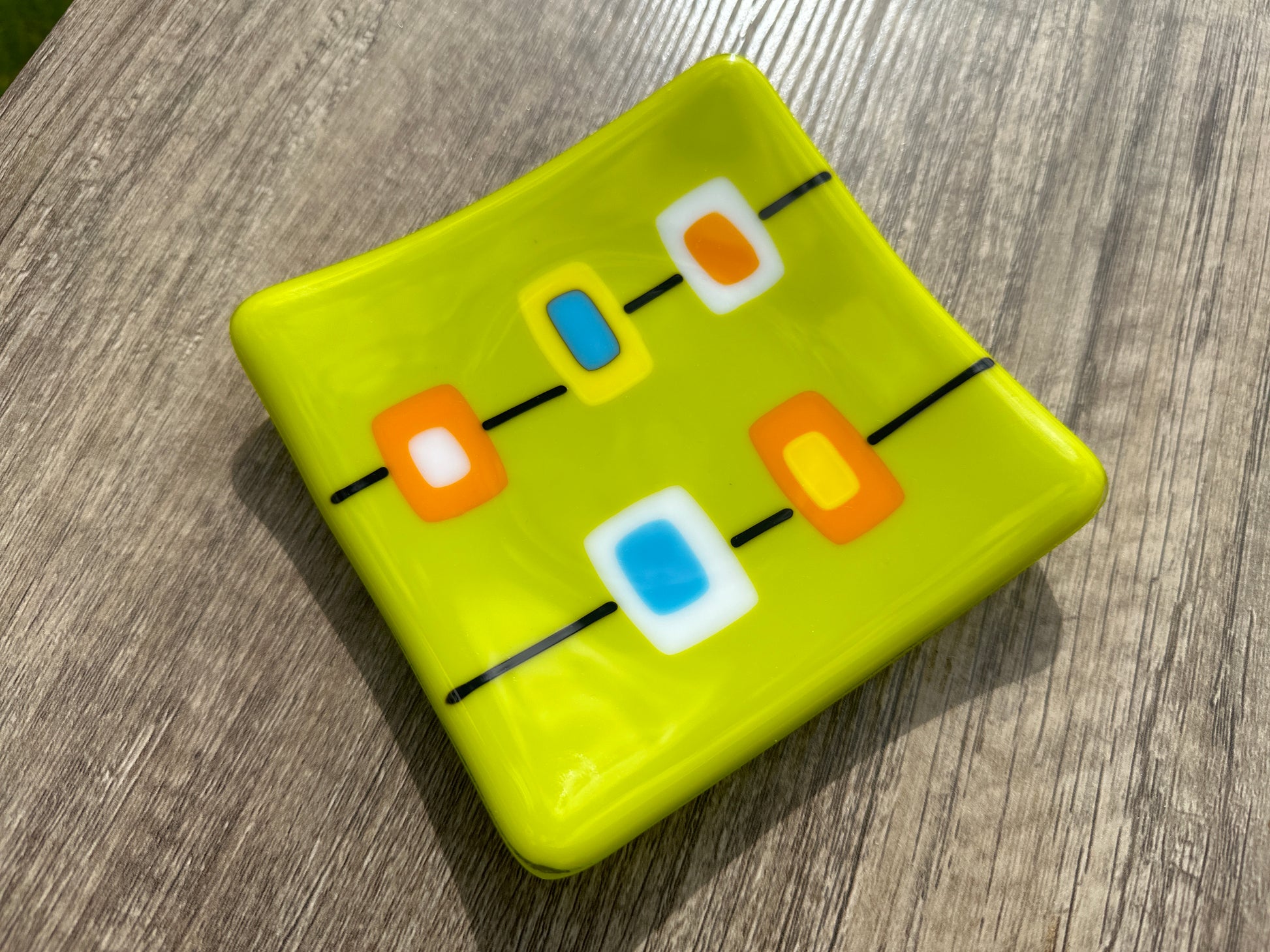 Each plate is made from individually hand-cut pieces of glass that are layered on a single base piece of glass. Fine strands of glass are used to connect the pieces in a linear design. The arrangement of the pieces and the colors can vary from plate-to-plate, making each one unique. The pictures show representations of the designs.