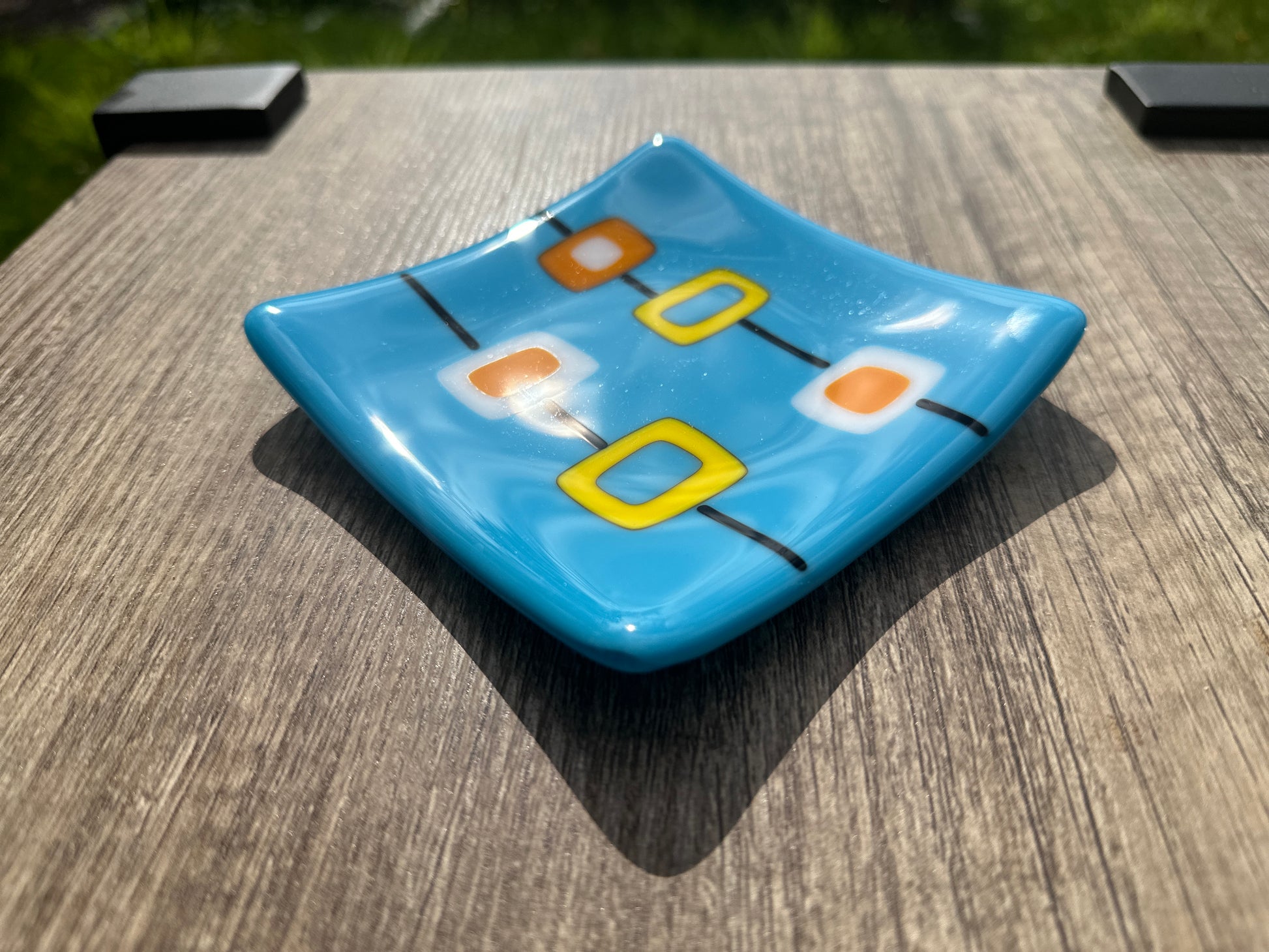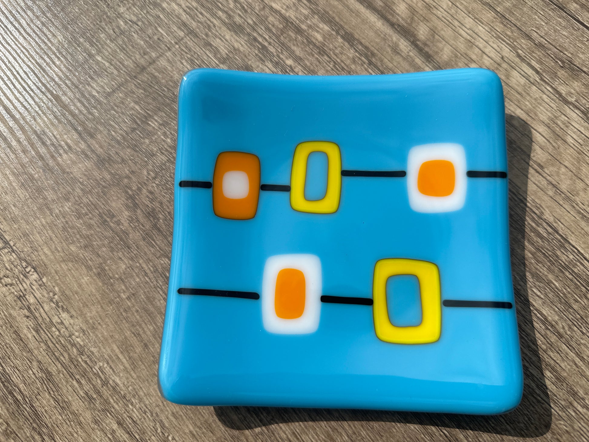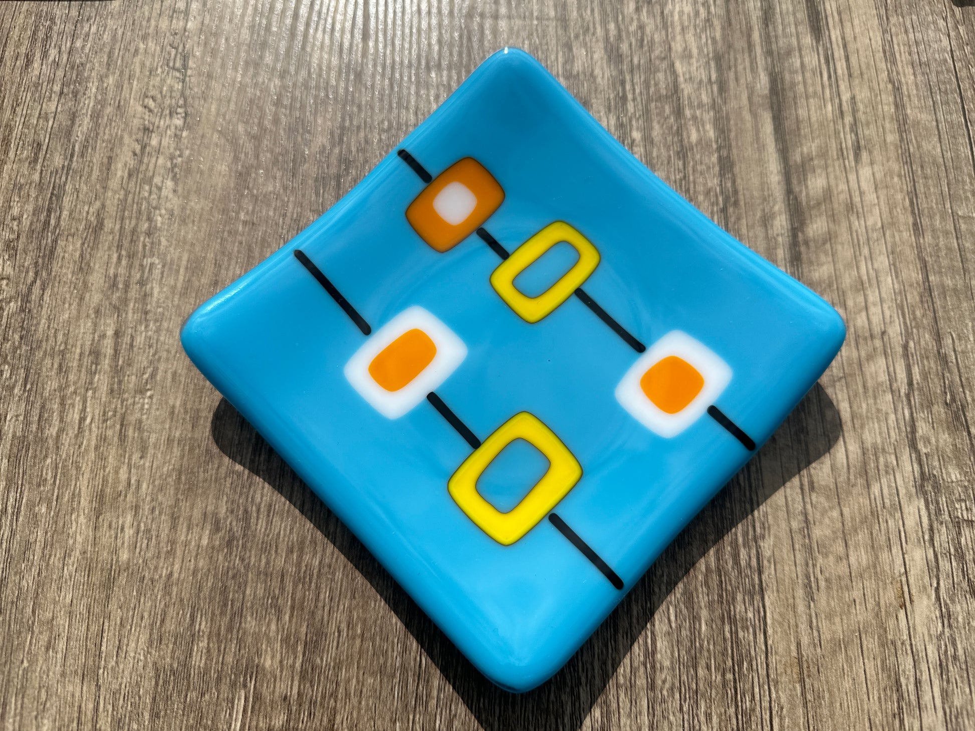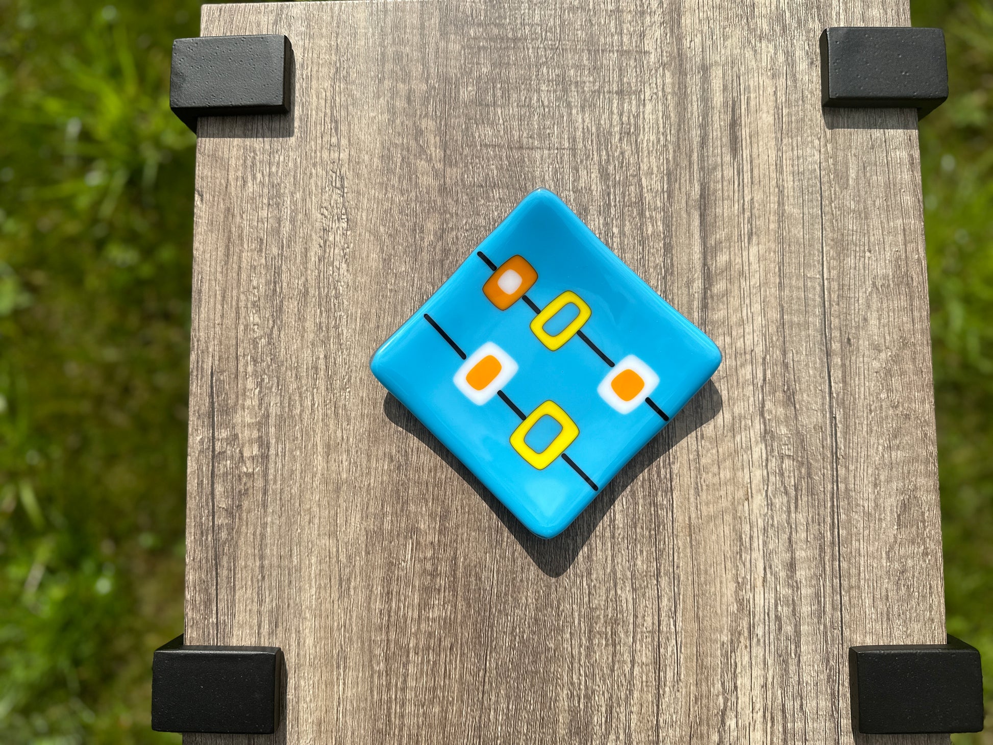 Each plate is made from individually hand-cut pieces of glass that are layered on a single base piece of glass. Fine strands of glass are used to connect the pieces in a linear design. The arrangement of the pieces and the colors can vary from plate-to-plate, making each one unique. The pictures show representations of the designs.