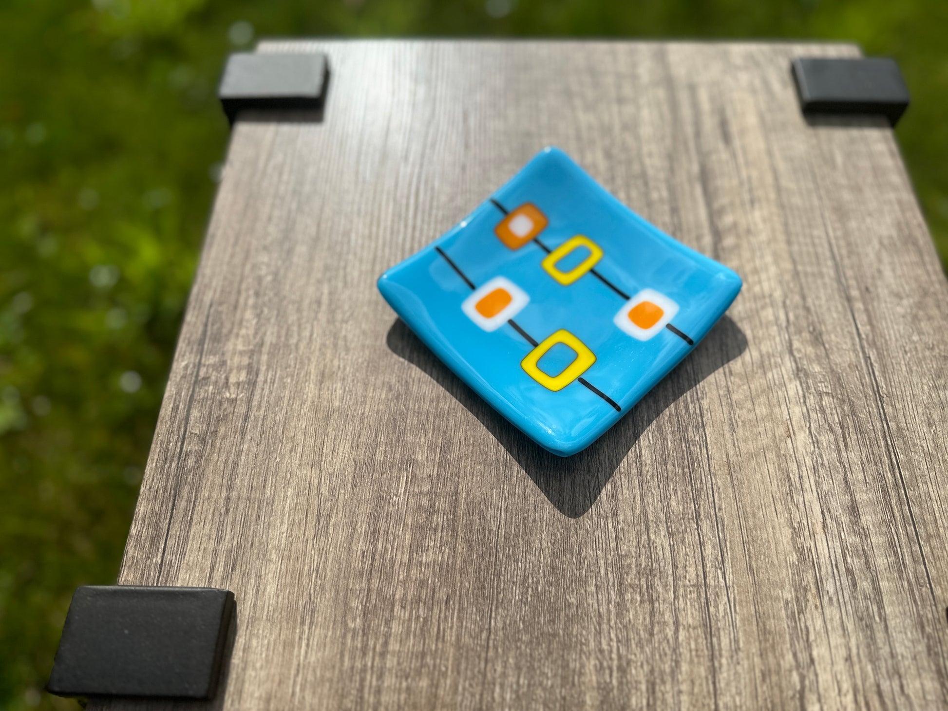 The Tahquitz plate celebrates the fun of midcentury modernism by reflecting the more graphic trends of this period incorporating squares and rectangular shapes connected by lines. The colors in this collection are taken from the desert but with a nod to the past, and include orange, lemongrass, and turquoise blue. The bright colors and graphical layout bring to life midcentury design, Palm Springs style!