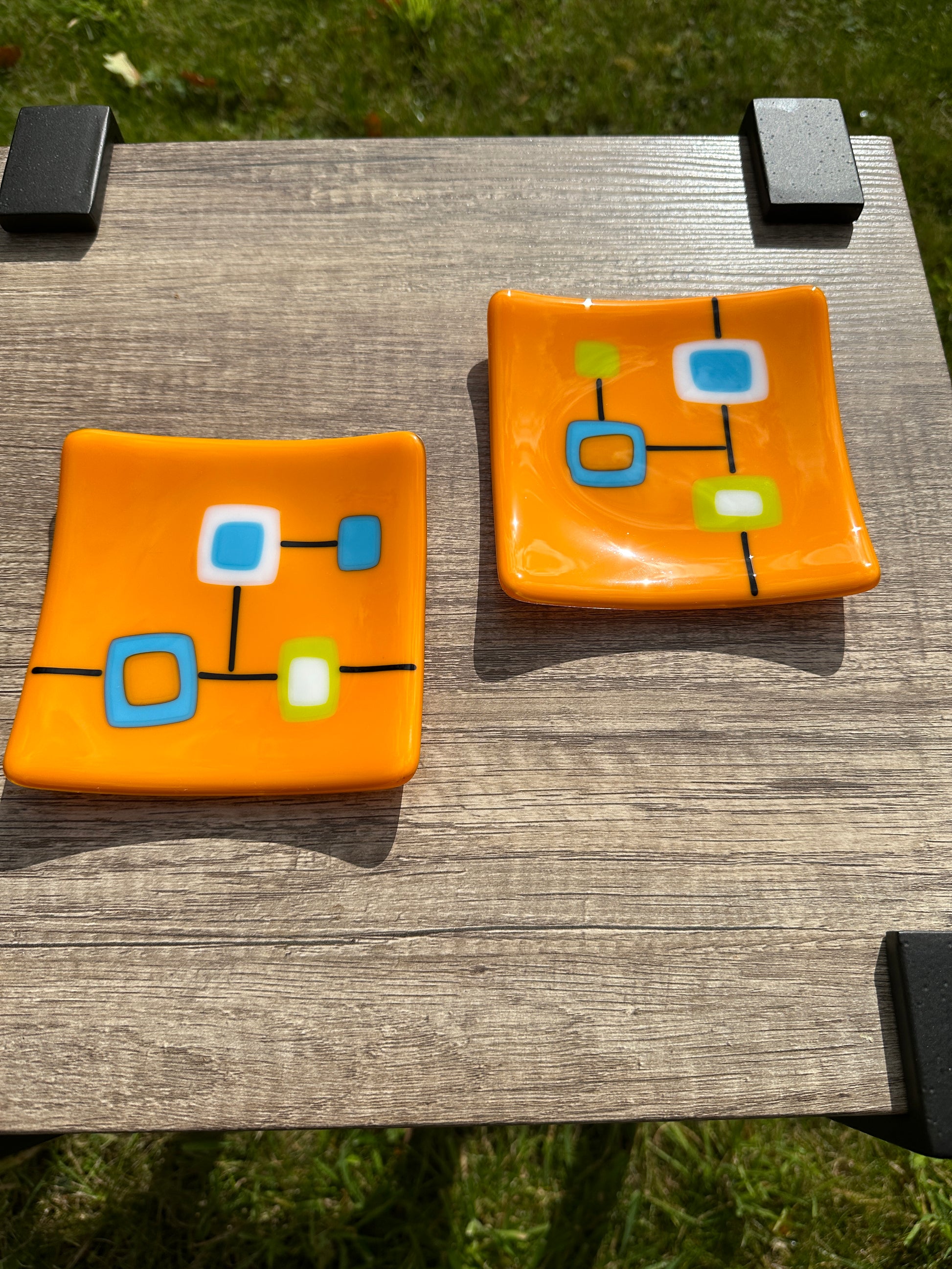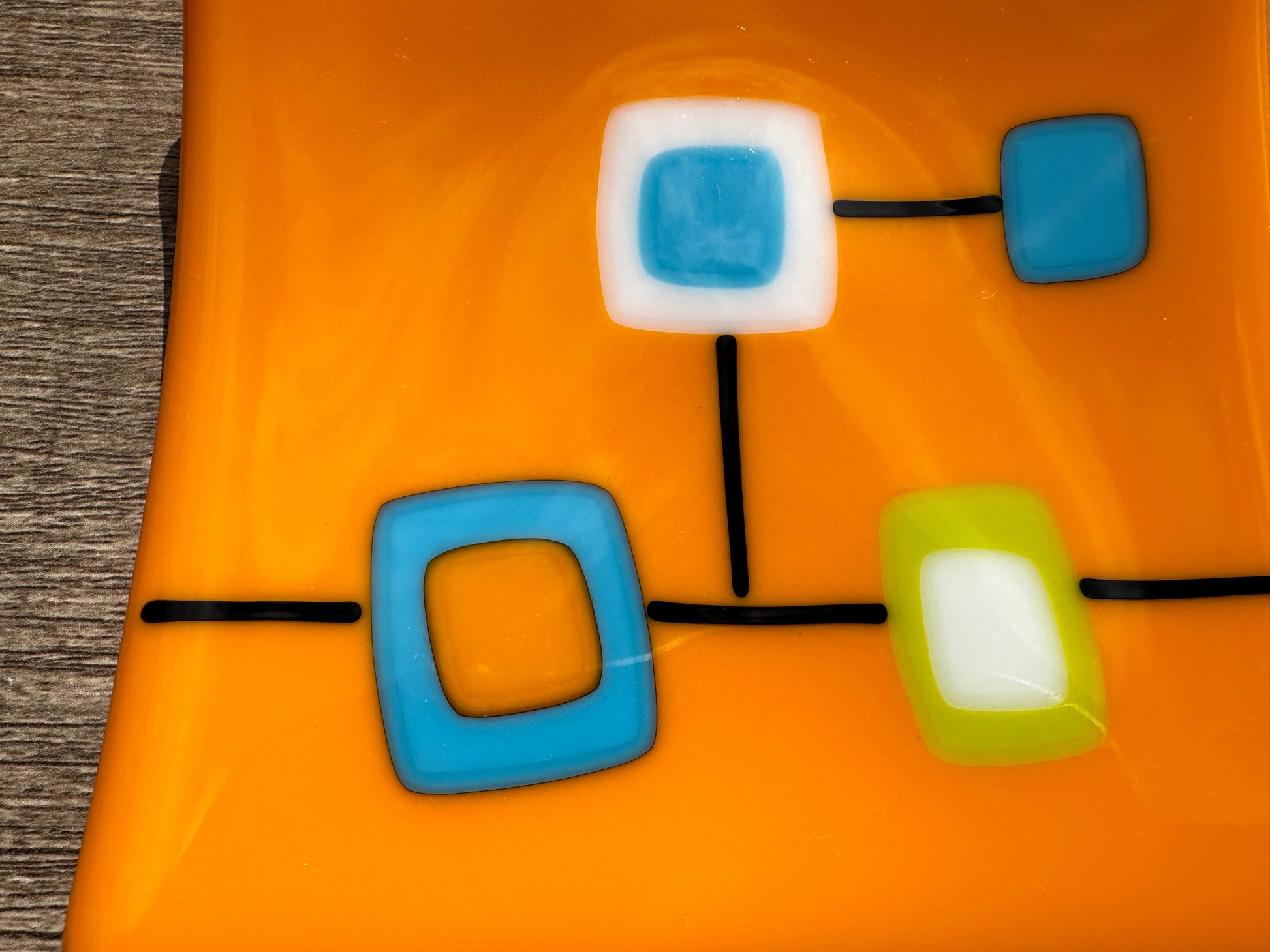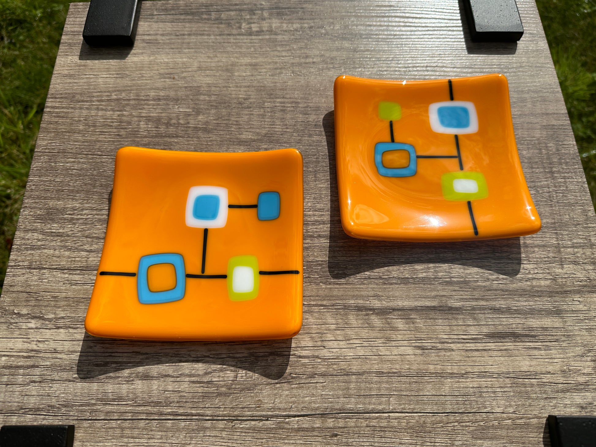 Each plate is made from individually hand-cut pieces of glass that are layered on a single base piece of glass. Fine strands of glass are used to connect the pieces in a linear design. The arrangement of the pieces and the colors can vary from plate-to-plate, making each one unique. The pictures show representations of the designs.