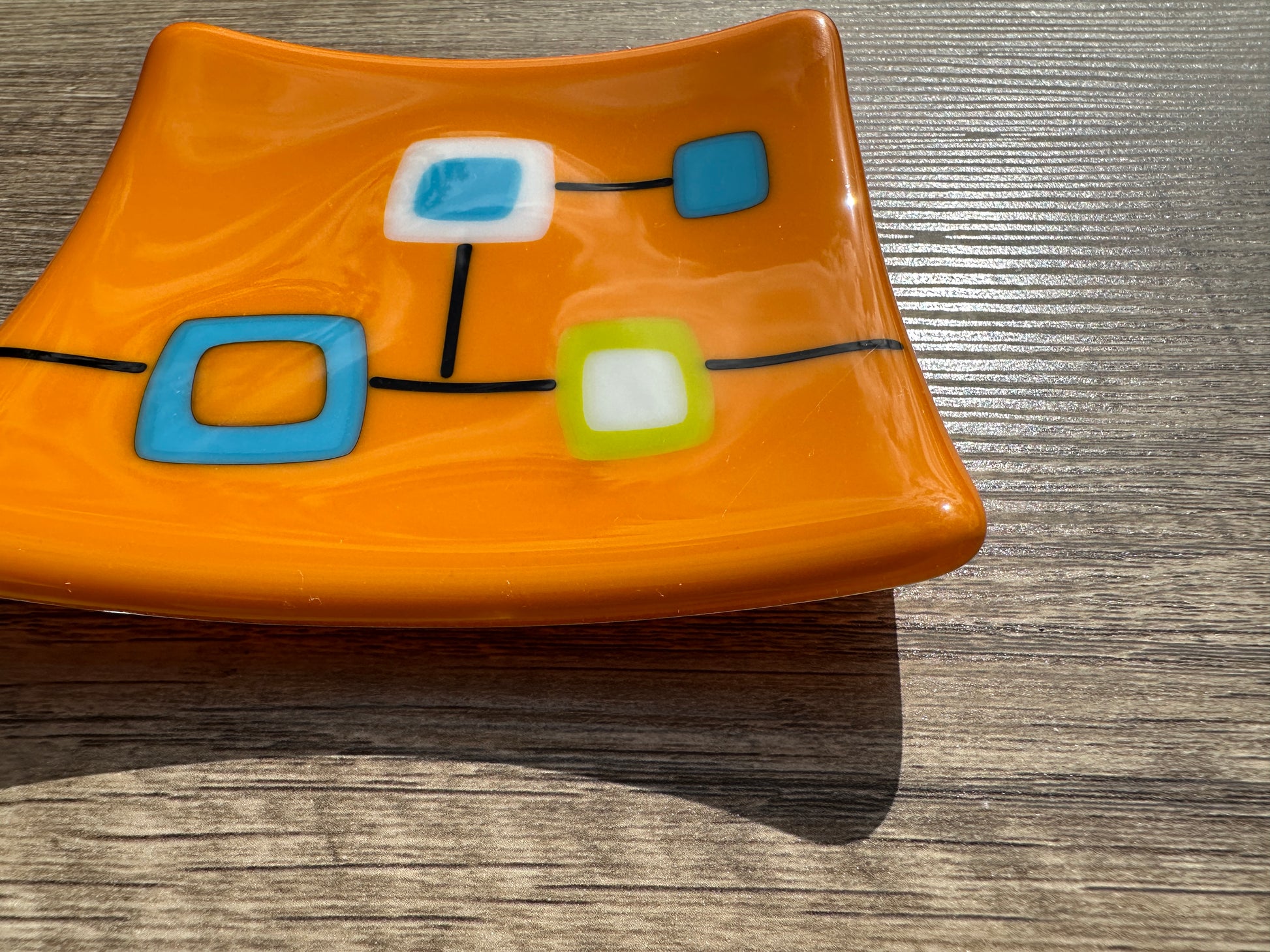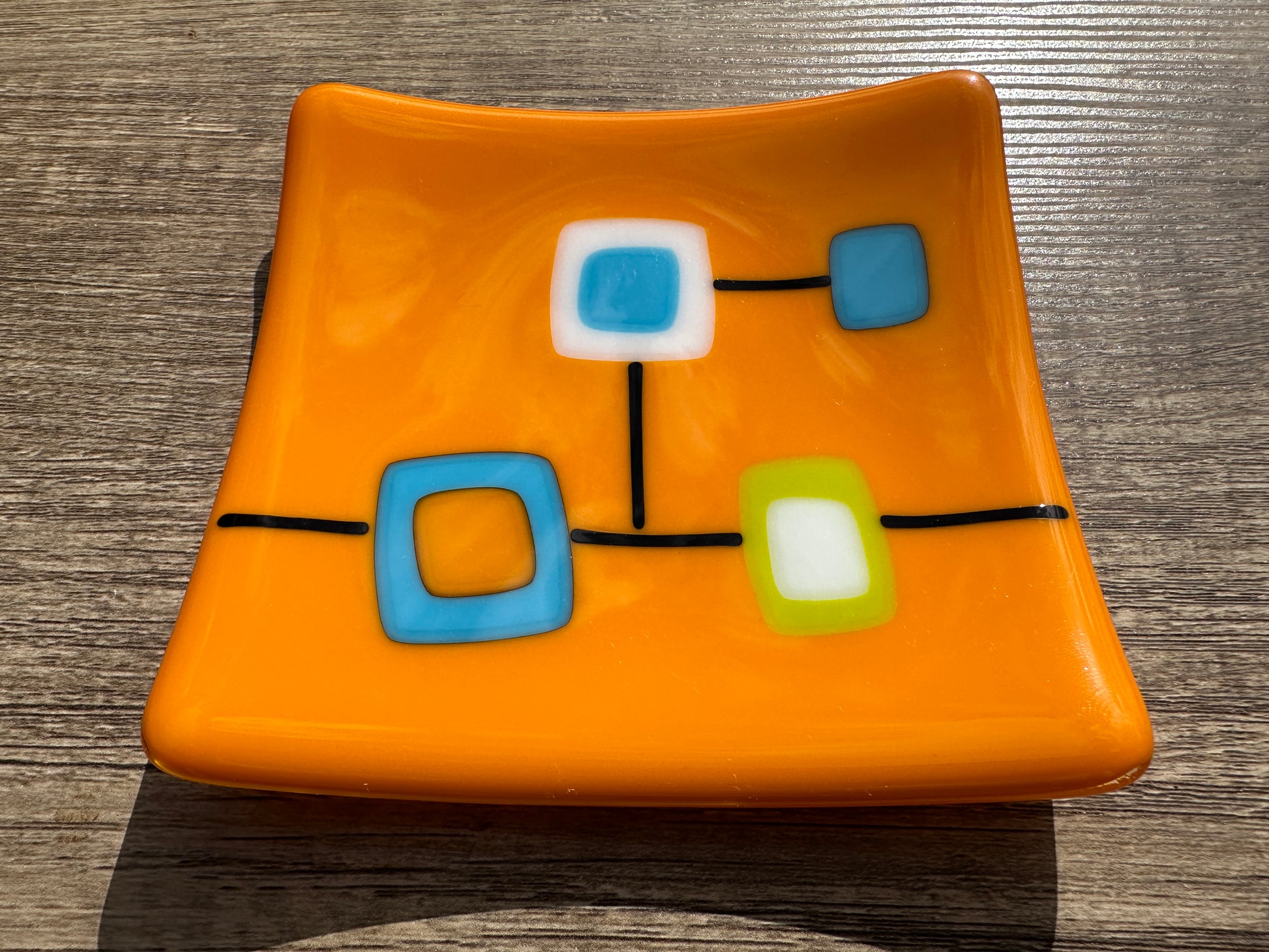 The assembled glass pieces are then kiln-fused up to a temperature of 1450F to create a single piece of glass. Once cool, the piece is then placed on a mold and in the kiln for a second time up to a temperature of 1225F that softens the glass to the shape of the mold. The entire process can take up to 72 hours.